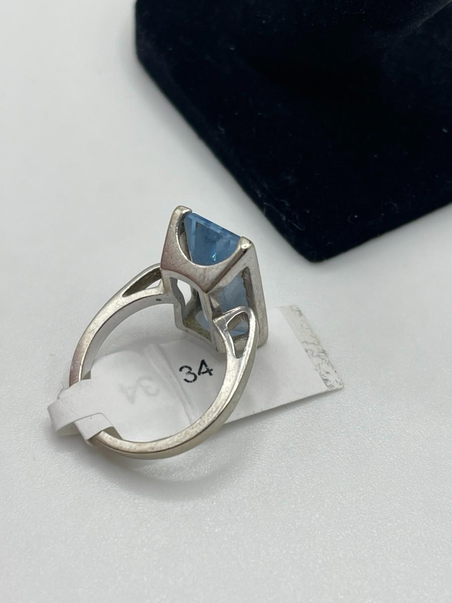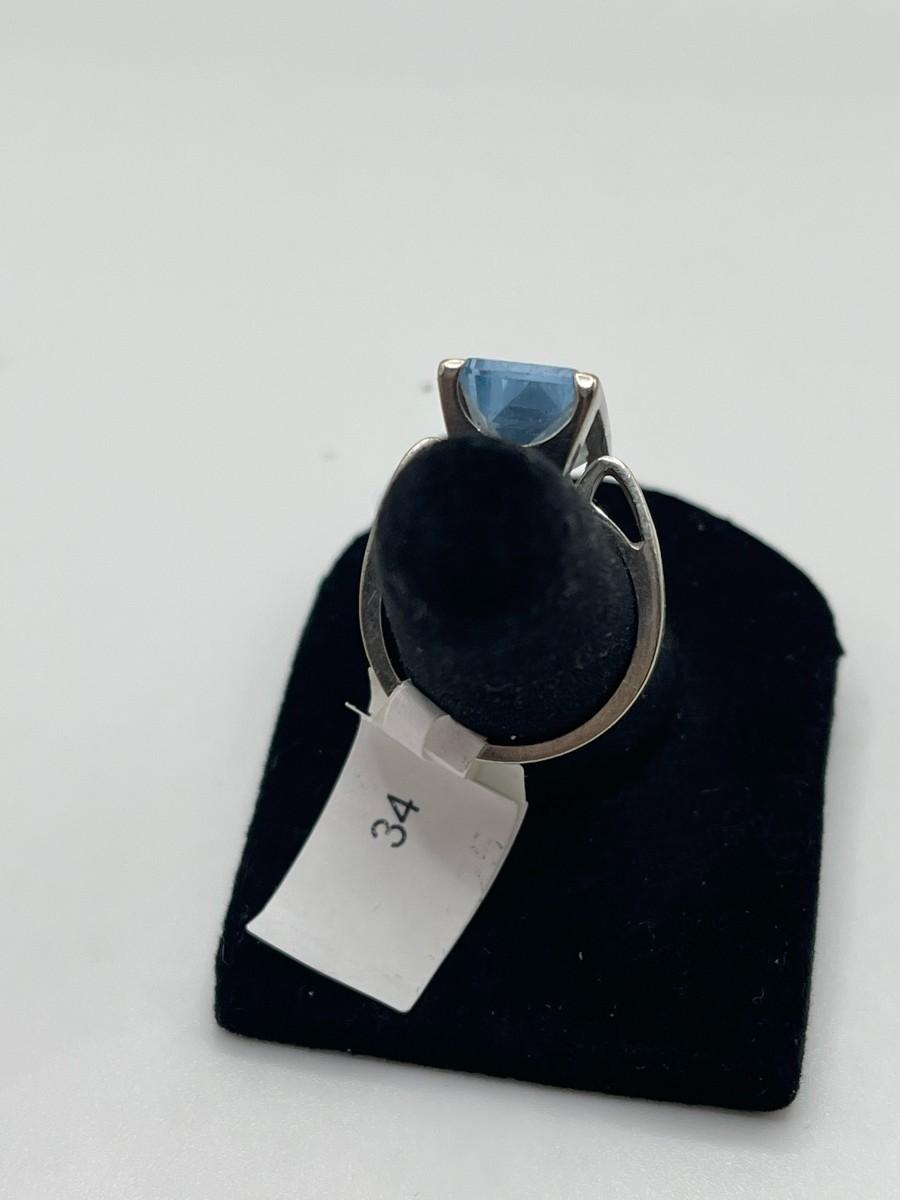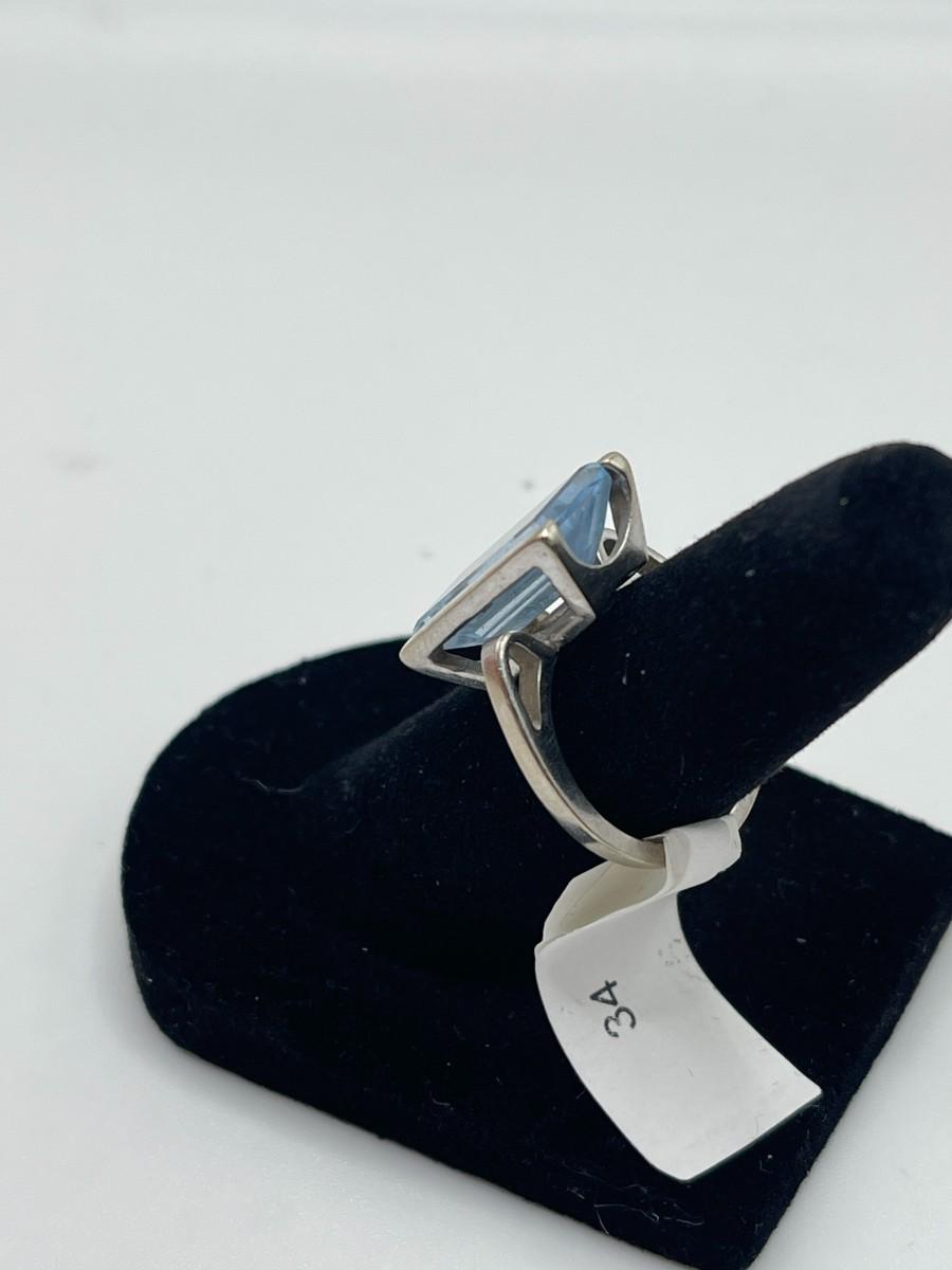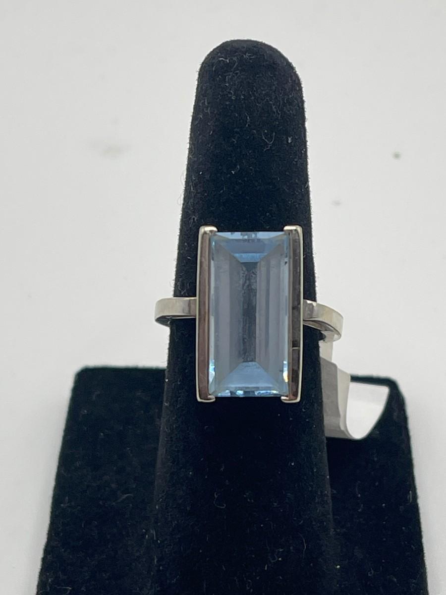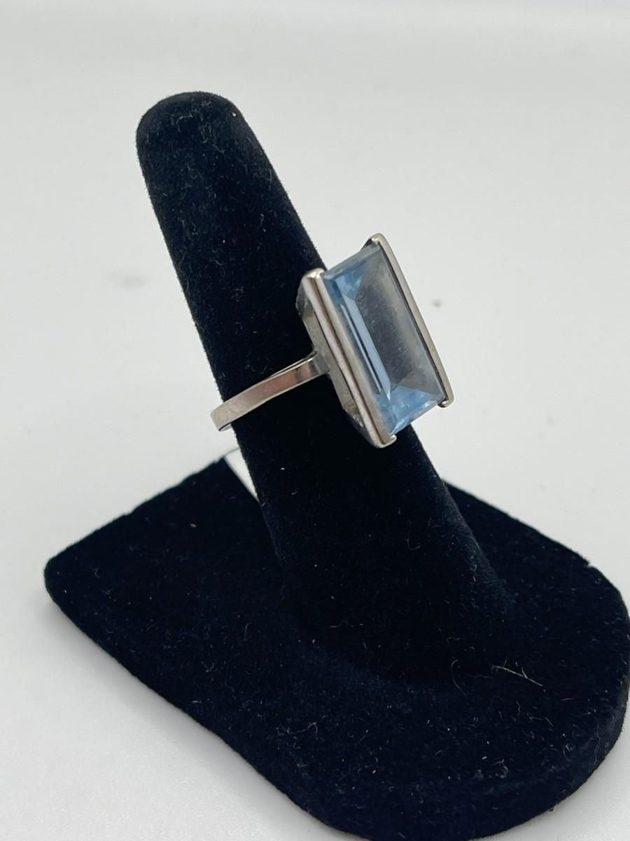 14K white gold ring set with rectangular blue topaz. Size 5. Shank is bent, condition is fair.