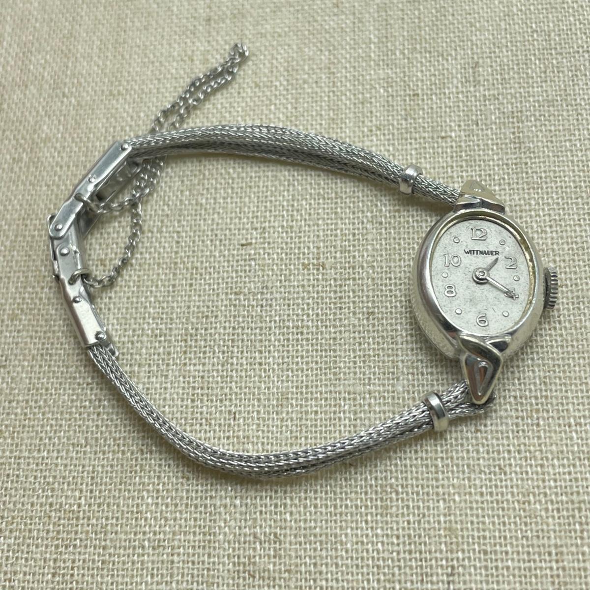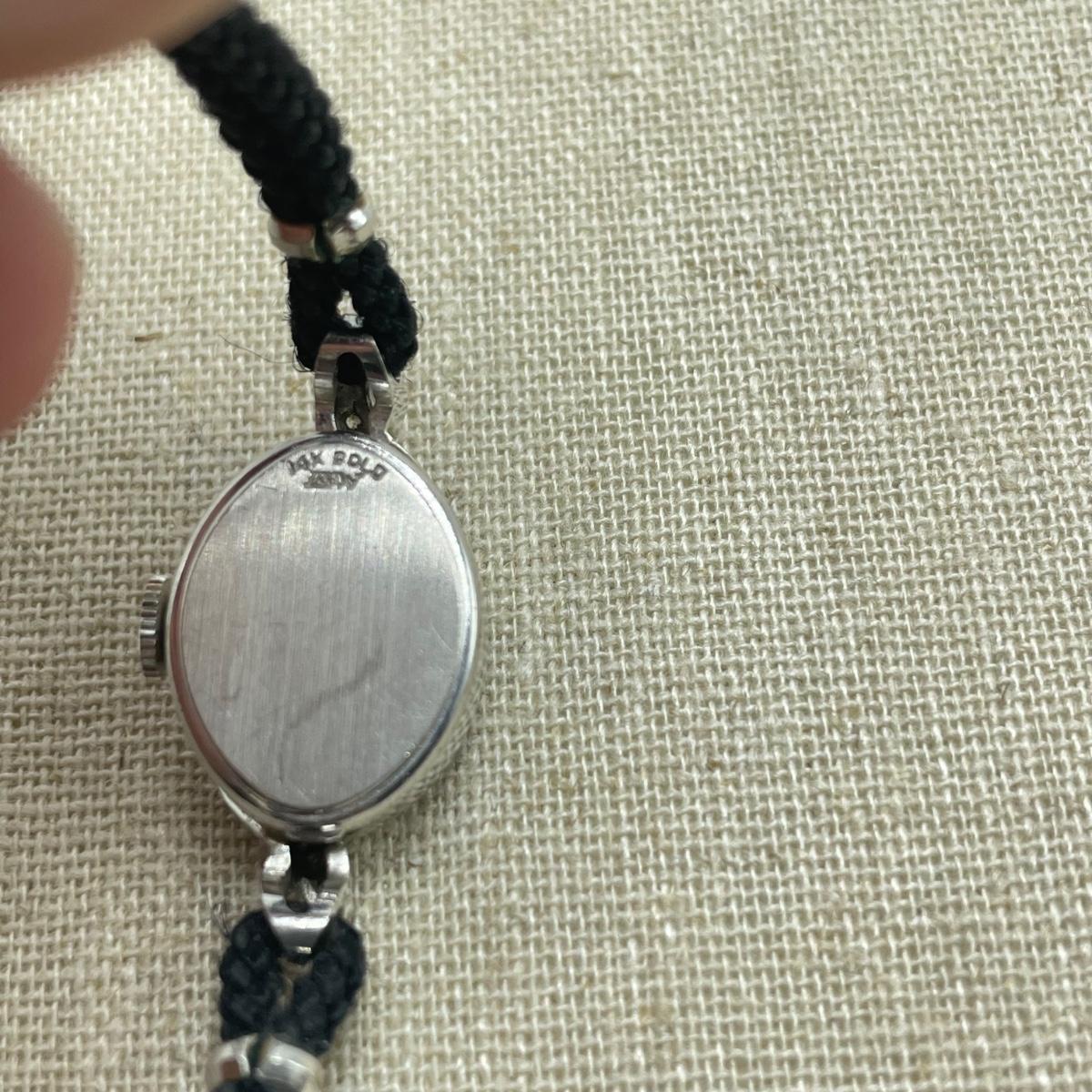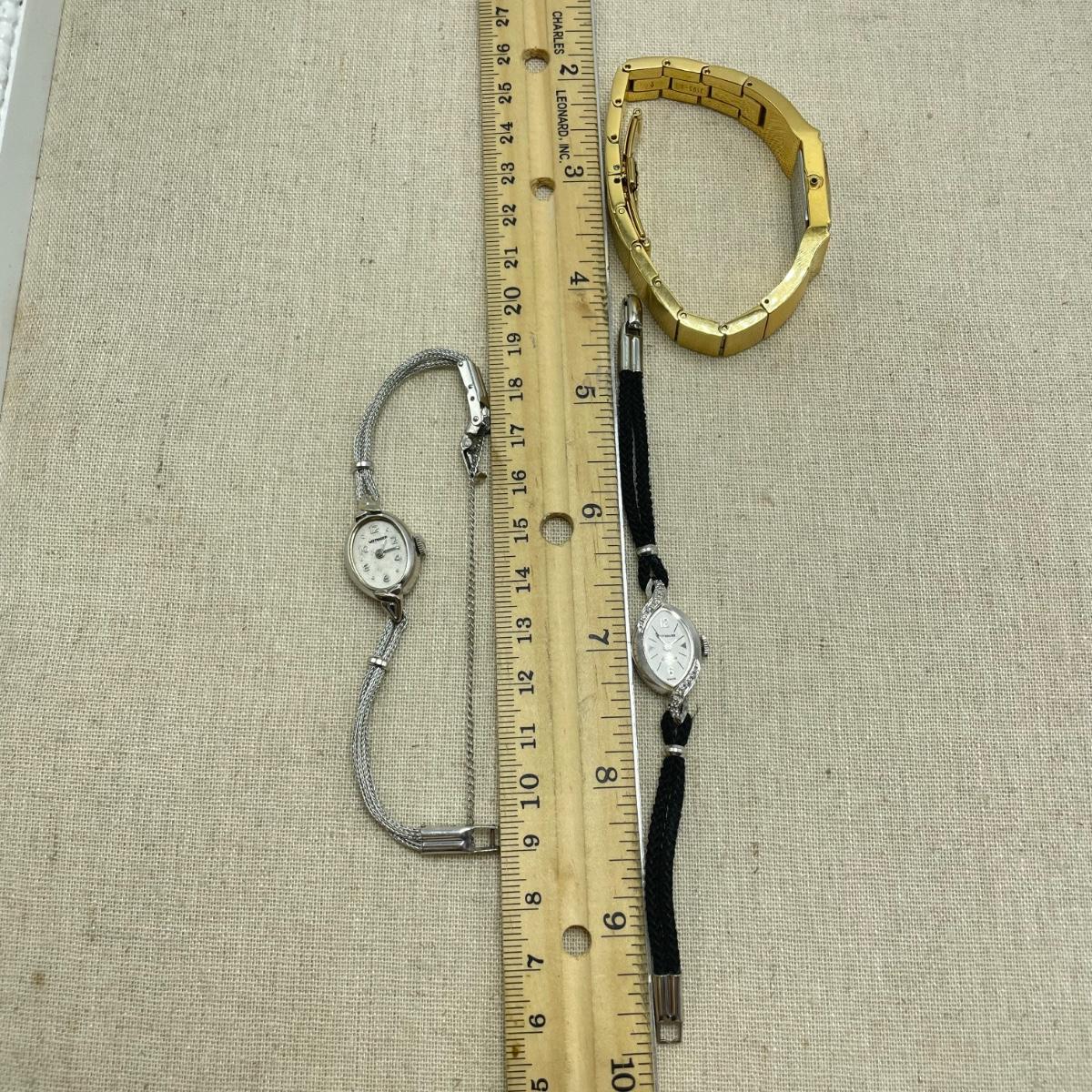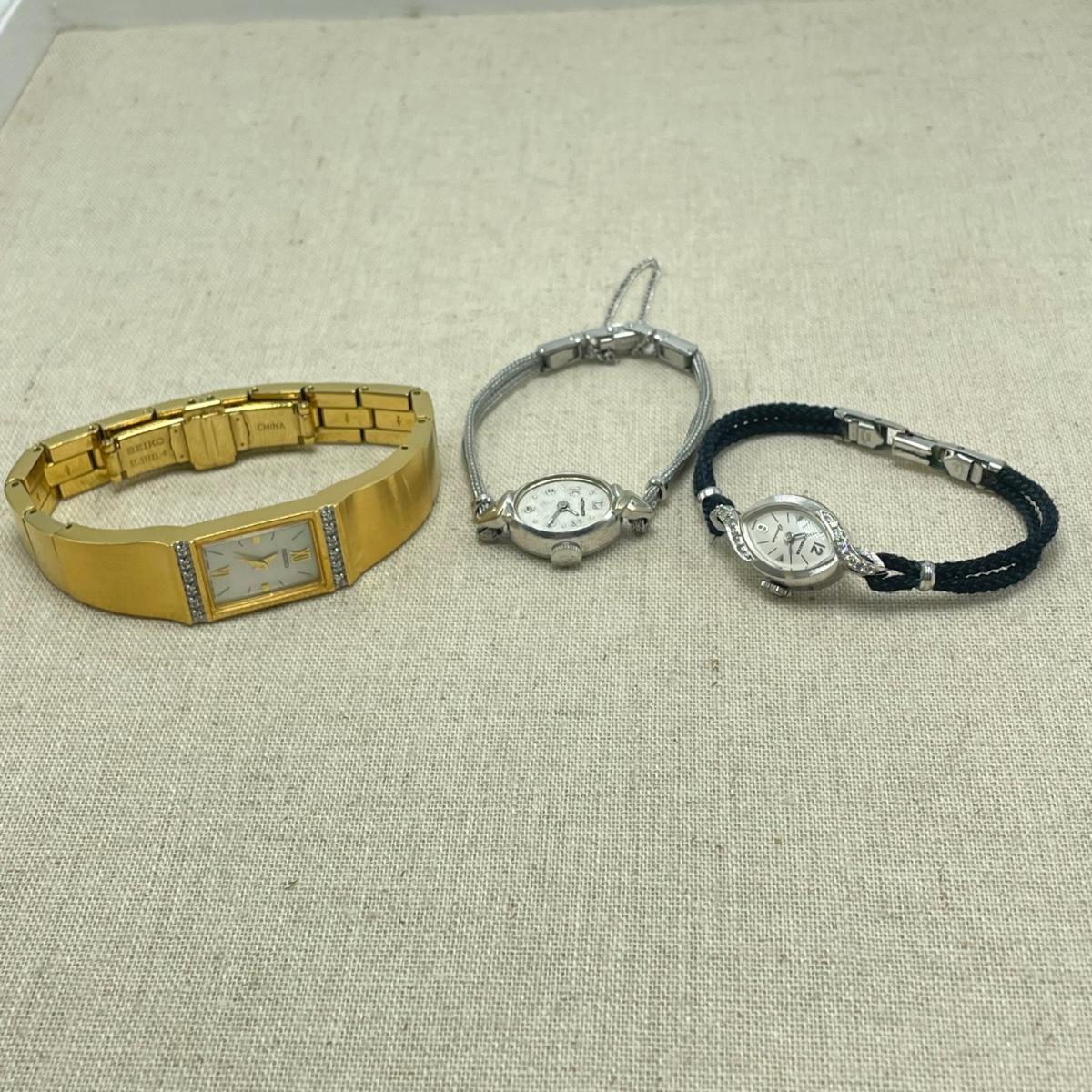 Three ladies watches including a stainless steel Seiko watch with gemstones that tested as moissanites on our diamond tester, and two Wittnauer watches. The Wittnauer watch with silver tone wristband is missing its face cover. The other Wittnauer is marked 14K, it has a black roped band with its clasps marked 1/20 10K. The Wittnauers appear to be approximately 5.5”, the Seiko is a bit larger. See images for all markings. We cannot guarantee the authenticity of any gemstone. All sales are final. No returns or refunds. Please bid accordingly.