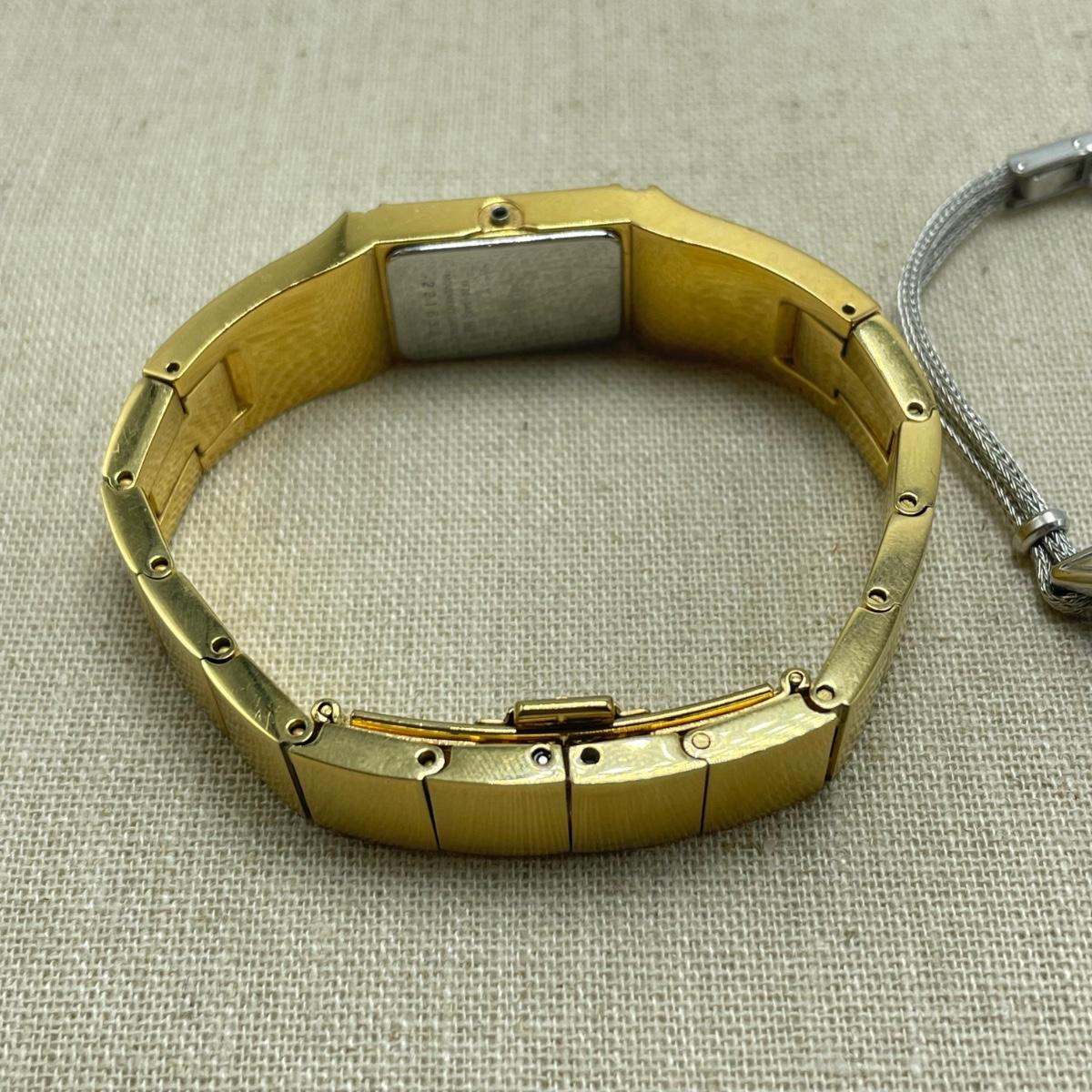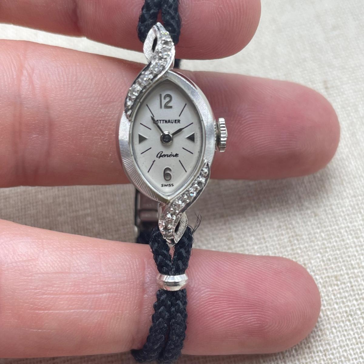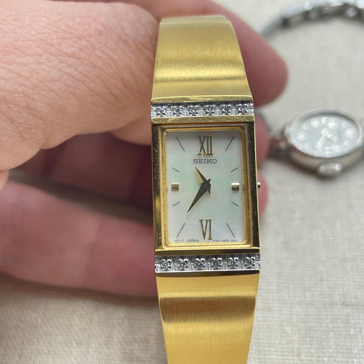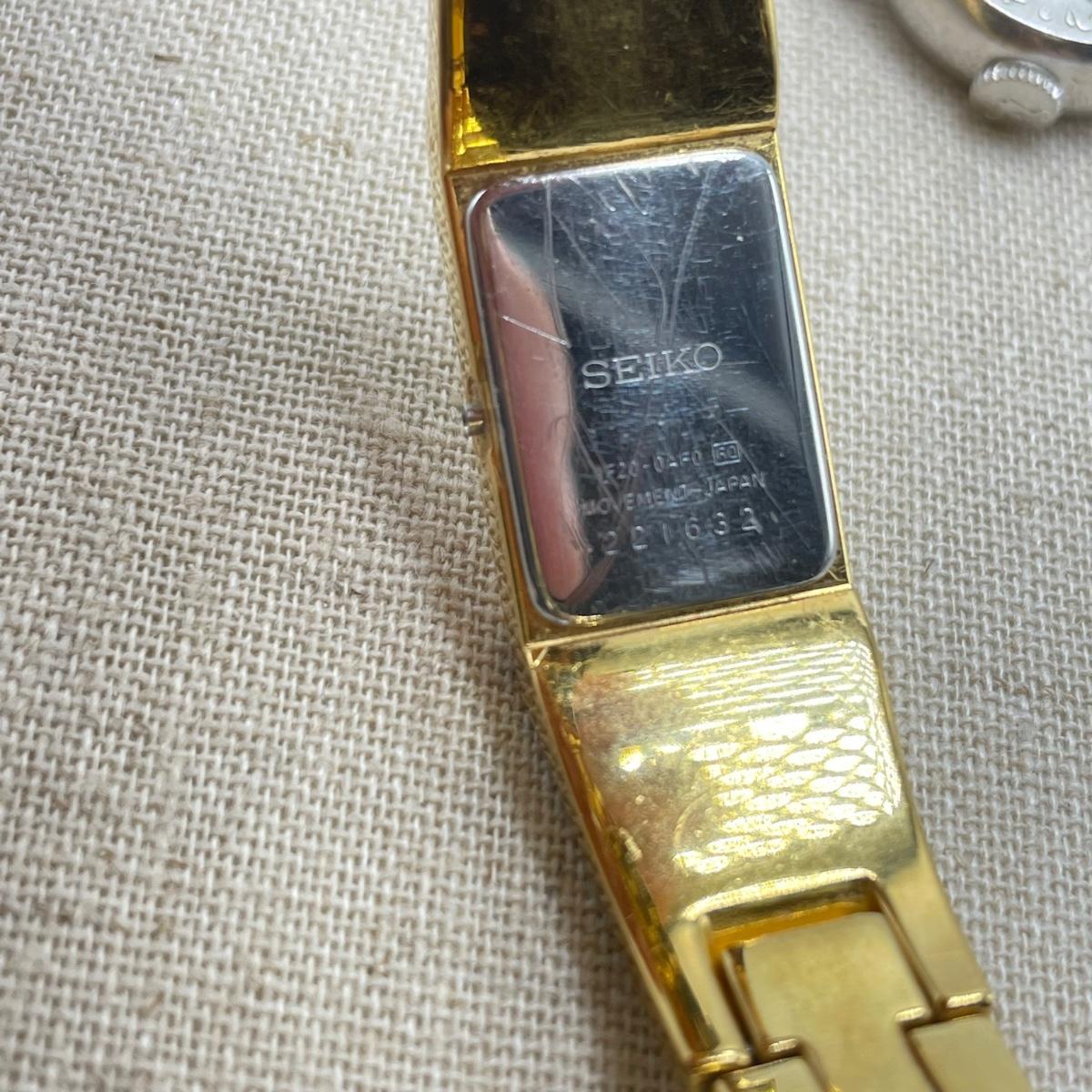 Three ladies watches including a stainless steel Seiko watch with gemstones that tested as moissanites on our diamond tester, and two Wittnauer watches. The Wittnauer watch with silver tone wristband is missing its face cover. The other Wittnauer is marked 14K, it has a black roped band with its clasps marked 1/20 10K. The Wittnauers appear to be approximately 5.5”, the Seiko is a bit larger. See images for all markings. We cannot guarantee the authenticity of any gemstone. All sales are final. No returns or refunds. Please bid accordingly.