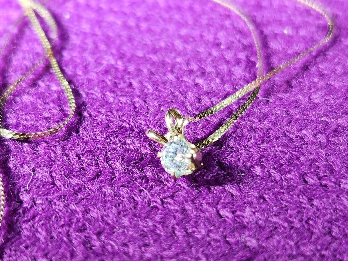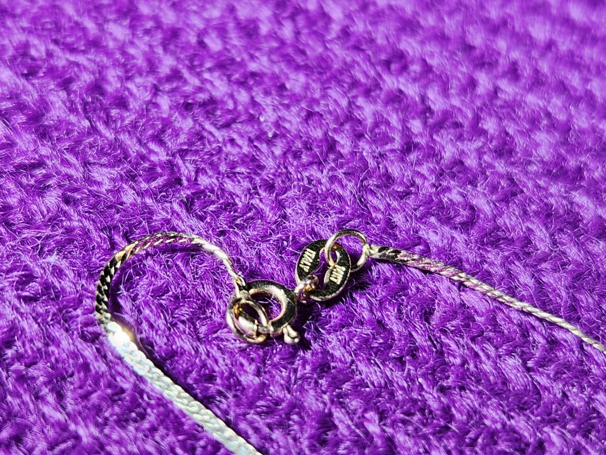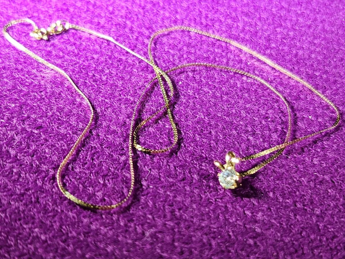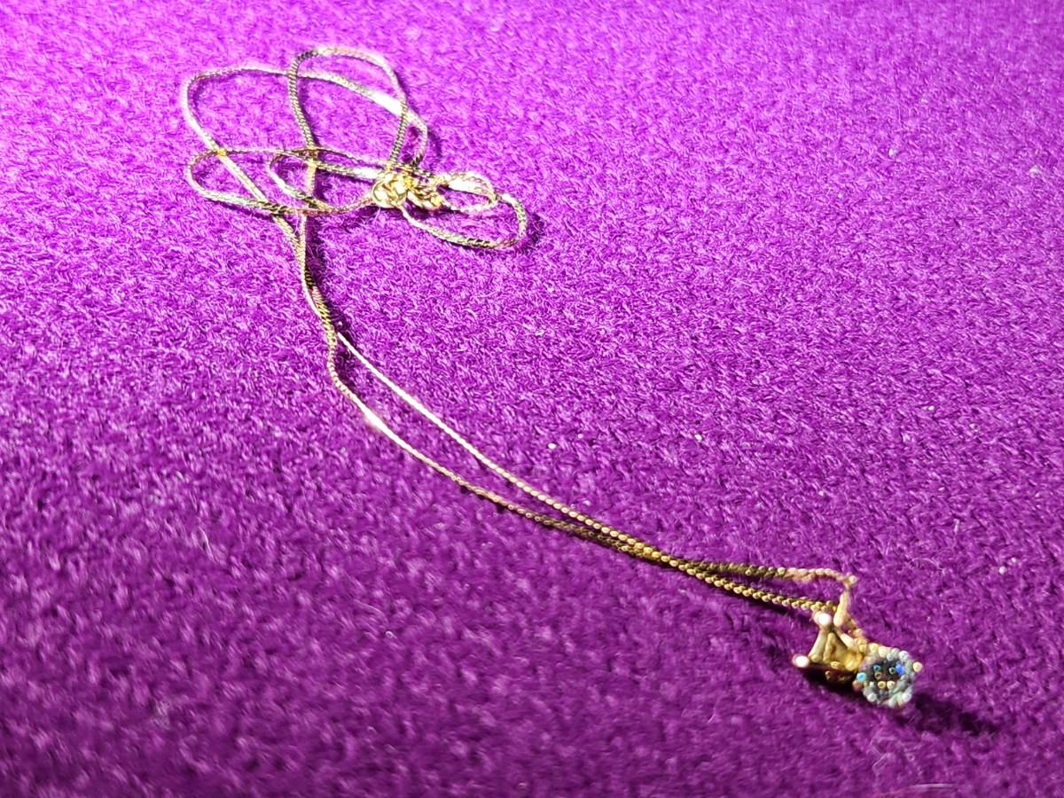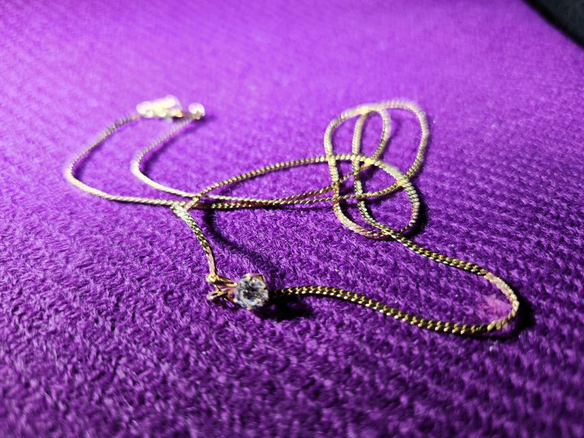 This auction lot is for a 14K Woven Gold Chain w/Costume Pendant. The costume gem is installed in a 14KGF mount. The necklace weighs about .028ozt without the gem pendant.