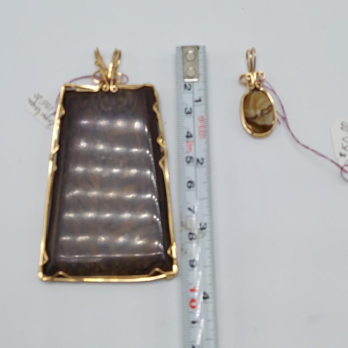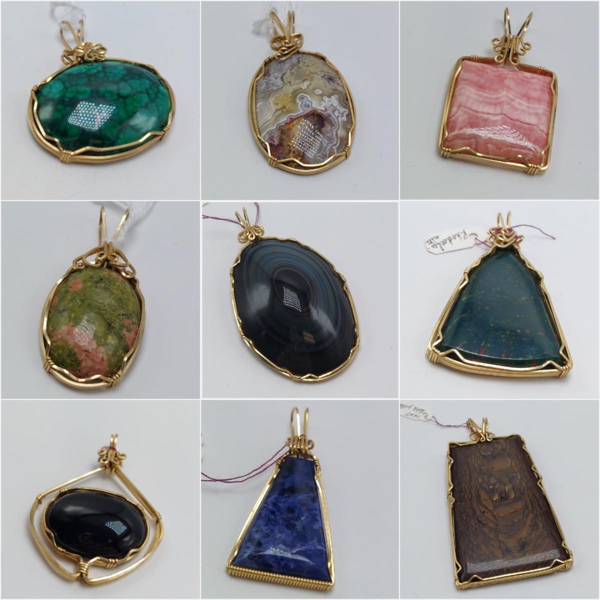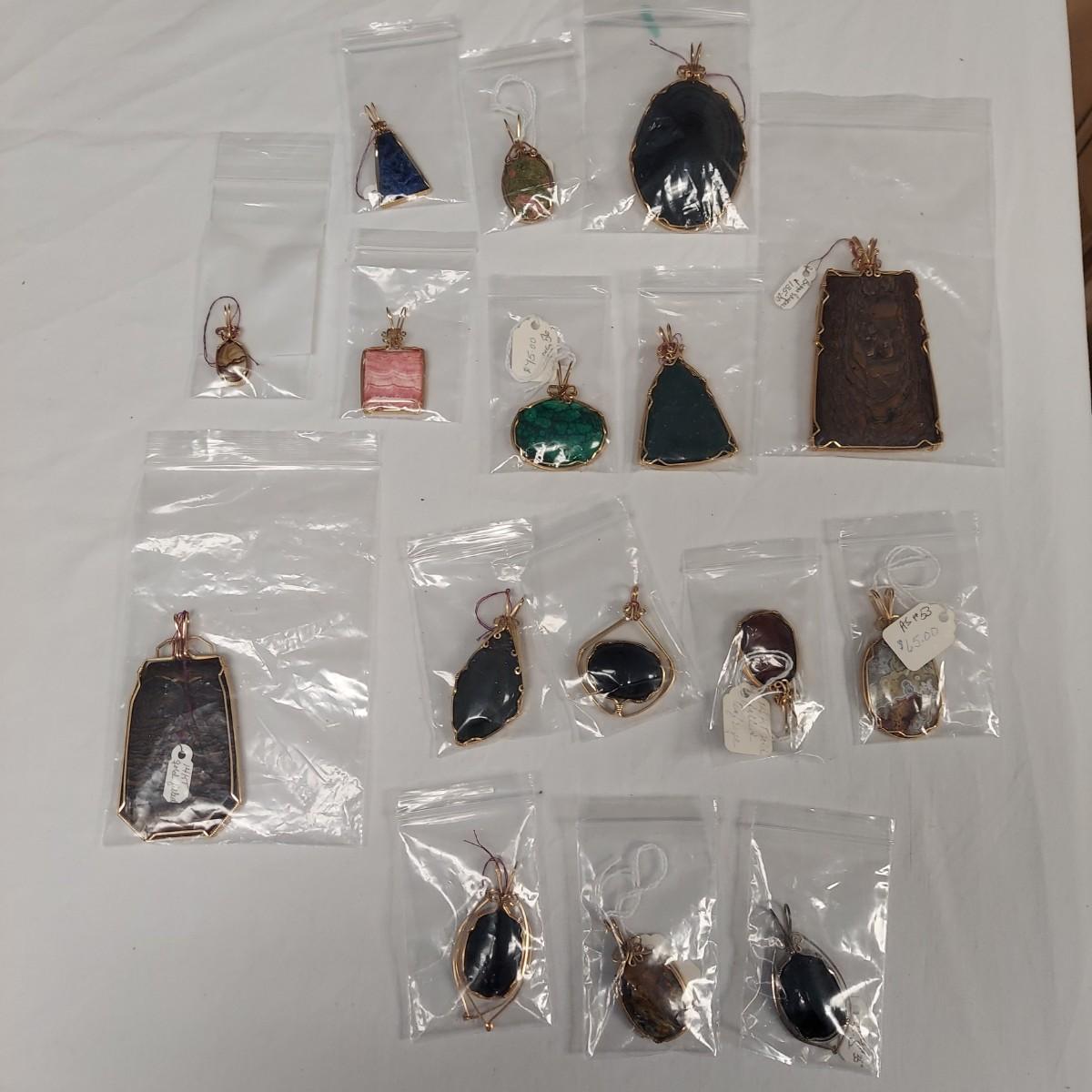 Lot includes 16 large pendants for necklaces. They appear to be handmade. Most are tagged stating the materials, but we cannot confirm any information written on the tags. The wire wrapping appears to be 14k gold filled with stones like Jasper, Agate, Malachite, Sodalite, Unakite, Rhodochrosite, Black Onyx and more. The pendants range from 1.5-3.75” long. Please see photos for details. All sales are final. No returns or refunds. Please bid accordingly. Shipping available