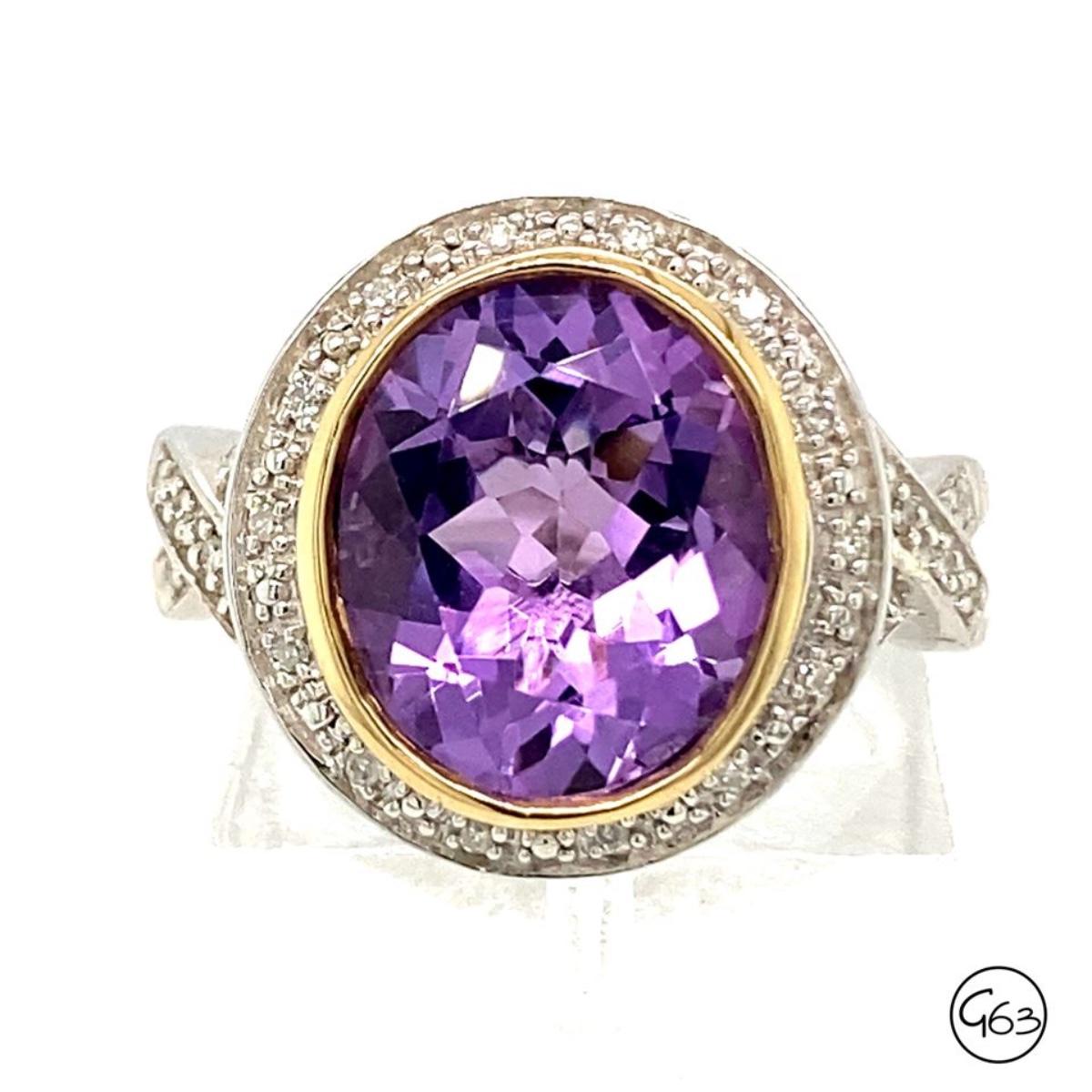 Sterling silver ring with central faceted oval amethyst gemstone (0.10ctw) within a 14K yellow gold bezel. Ring size 7. Stamped 925 14K. Approx. overall weight 6 grams.