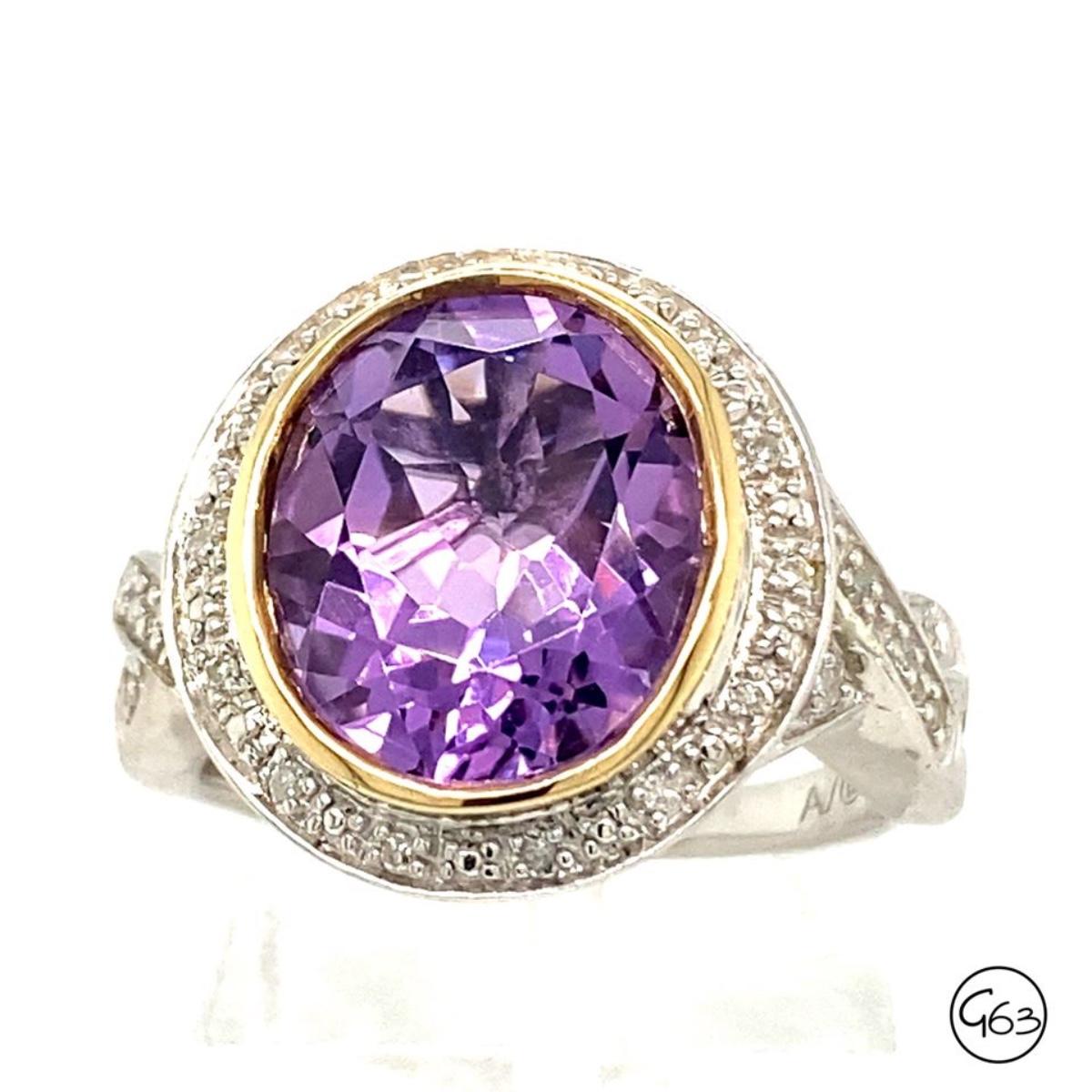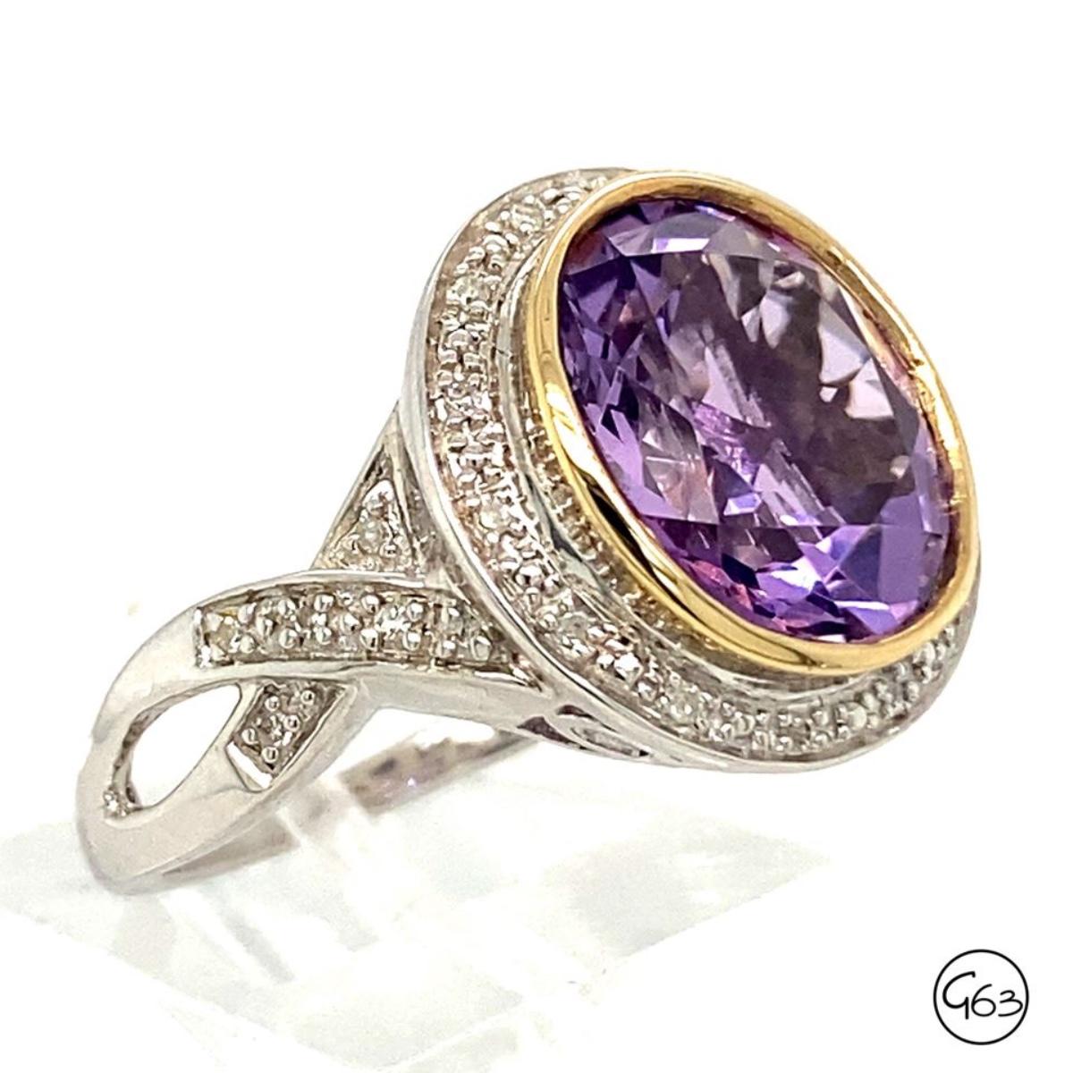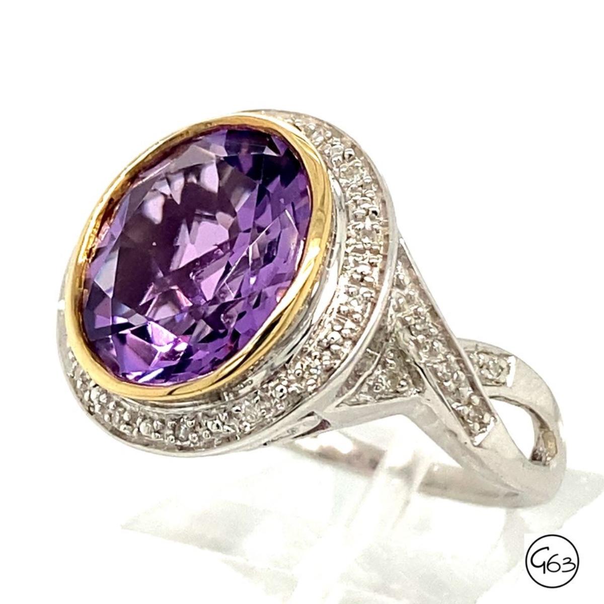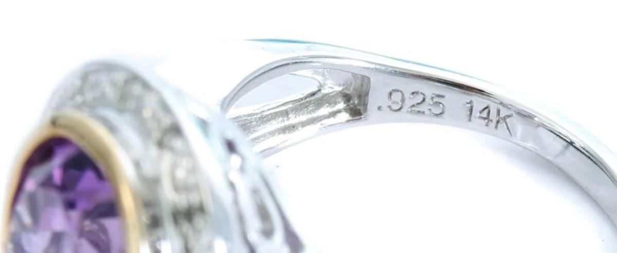 Sterling silver ring with central faceted oval amethyst gemstone (0.10ctw) within a 14K yellow gold bezel. Ring size 7. Stamped 925 14K. Approx. overall weight 6 grams.