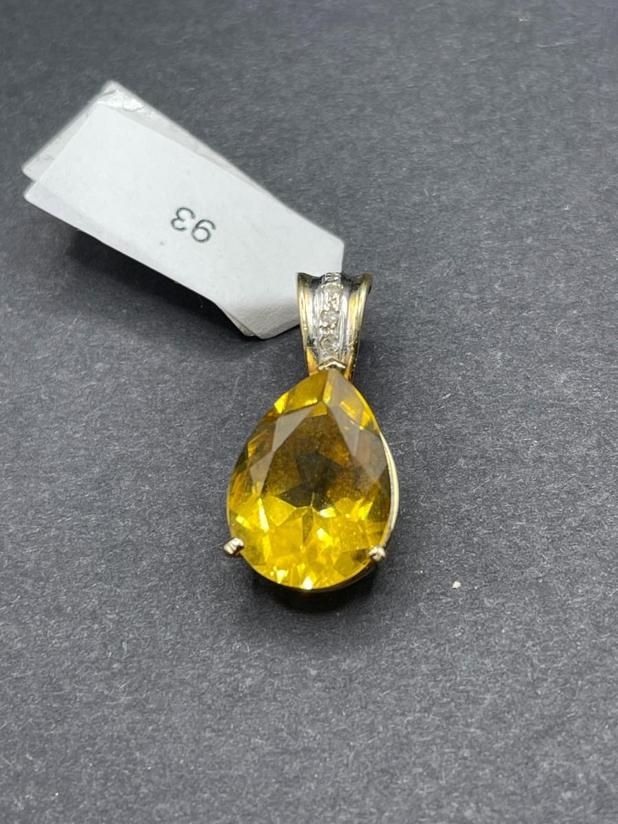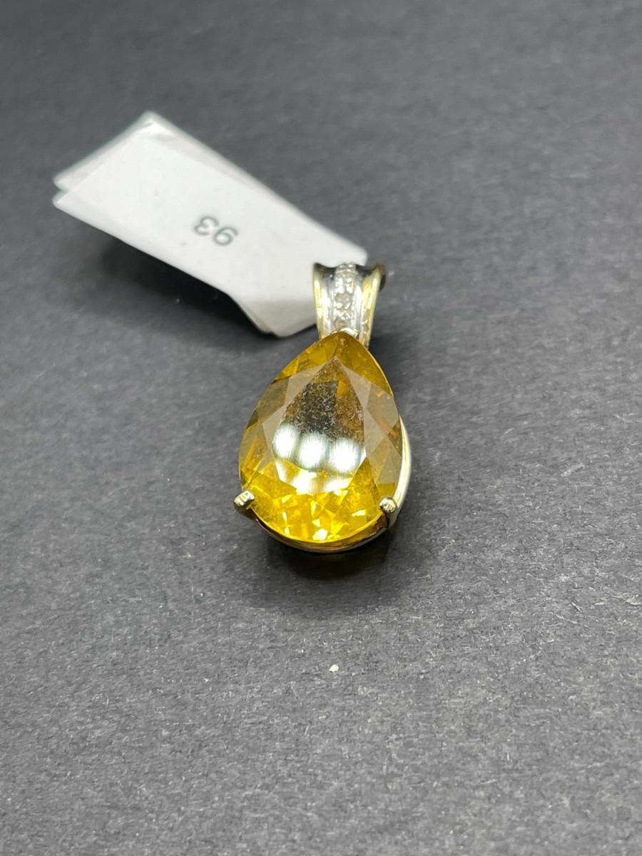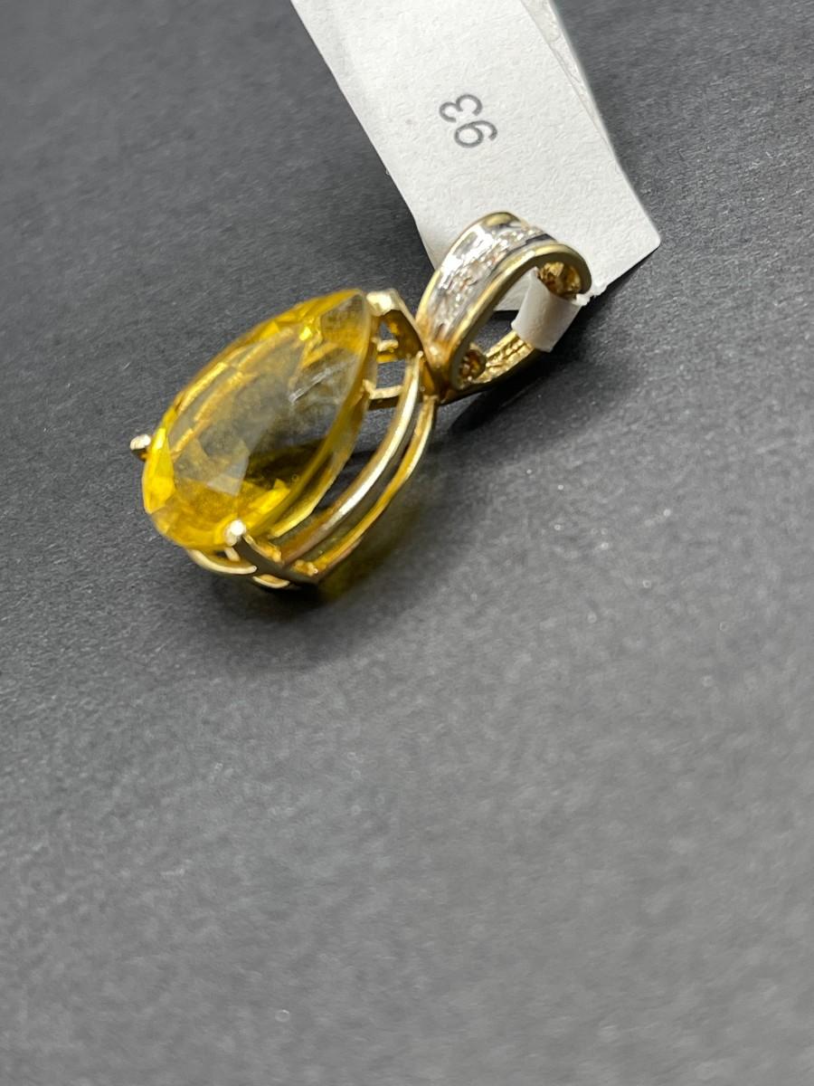 14K yellow gold pendant with large citrine stone and small diamond chips. Unknown maker. 3.41 total grams. Citrine appears to be slightly loose in the setting.