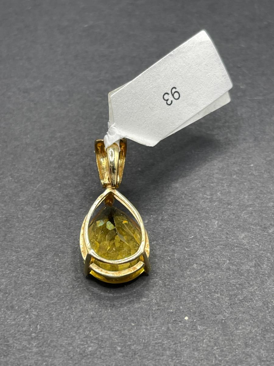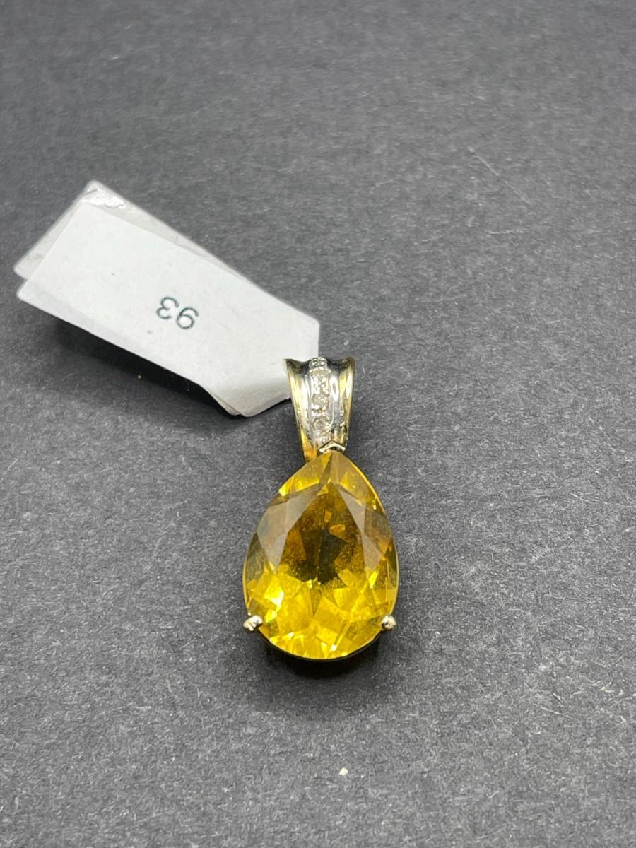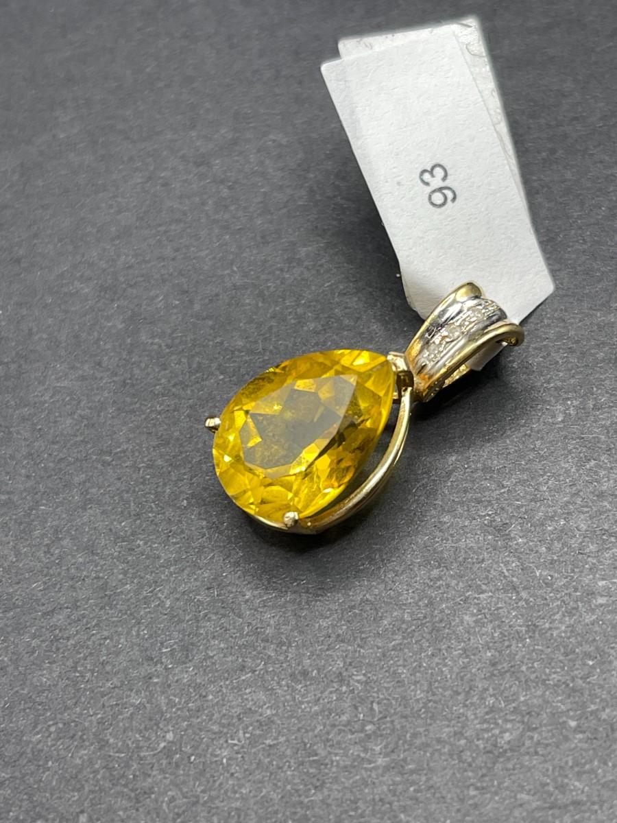 14K yellow gold pendant with large citrine stone and small diamond chips. Unknown maker. 3.41 total grams. Citrine appears to be slightly loose in the setting.