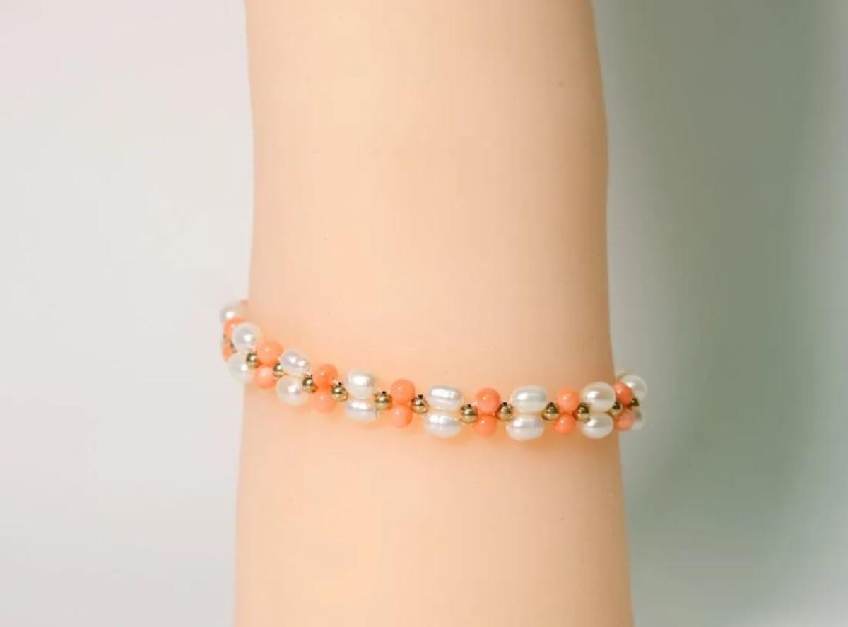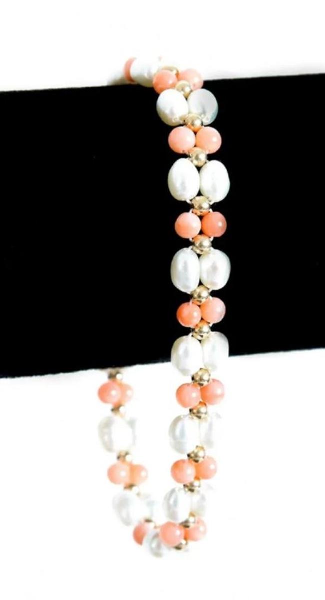 14k yellow gold coral and pearl bracelets with gold ball spacers. Stamped 14k. Approx. length 7", weight 7.2 grams.