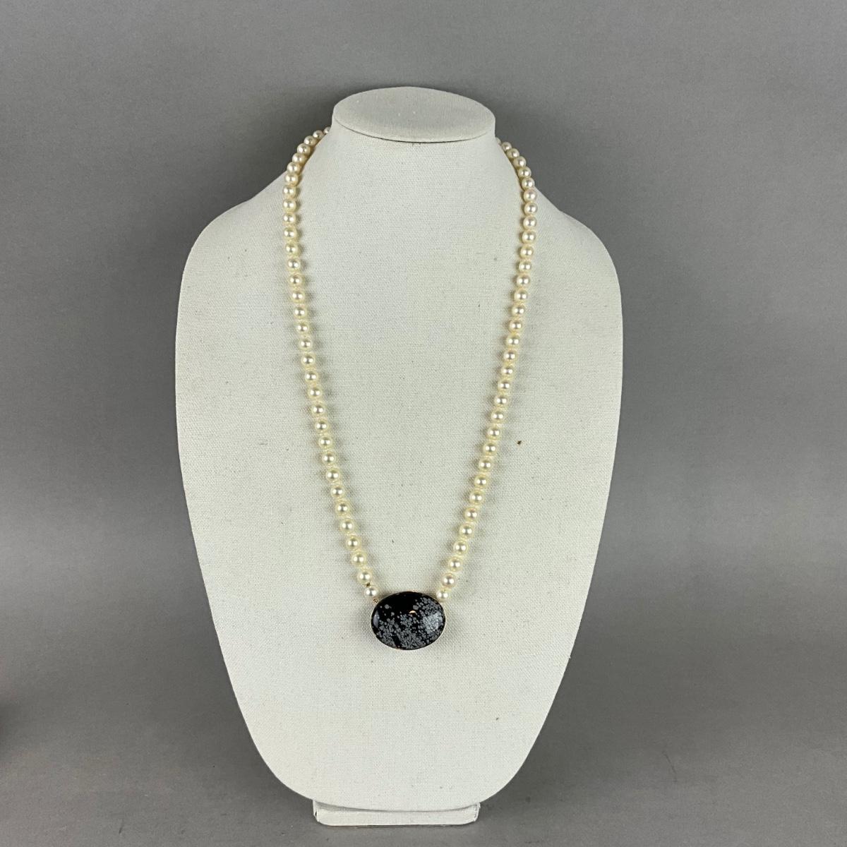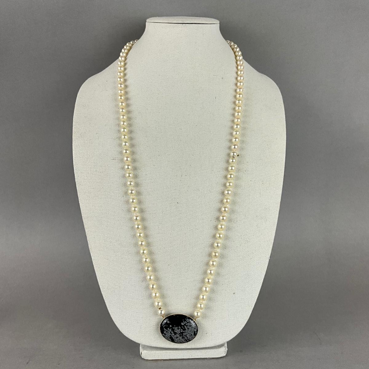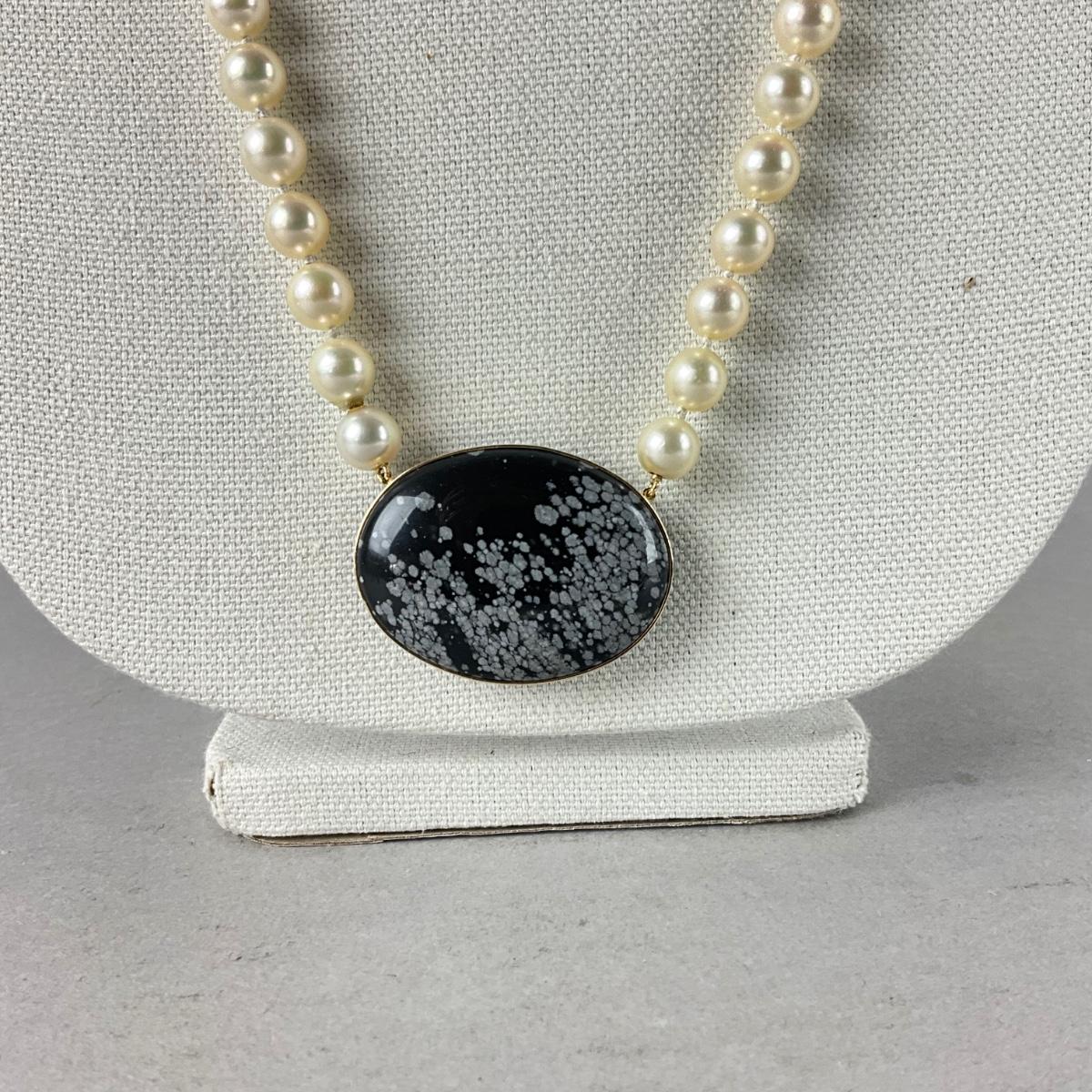 Pearls are 8-8.5 mm in size and are of good lustre and uniform in size with 14k hidden screw clasp and can be adjusted to several different sizes. Very versitile necklace can be worn with or without obsidian accent piece- pendant measures 1.5" wide x 1.24" high