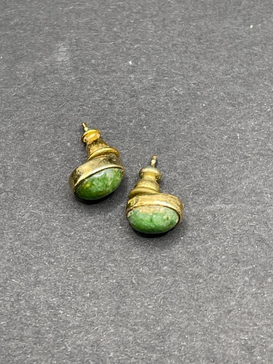 14K yellow gold stud earrings with green jade. 1.24 total grams. Fair condition.