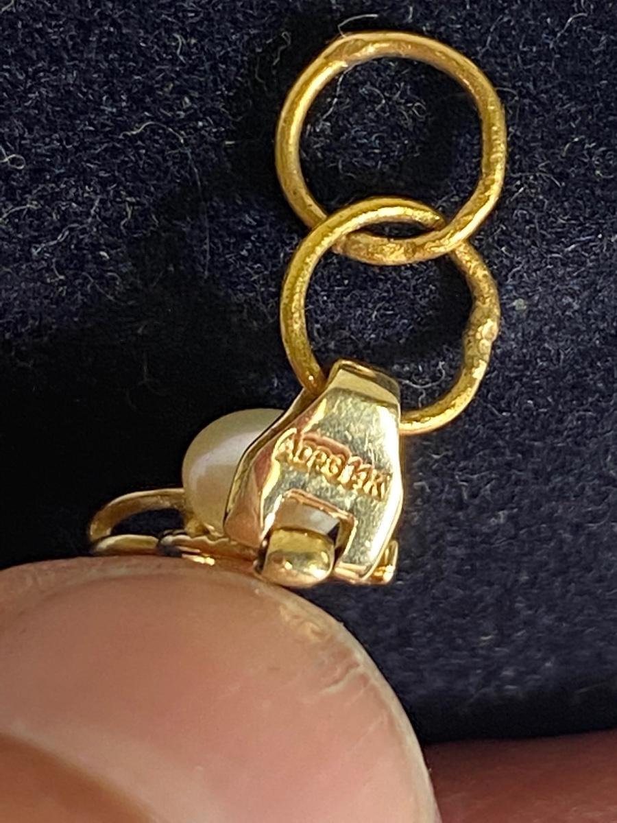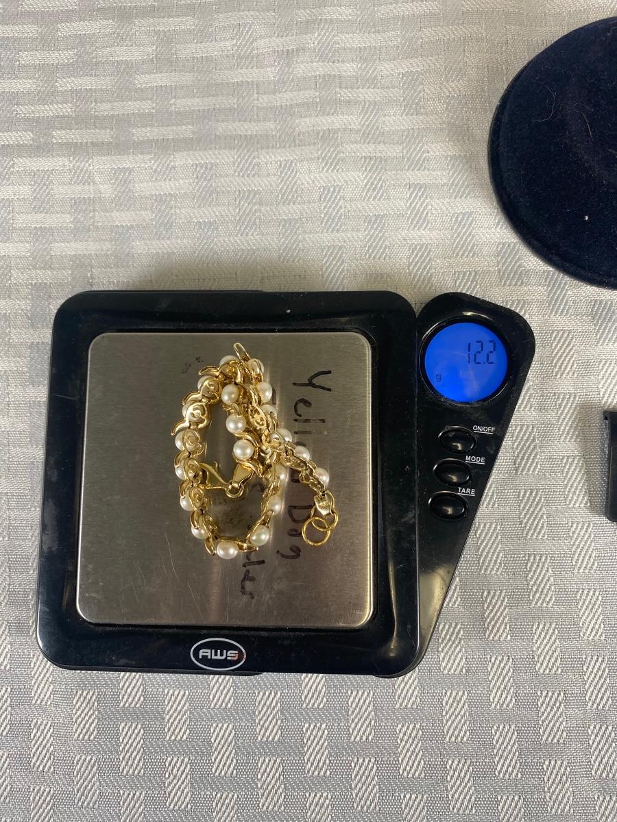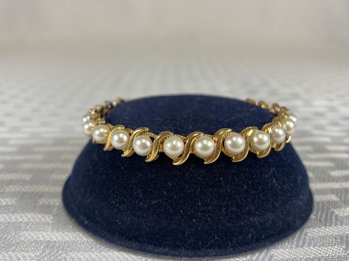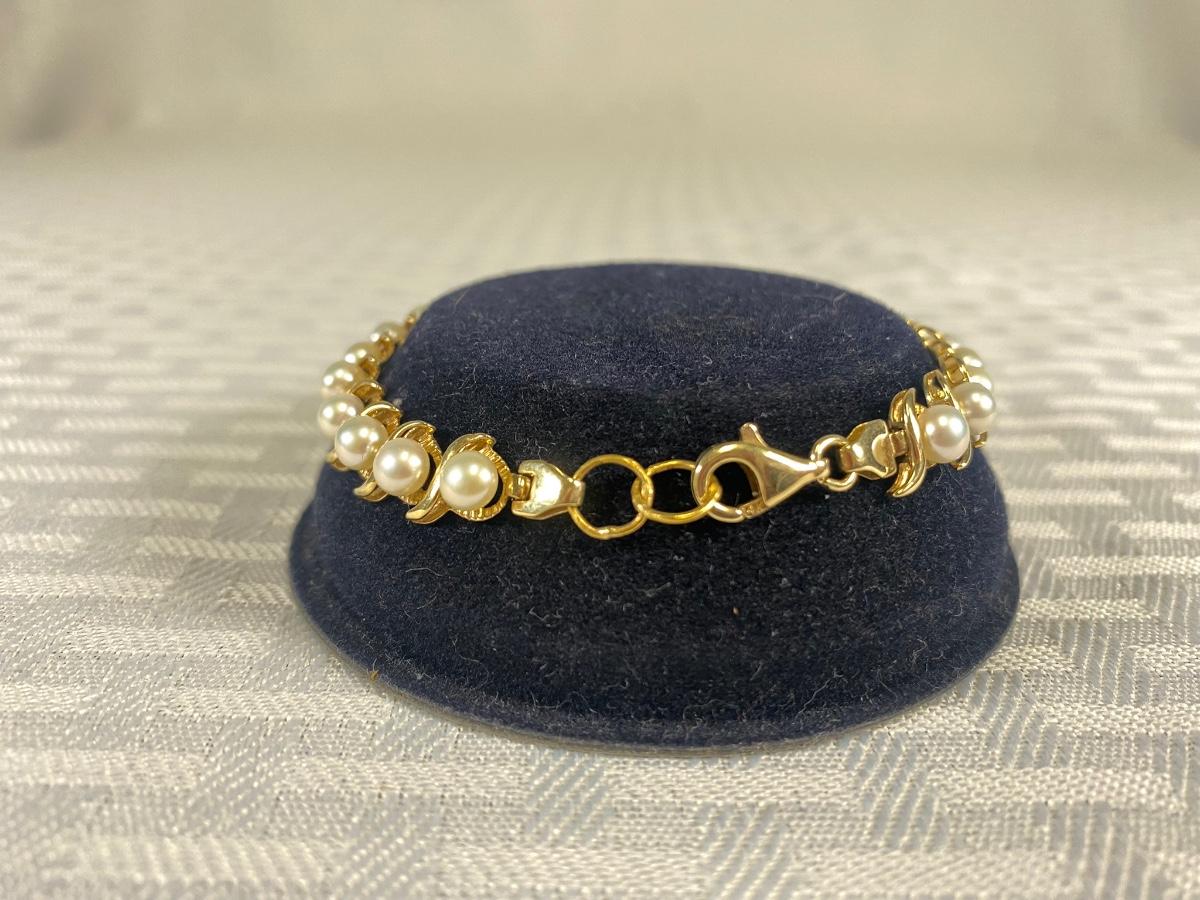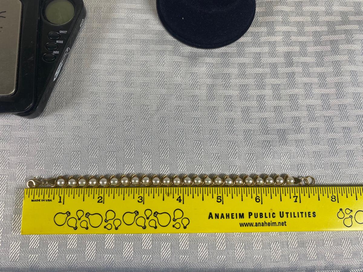 14k Yellow Gold & Pearl Tennis Bracelet. In good condition. Stamped 14k on clasp and on opposite end of bracelet. About 7" length but previous owner had a couple rings added for length. 12.2g tw.
