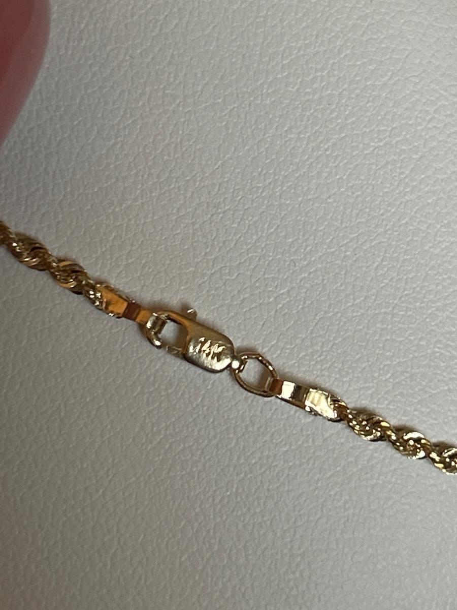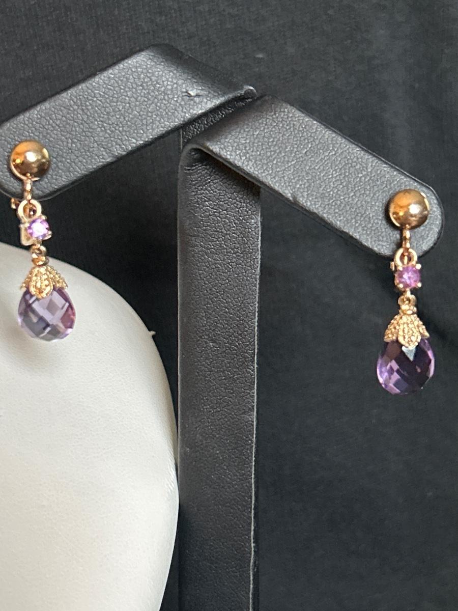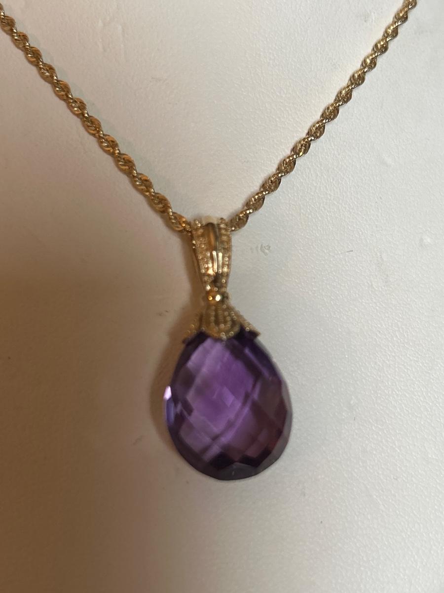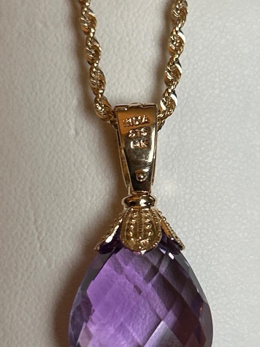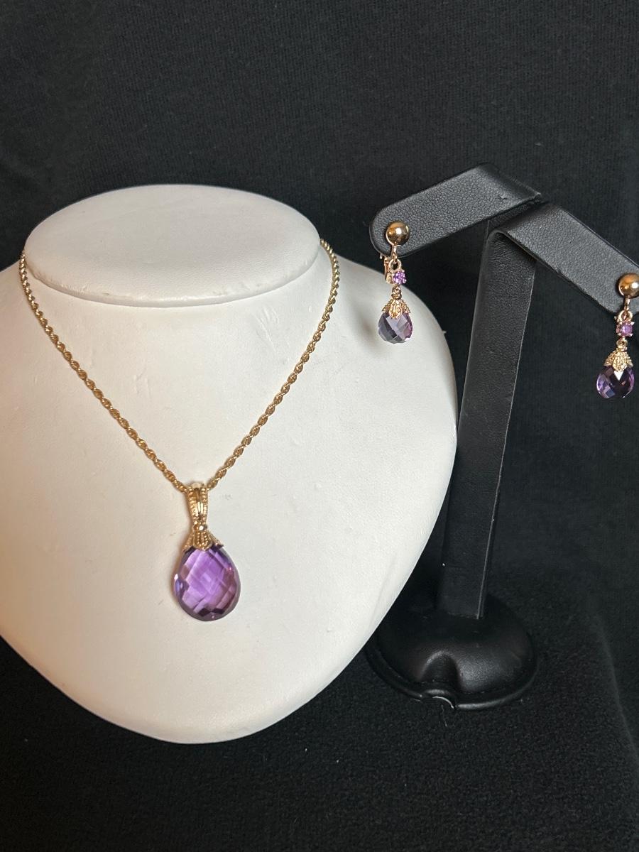 The earrings are clip on. The chain, the pendant & the earrings are all 14K. The chain is 22🔔 long. If I were to guess I would say it’s amethyst.