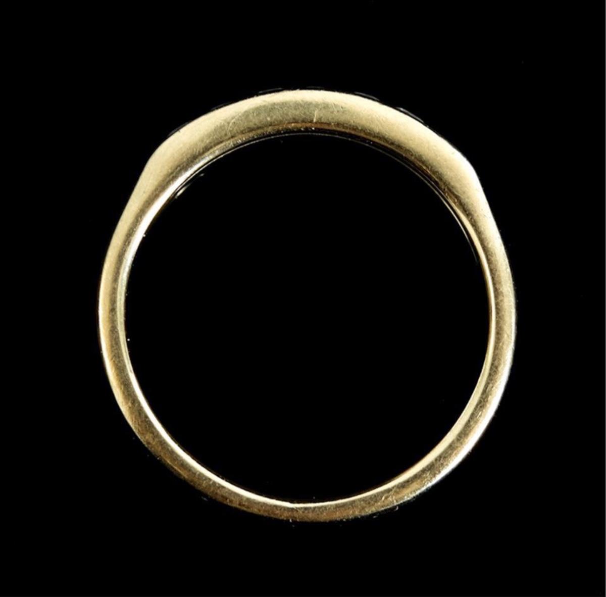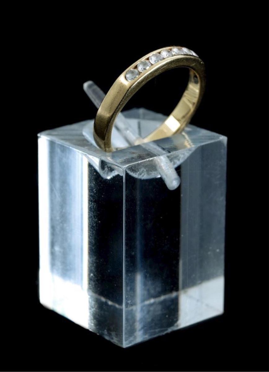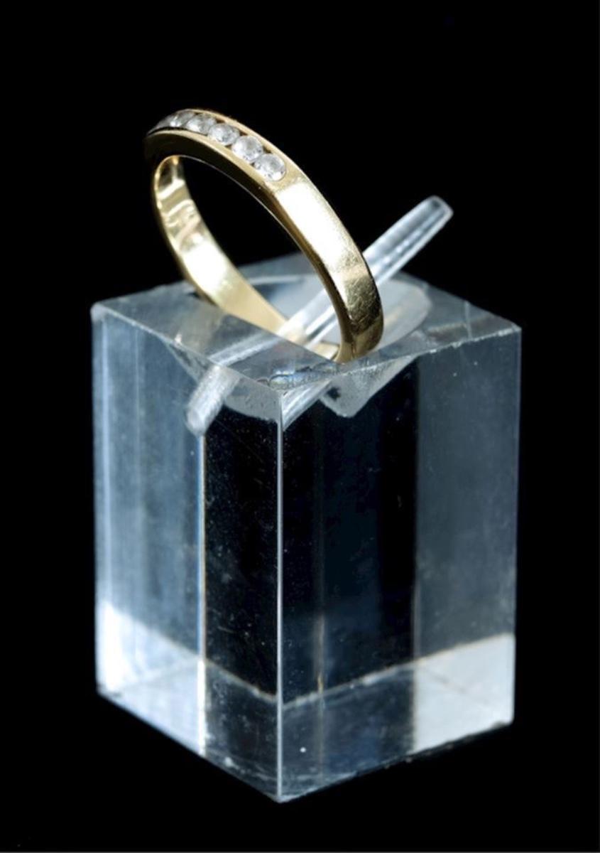 14k yellow gold ring band set with seven colorless stones. Ring size 3.5. Stamped 14k. Gross weight 2.2 grams.