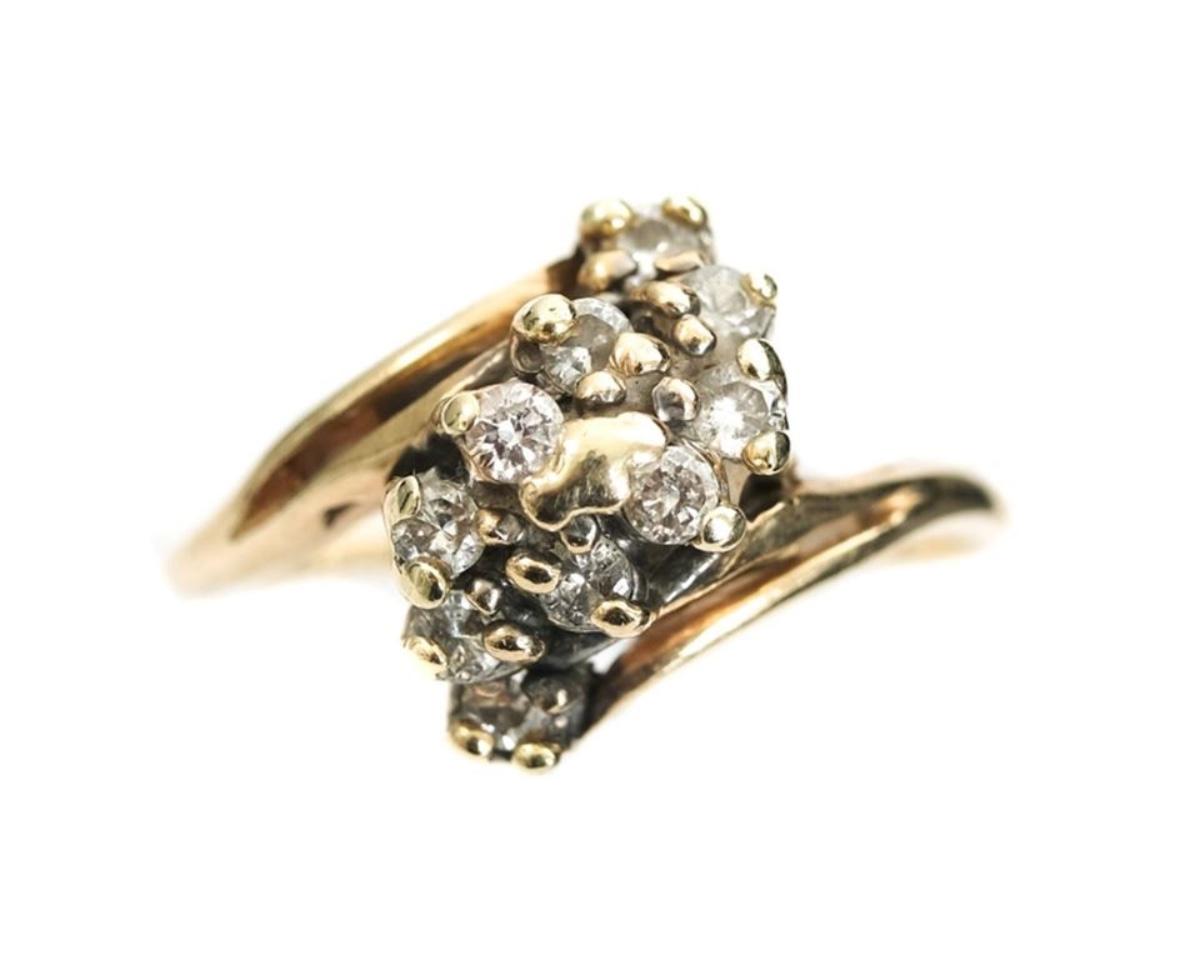 14k yellow gold ring set with ten round brilliant cut diamonds, size 4. Faintly stamped. Approx. overall weight 2.5 grams.