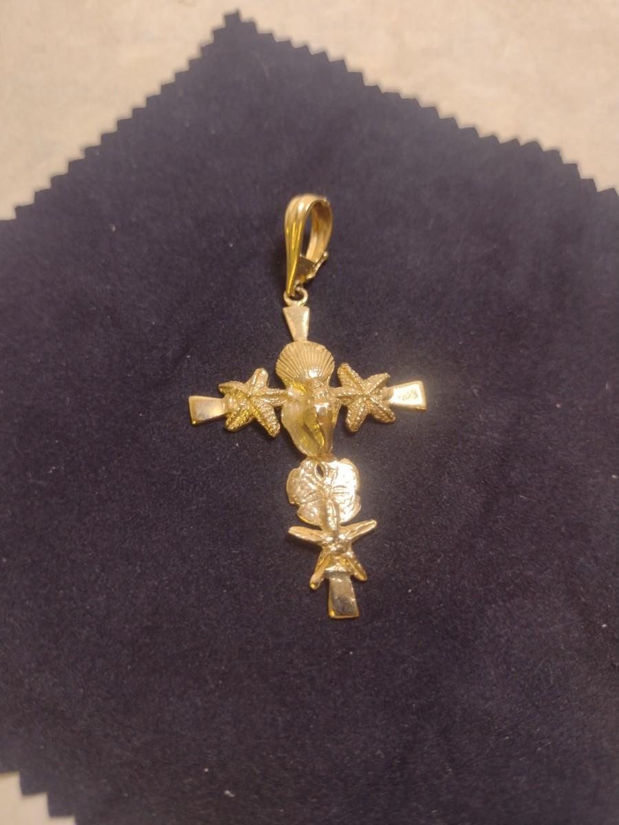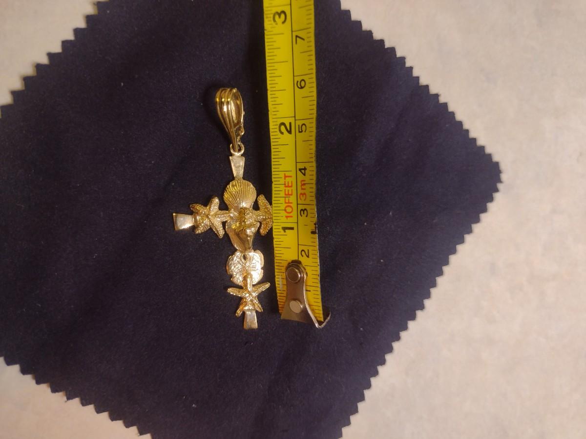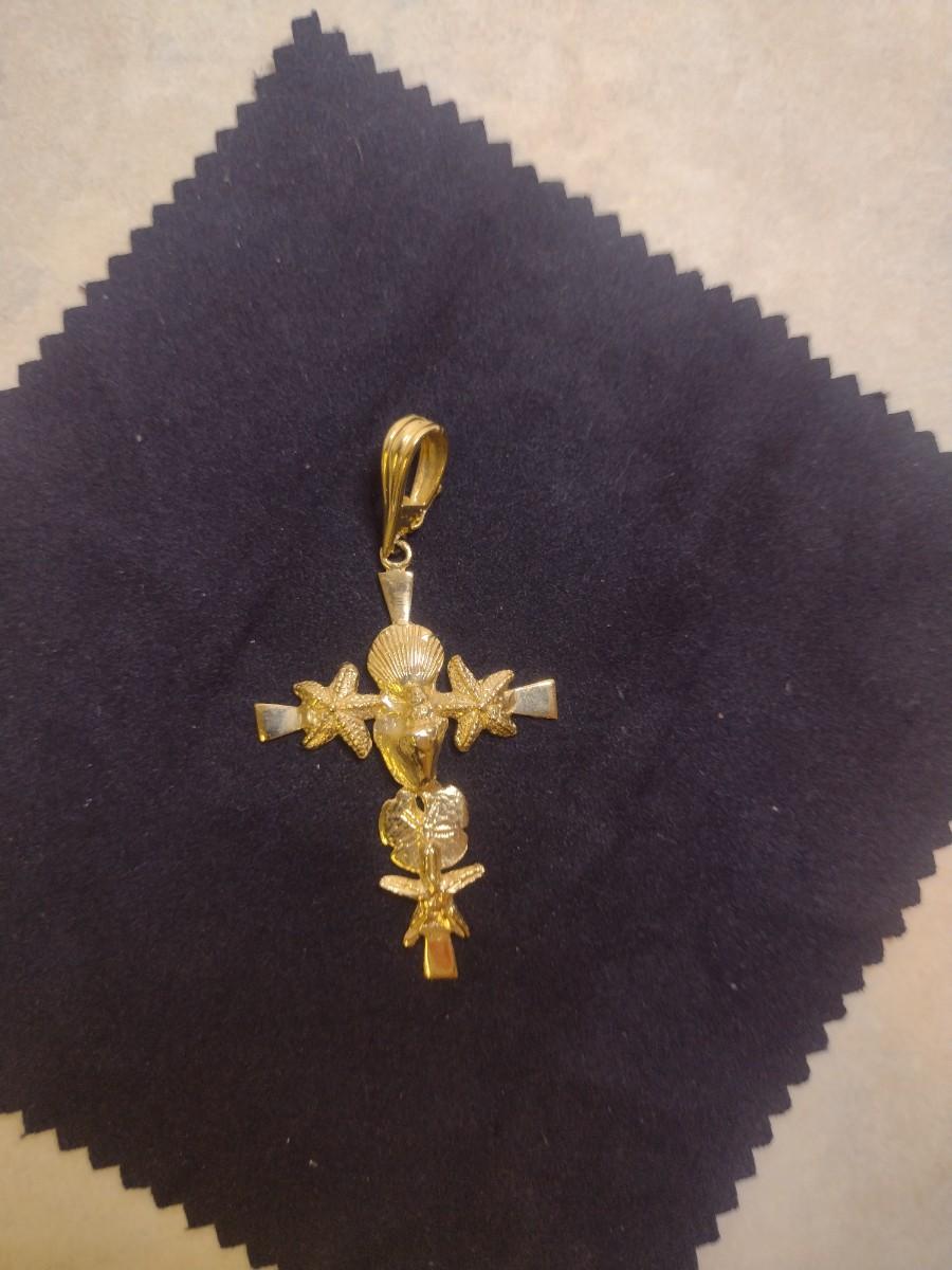 14K Yellow Gold Starfish and Sand Dollar Cross Charm Pendant Total Weight 7.7 grams (#34). A 6.75% NC sales tax will be added to the jewelry invoice amount at the end of the sale. Coins are exempt from state sales tax.