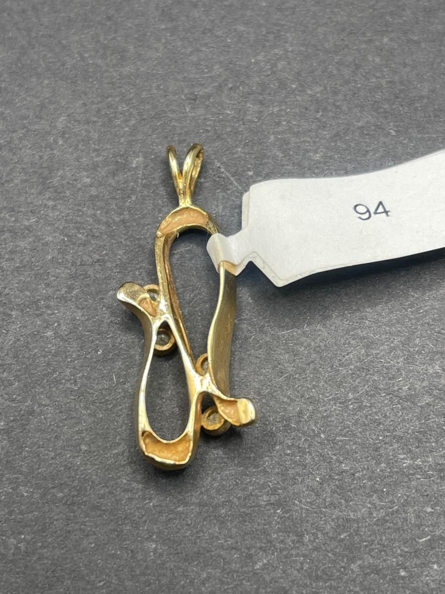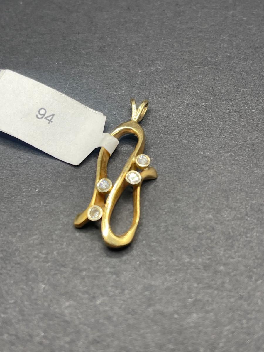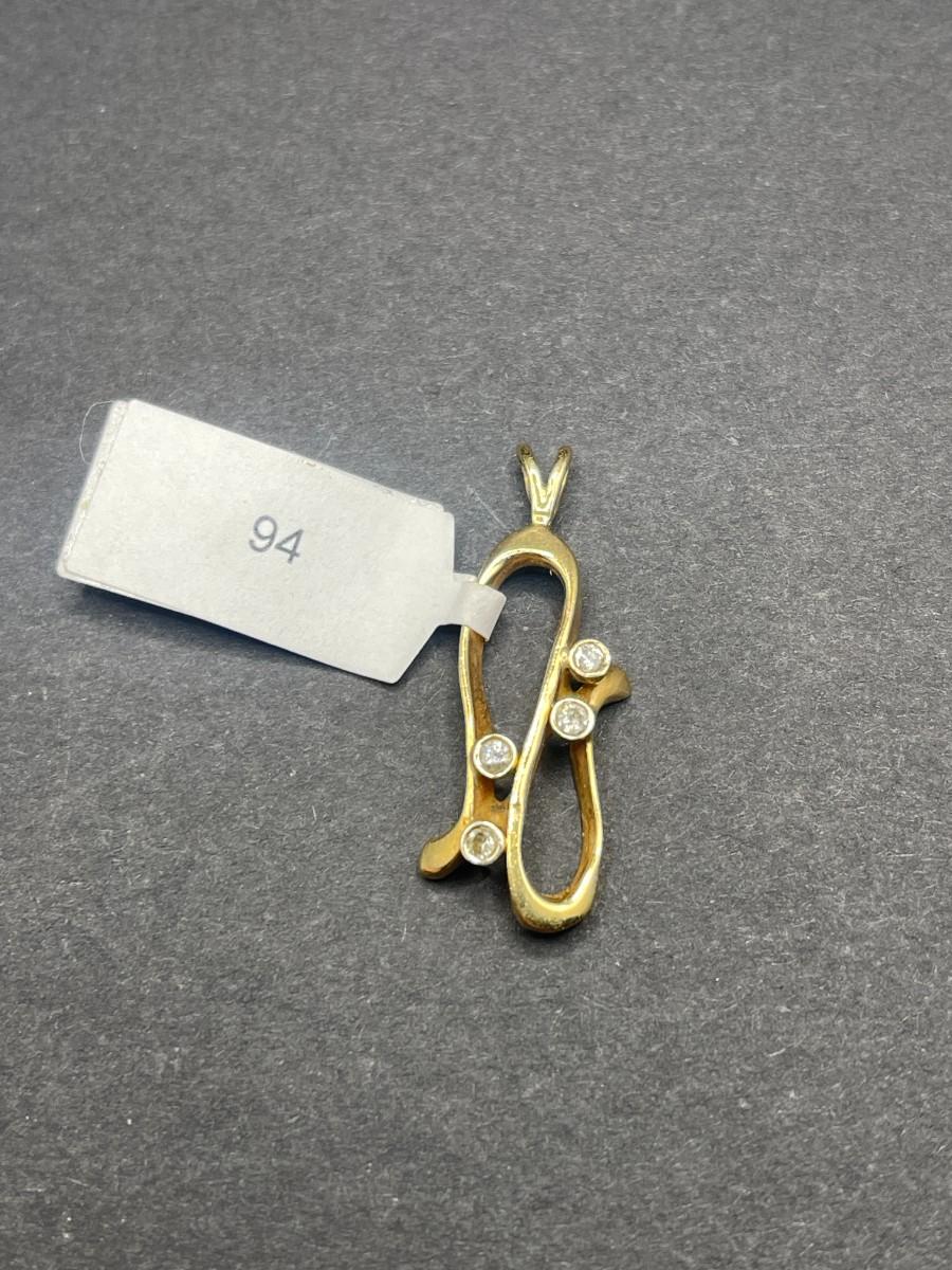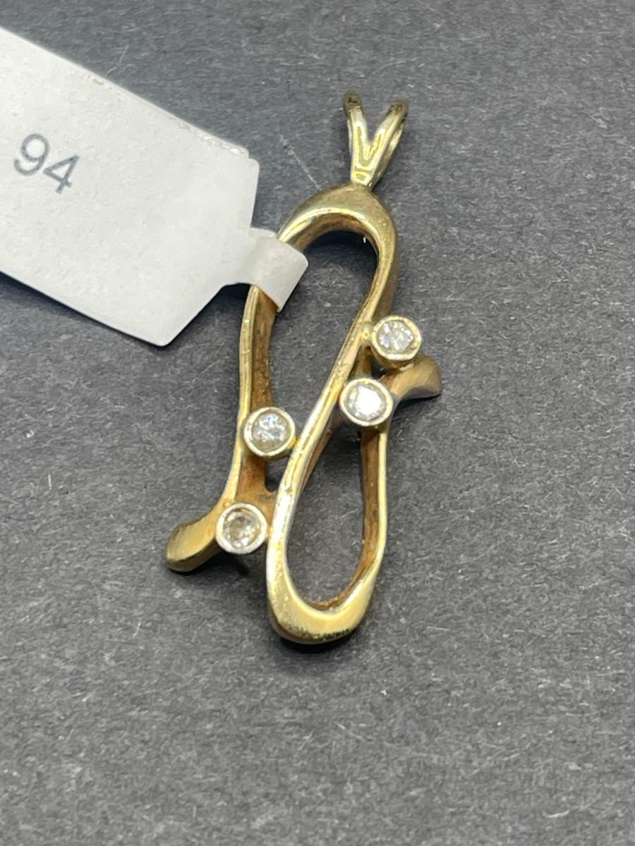 14K yellow gold swirl pendant set with 4 diamonds. Unknown maker. 2.79 total grams. I-JI1. Fair condition.