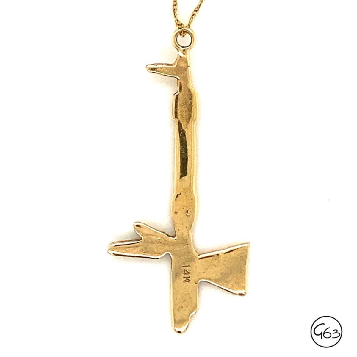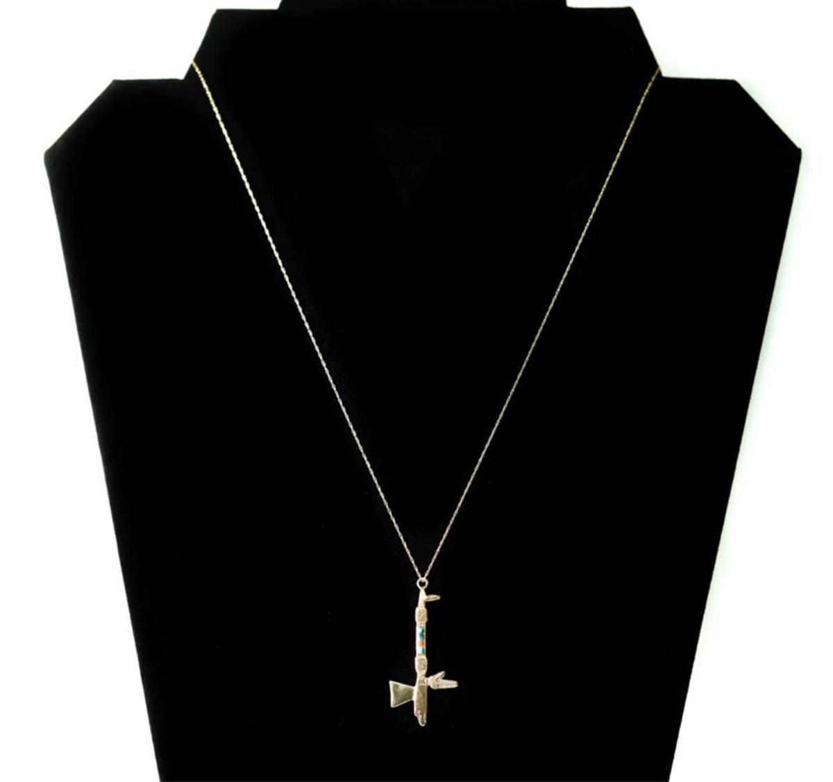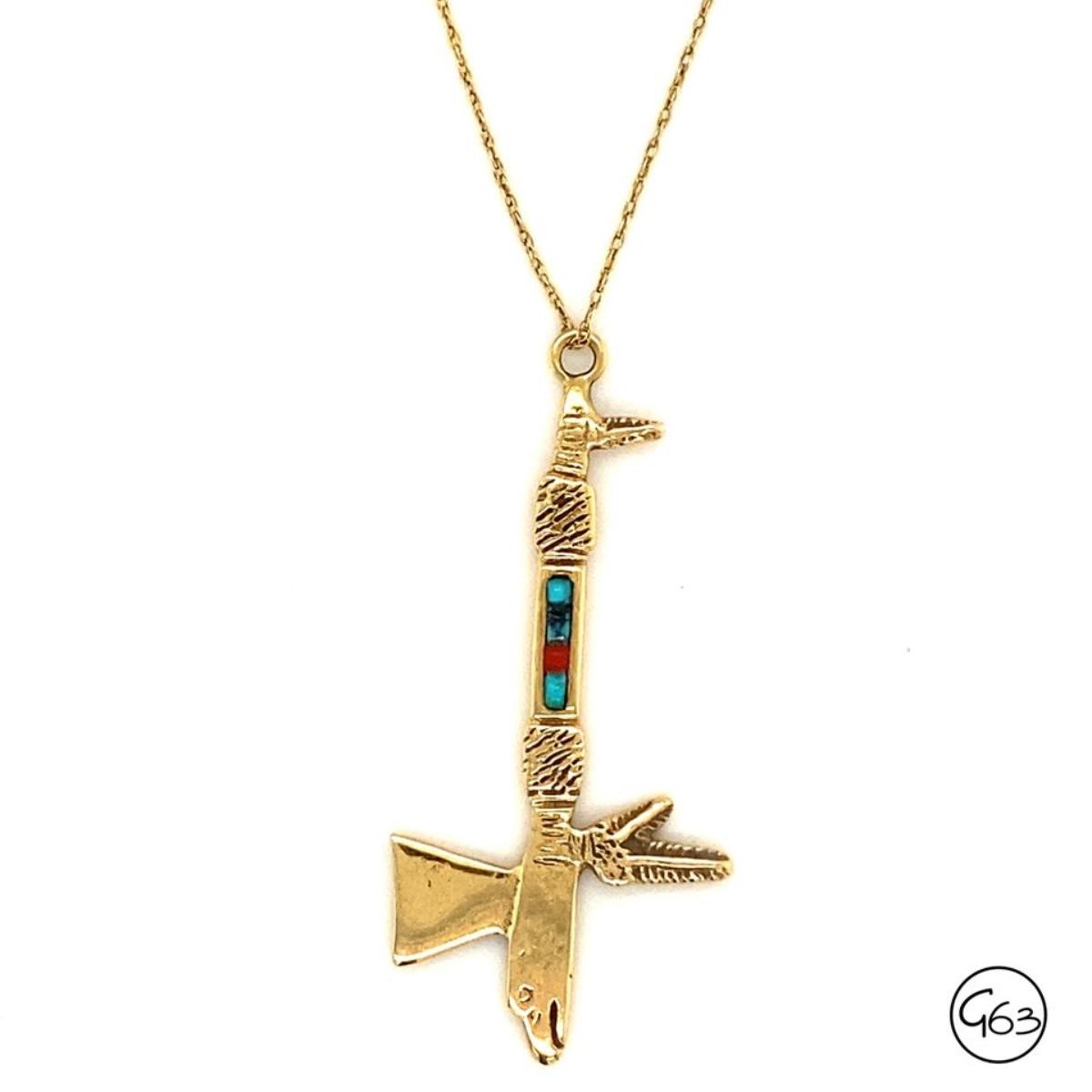 10K yellow gold chain hung with a 14k yellow gold tomahawk pendant inset with turquoise and coral. Chain stamped 10k and pendant stamped 14K. Approx. length of chain 18 in., weight .33 grams. Approx. length of pendant 1.5 in., weight 2.2 grams.