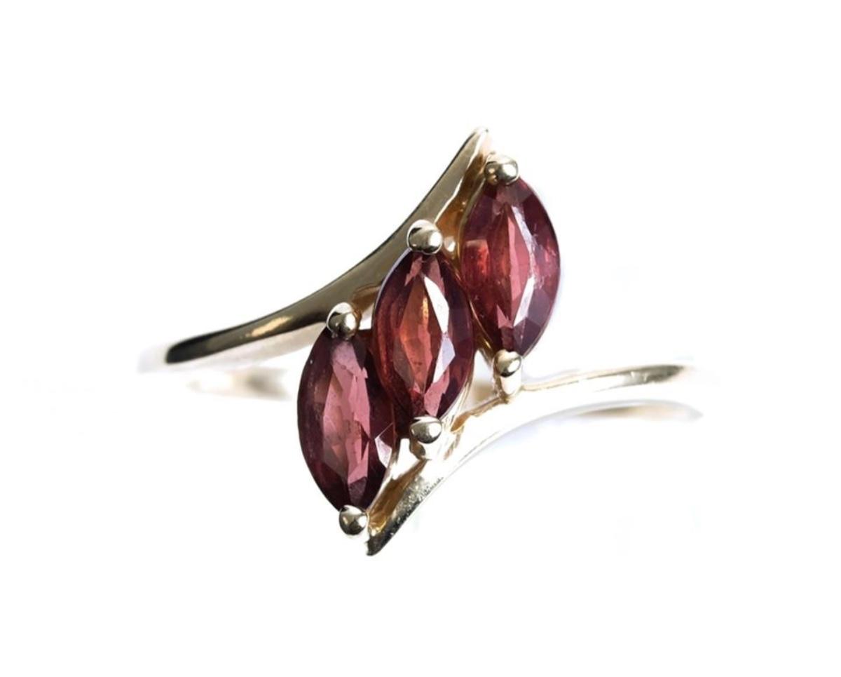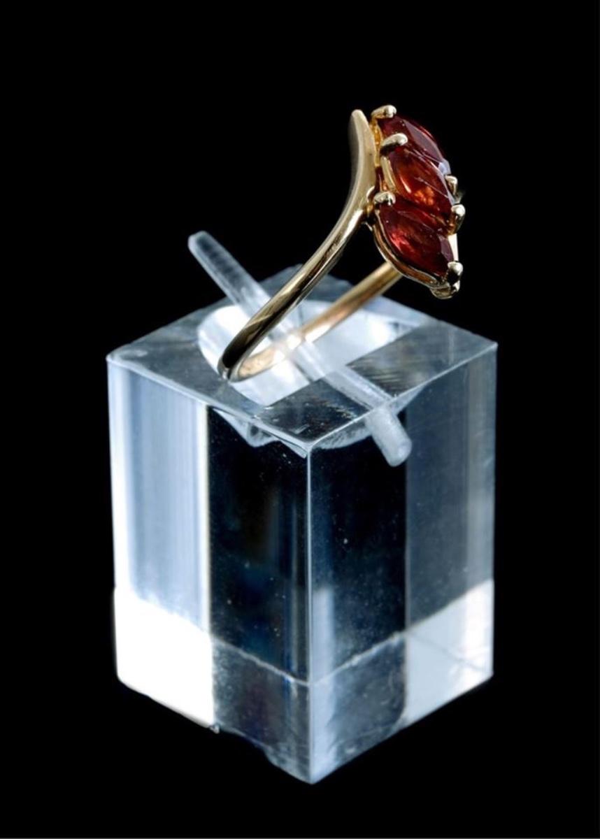 14k yellow gold ring with three faceted tourmaline gemstones. Ring size 5 1/2. Stamped P 14k. Approx. overall weight 2.23 grams.