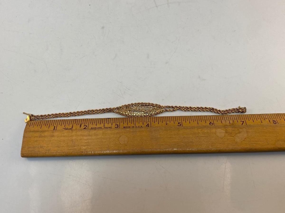 14k Yellow Gold Twisted Link Chain with Filigree Center Work Bracelet. Filigree center with twisted link chain, Marked 14k on clasp. About 7" length. 7.77g tw.