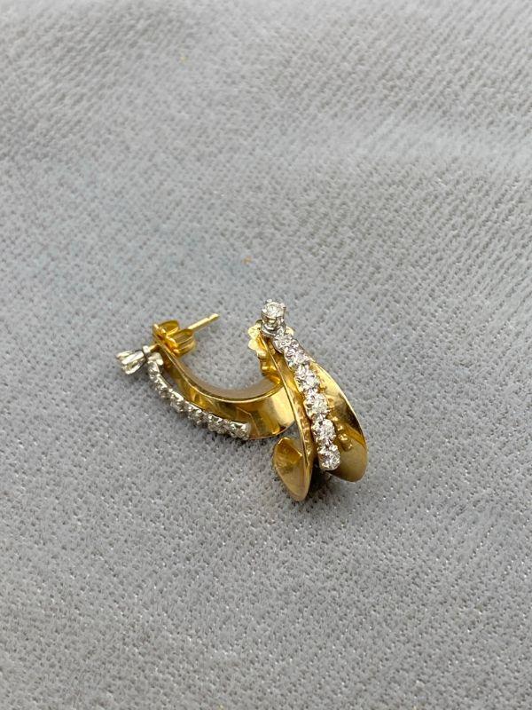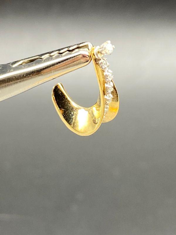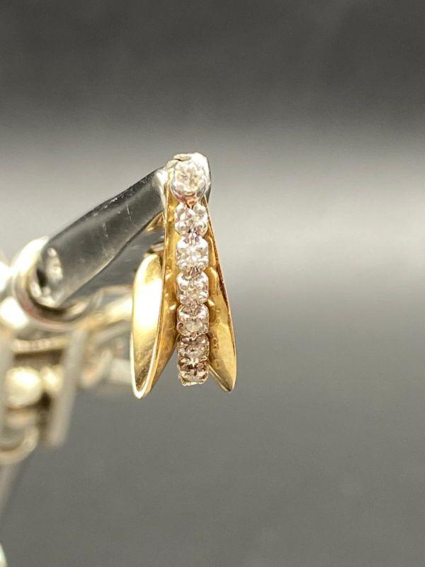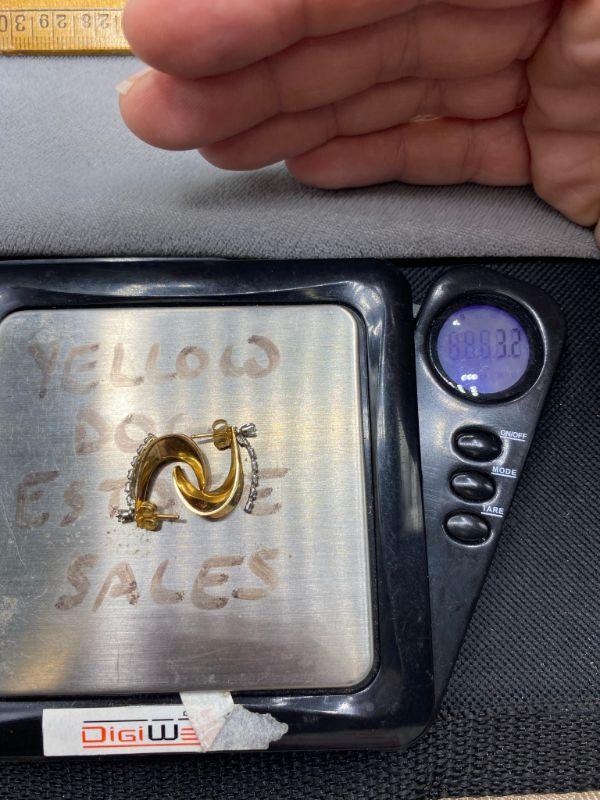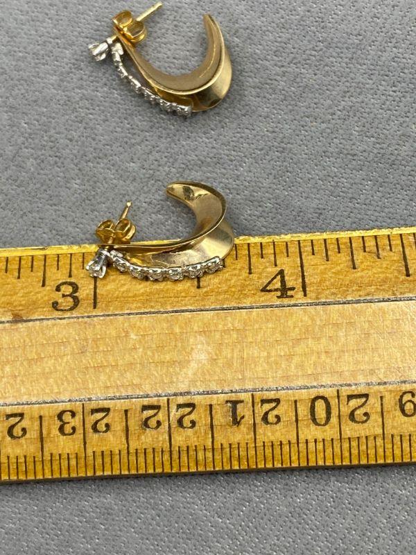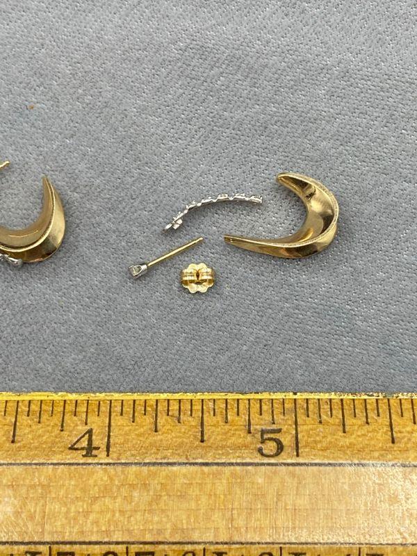 14k yellow and white gold 3 piece earrings. One pair, 4 ways to wear them. The stud fits through a hole at the top of the white gold stones piece and through the yellow gold piece. So wear them all together or separate. Found stamp on white gold, stud, and earring backs, I am going to assume the yellow gold is 14k also. 3.2g t.w.