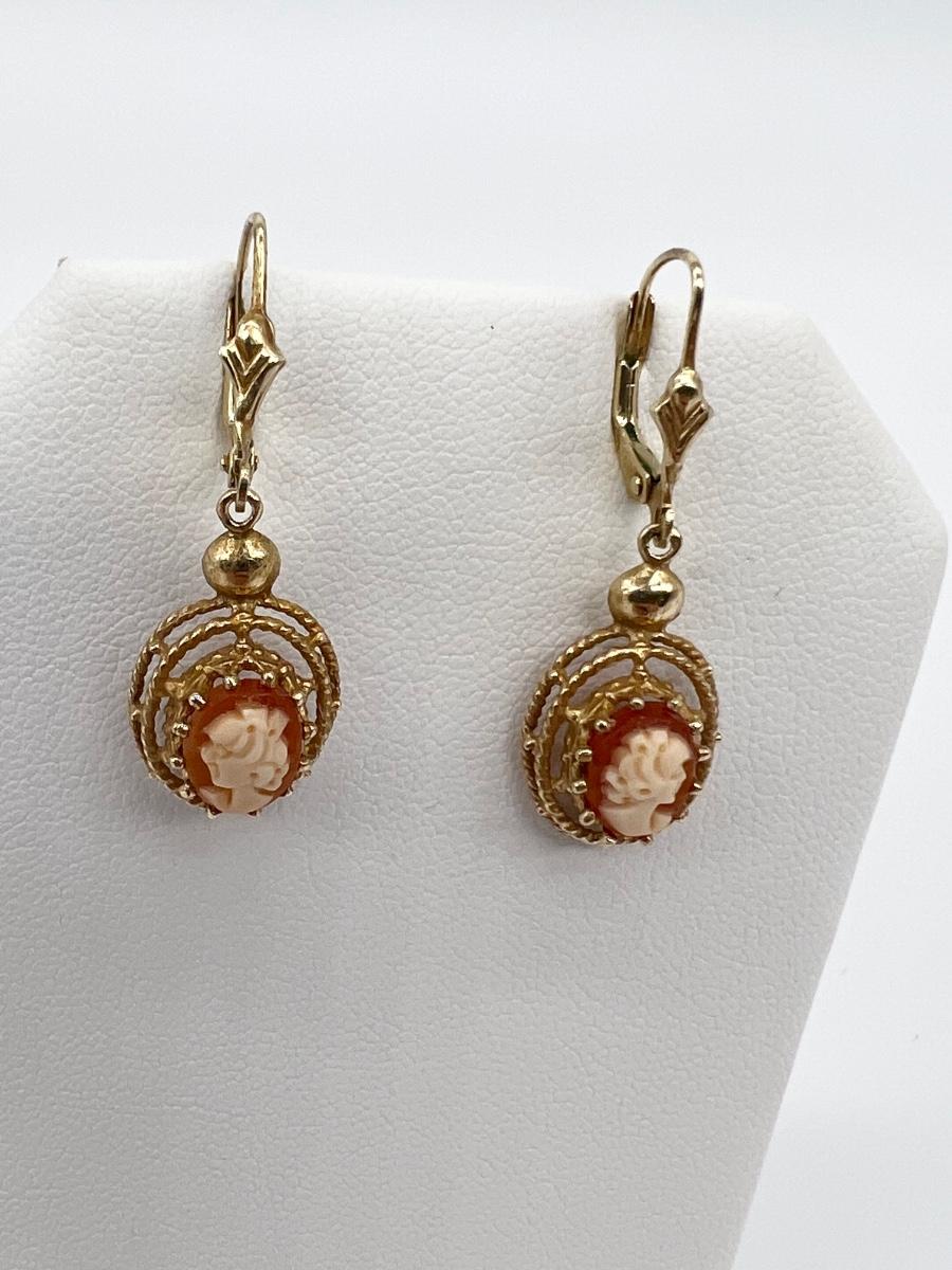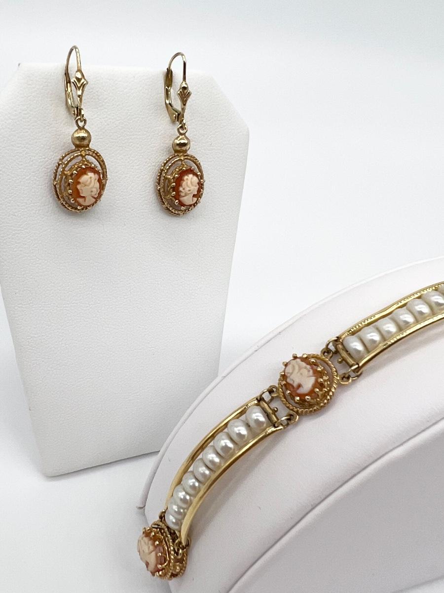 14K YG ~ Cameo Drop Earrings & 7" Cameo / Pearl Bracelet
