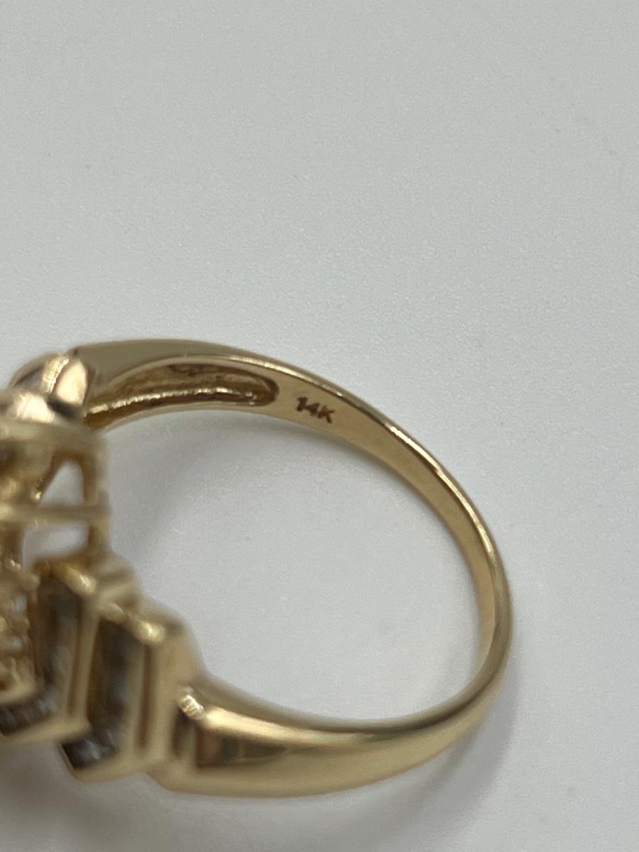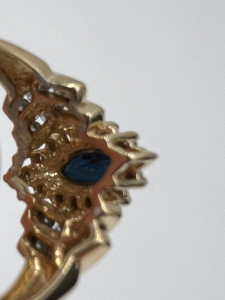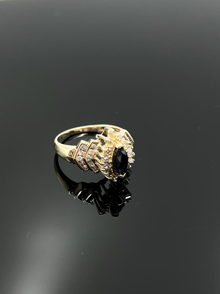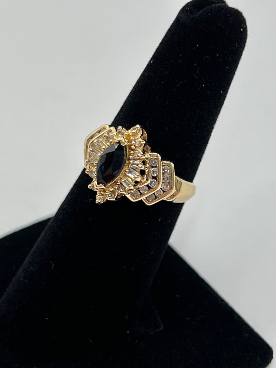 14K YG ~ Dark sapphire diamond ring ~ Size 7 ~ Has approximately 36 diamonds ~ 5 grams total weight ~ Diamonds have been verified by a jeweler ~ Dark sapphire stone = 9mm x 4mm