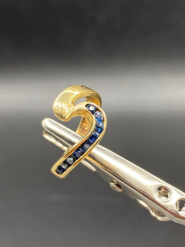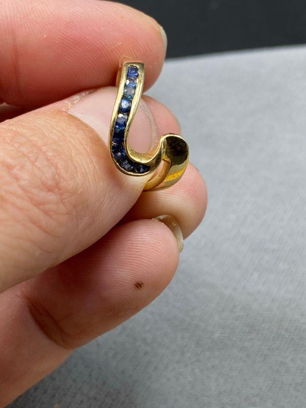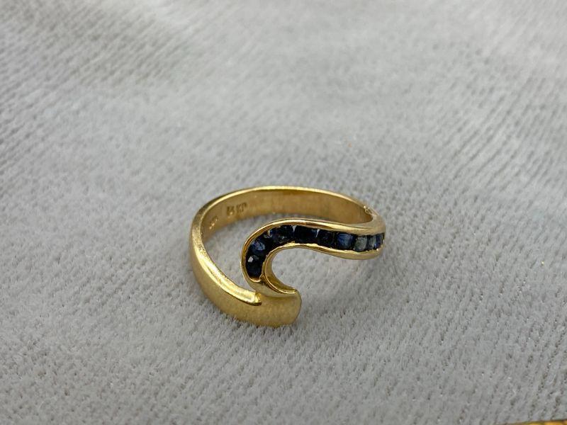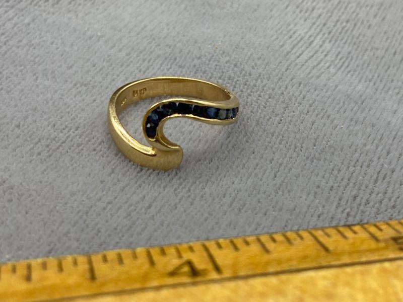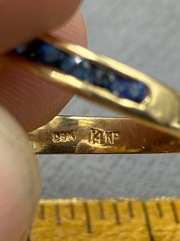 14kp & sapphire swirl ring. Yellow gold with 9 stones. Fits like a size 7. Weighs 3.6g. The "p" in 14kp stands for plumb, not plate in jewelry, "PLUMB GOLD A term used to describe gold jewelry that contains the precise amount of gold in the alloy that the Karat mark indicates. an item marked 14Kt could legally have been 13.5 karat and still considered 14K." according to online research. "gp" is the mark used for gold plate.