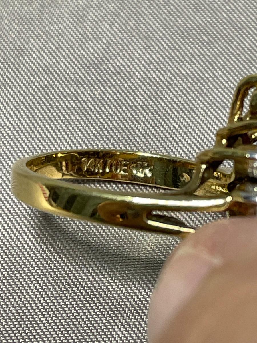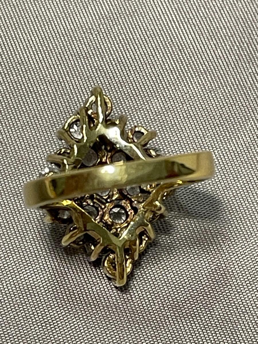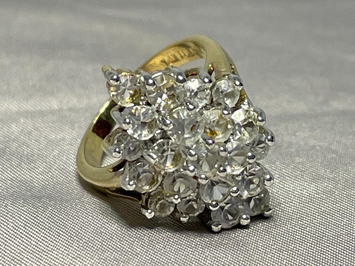 This is a lovely ring that has three tiers of clear rhinestones and is in excellent condition and about a size 6.75. The interior is stamped 14KT GE and all of the stones appear to be securely intact.