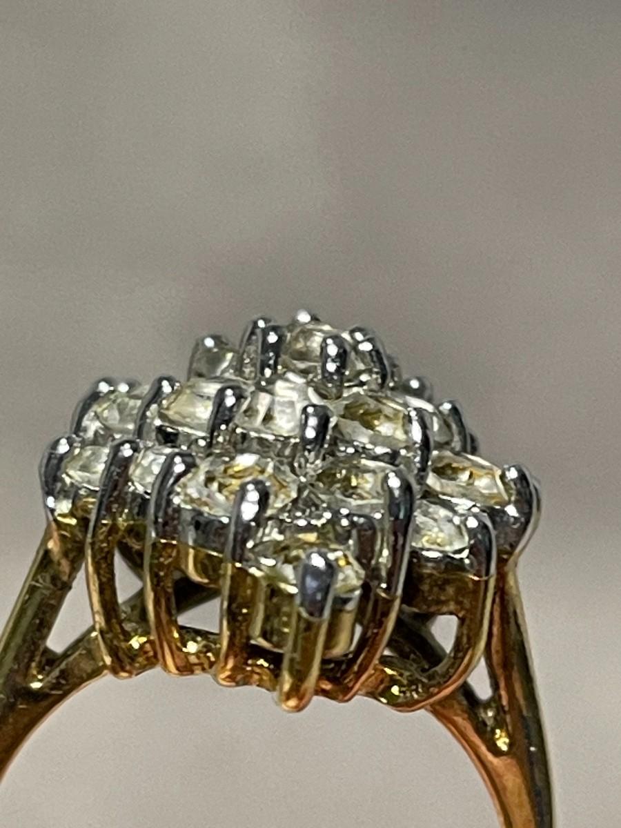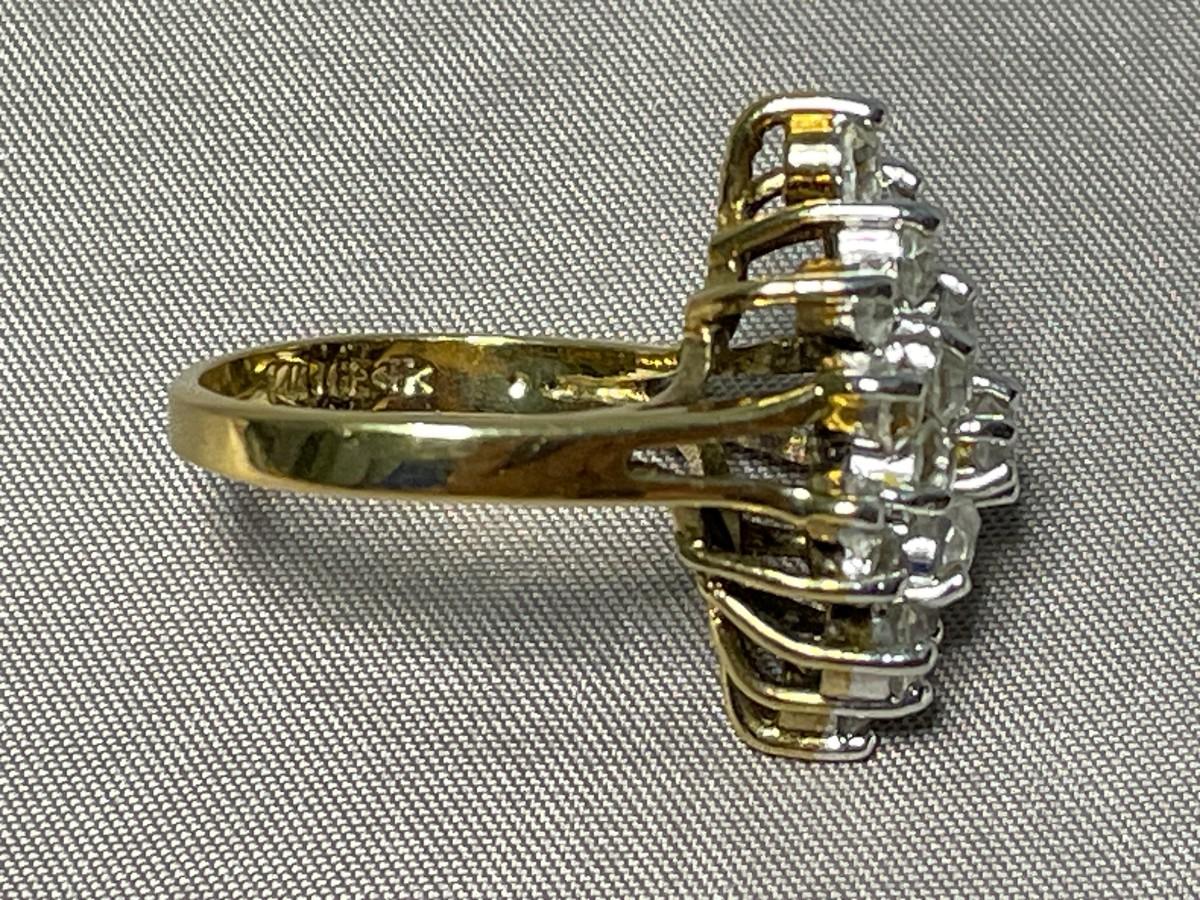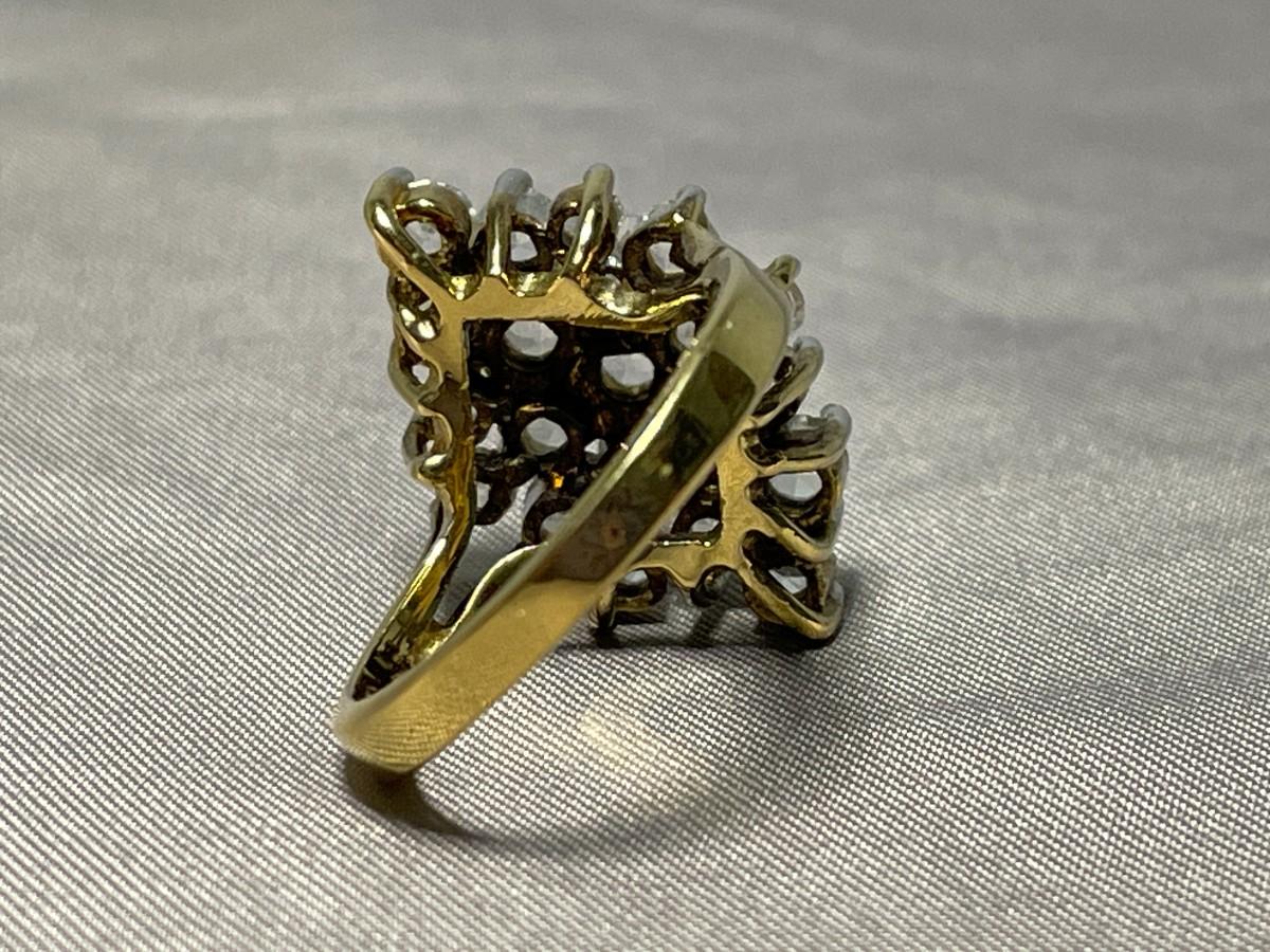 This is a lovely ring that has three tiers of clear rhinestones and is in excellent condition and about a size 6.75. The interior is stamped 14KT GE and all of the stones appear to be securely intact.