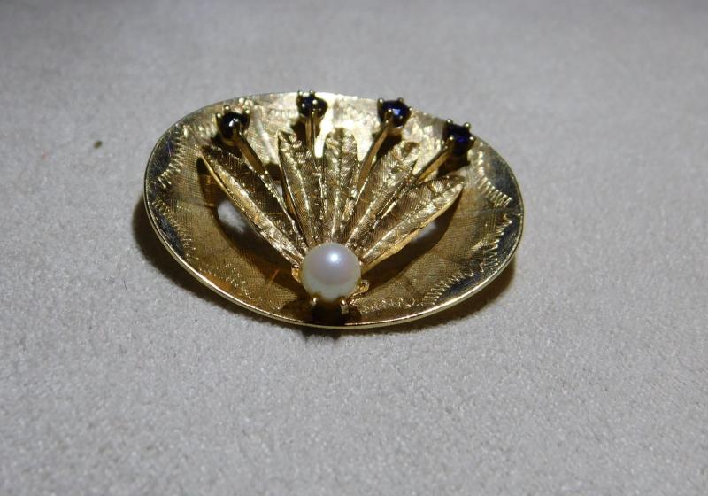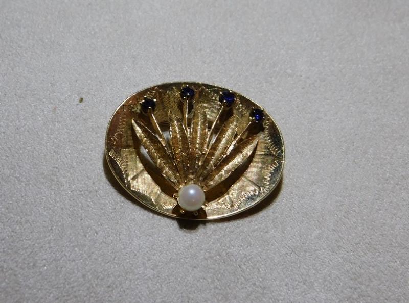 14Kt Gold Brooch with Sapphire and Pearl Stone Accent