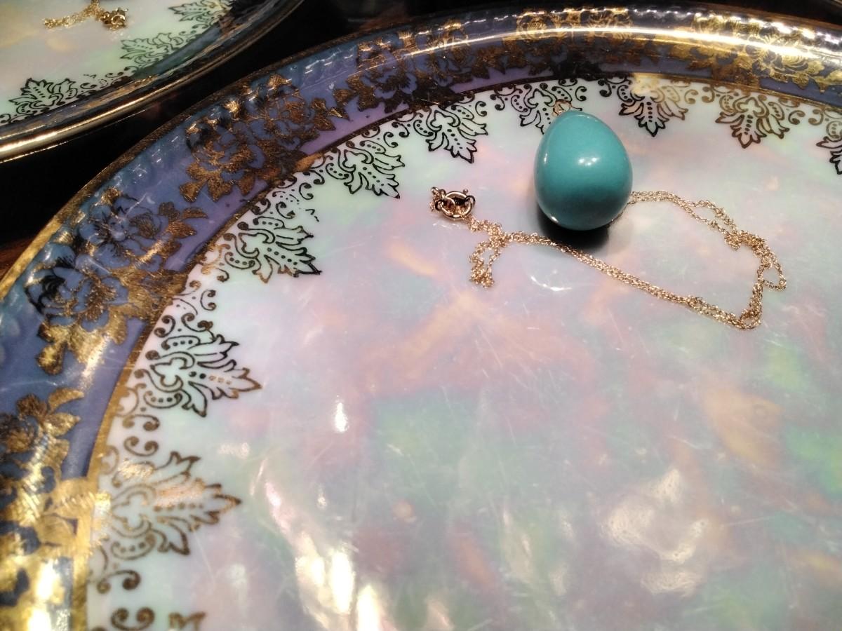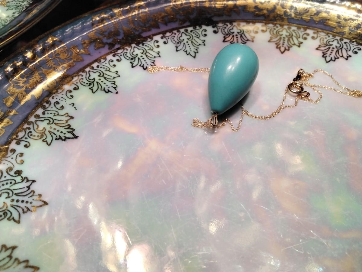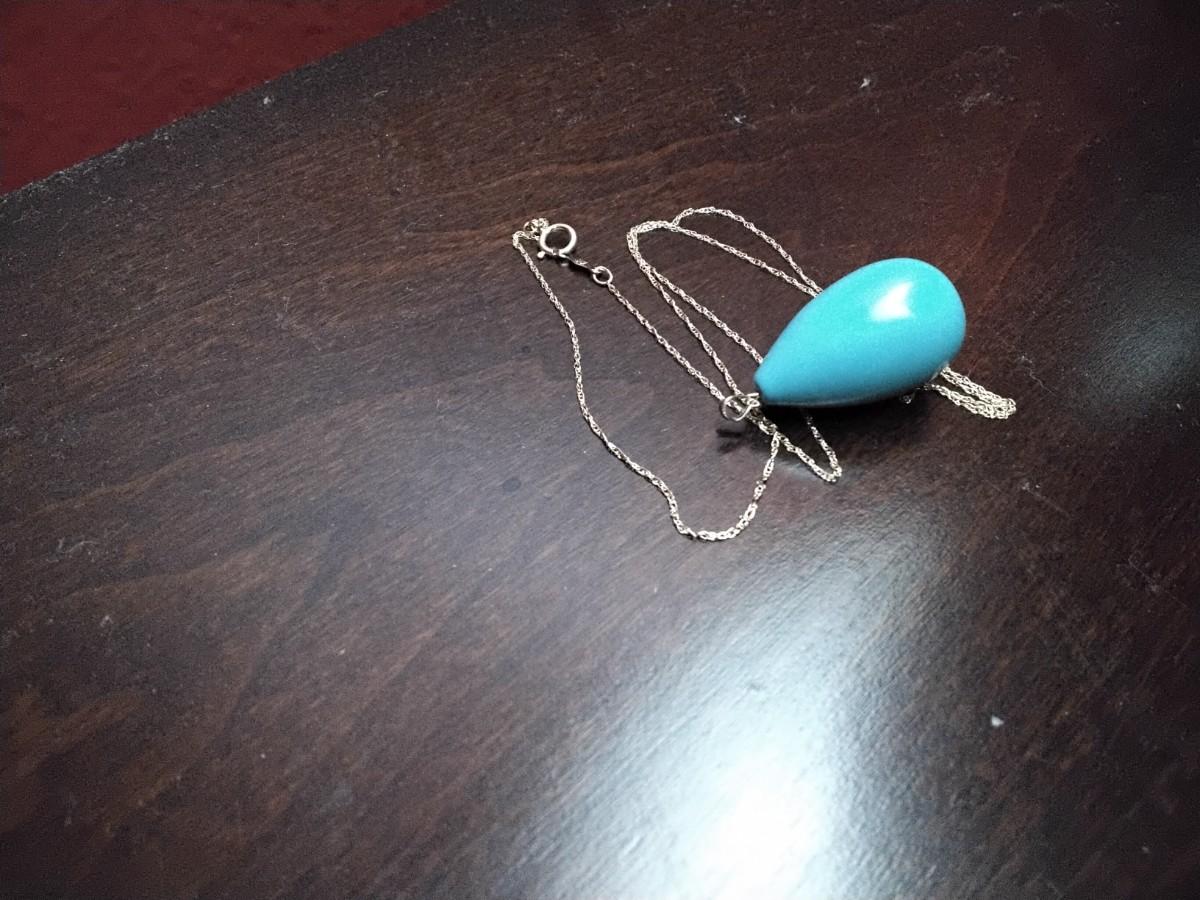This beautiful sleeping beauty turquoise drop is from old stock. This is a great look as it is a big size and quite pretty and noticeable at 15 mm at the widest. Solid 14kt gold double ear bail finding and solid 14 kt chain.