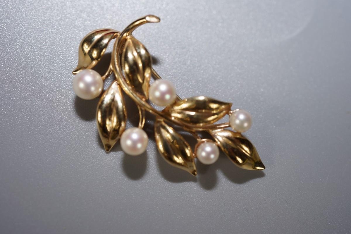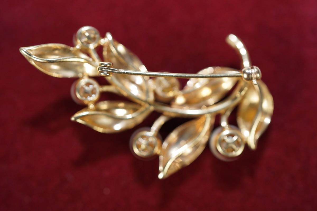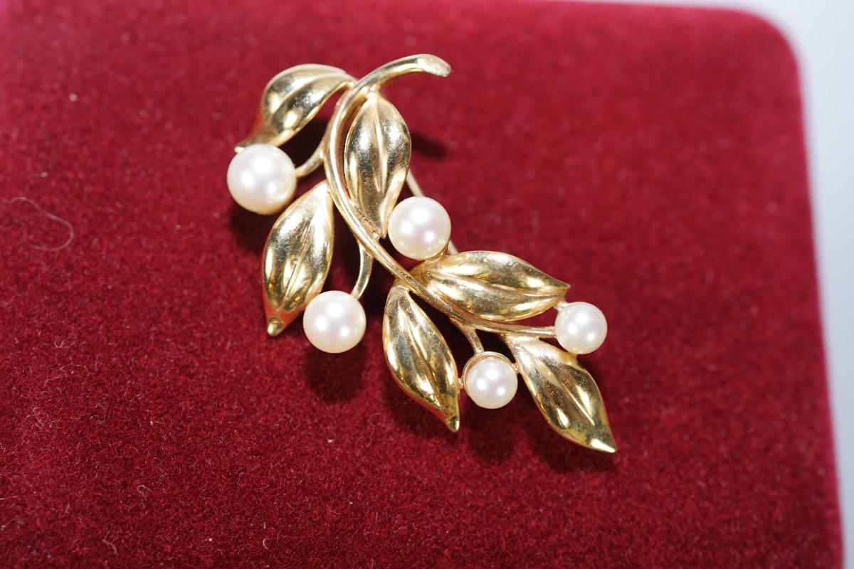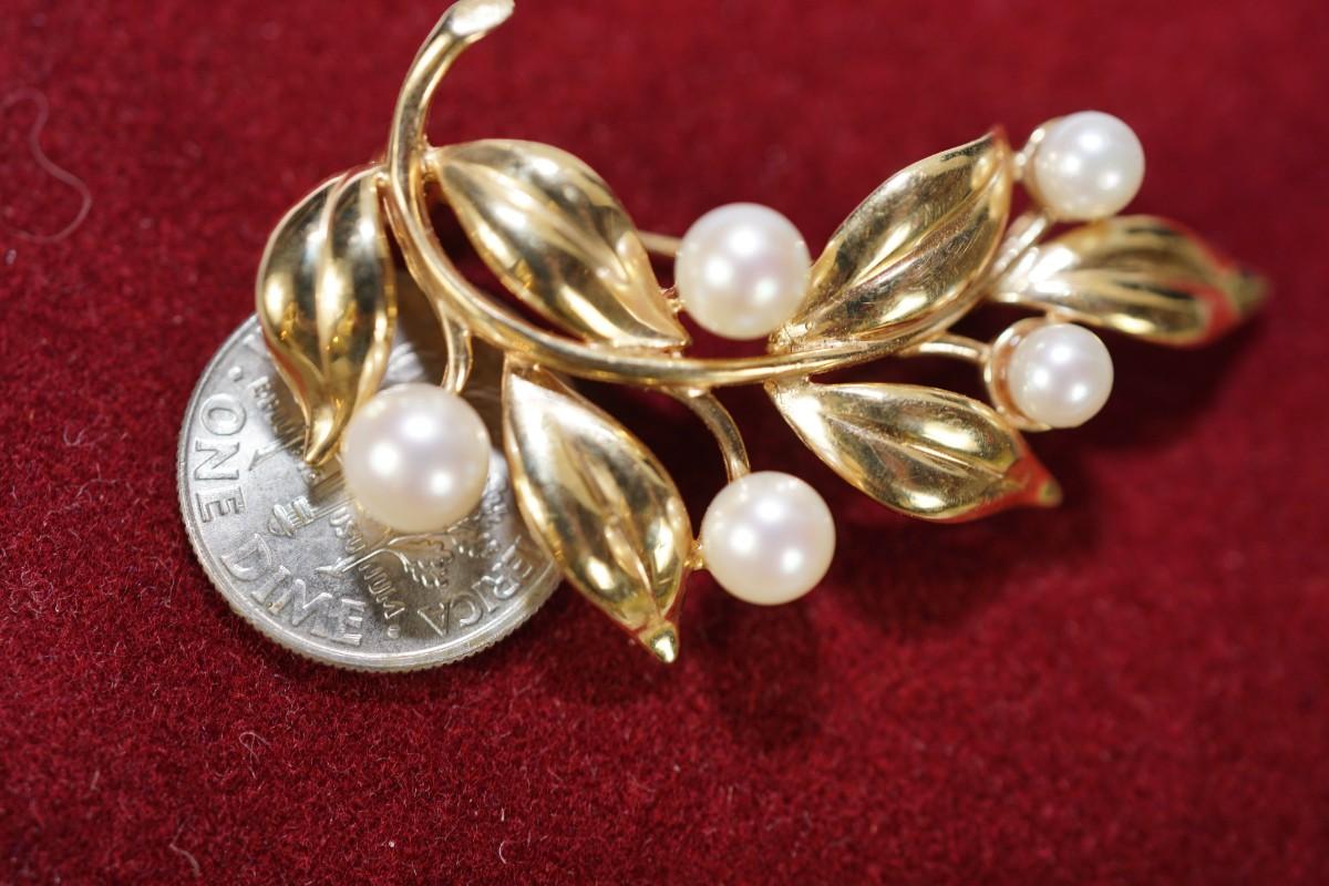 14kt GOLD LEAF PIN WITH FIVE PEARLS OF VARIOUS SIZES