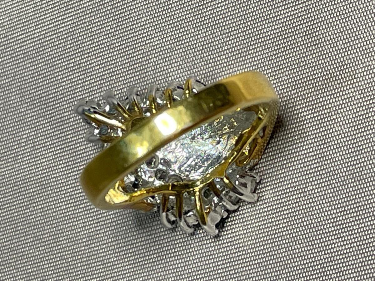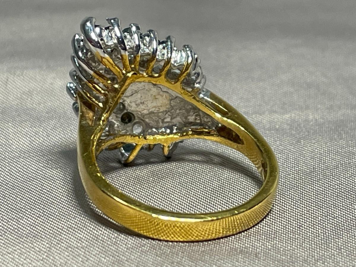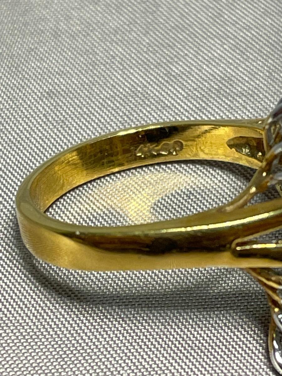 This is a lovely ring that is in excellent condition and about a size 8-8.25. The interior is stamped 14K GP and all of the stones appear to be securely intact.