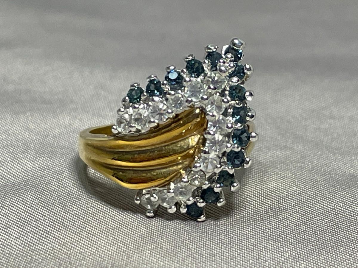 14KT GP Costume Ring with Blue and Clear Rhinestones
