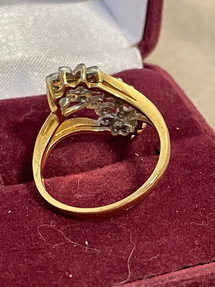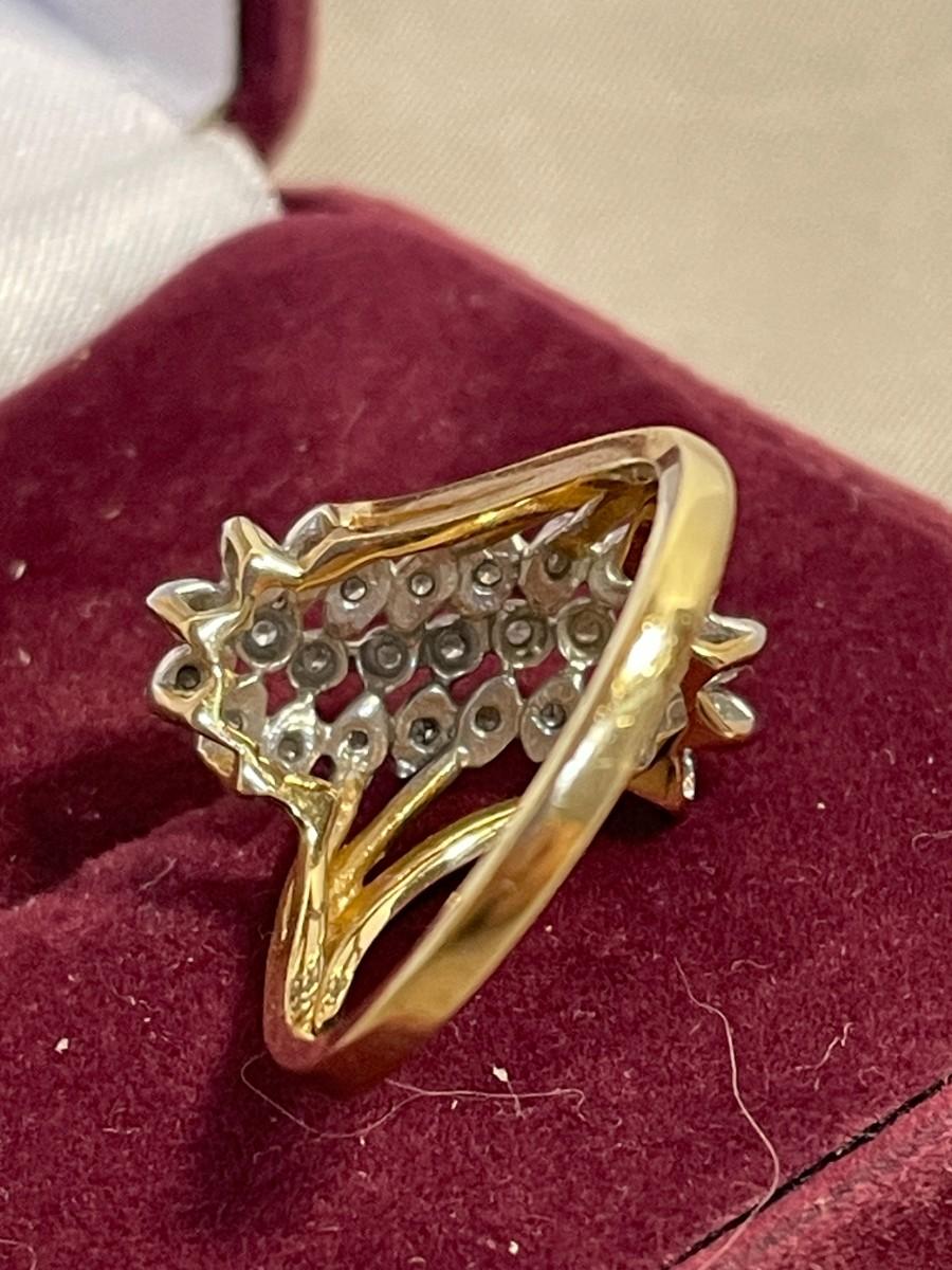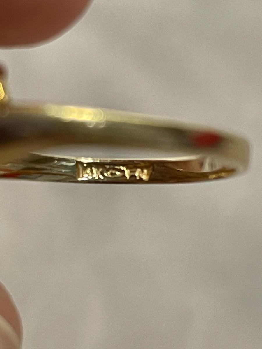 This ring is made of 14kt yellow gold and white gold and filled with 27 diamonds chips (they tested positive for diamonds). There do not appear to be any issues with this ring and it appears to have been barely worn. It is about a size 7 and circa 1960s. The ring weighs about 3.56 grams the length of the diamond spread is about 0.75 inches long. The ring was made by Finberg Manufacturing Company.