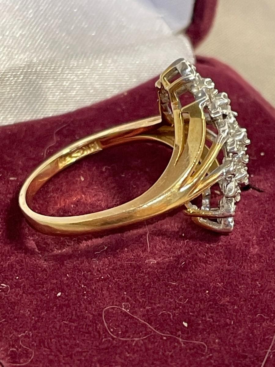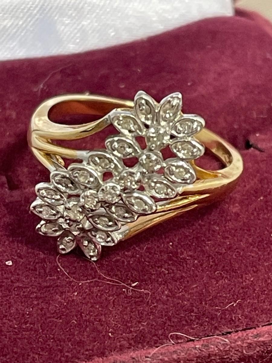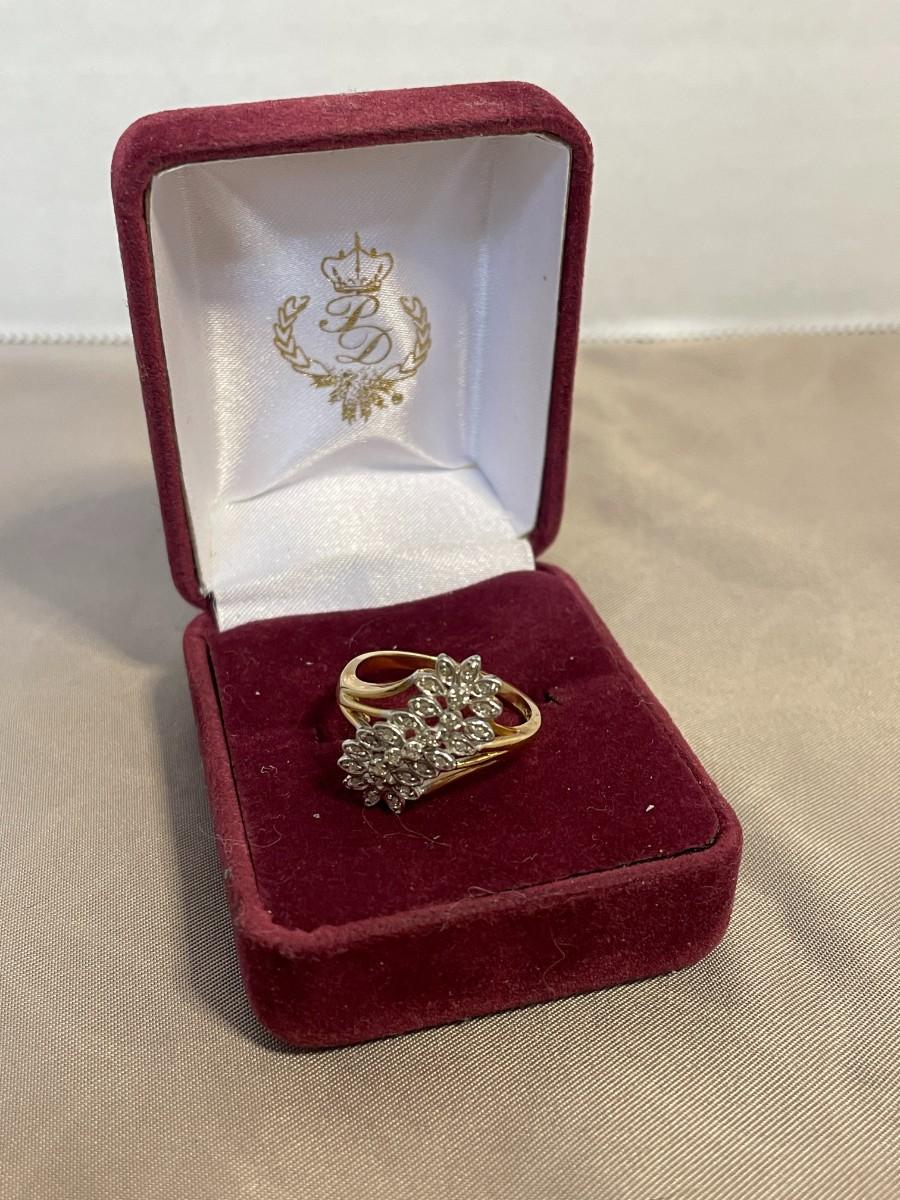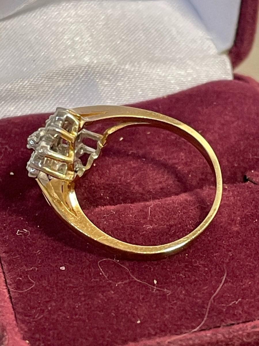 This ring is made of 14kt yellow gold and white gold and filled with 27 diamonds chips (they tested positive for diamonds). There do not appear to be any issues with this ring and it appears to have been barely worn. It is about a size 7 and circa 1960s. The ring weighs about 3.56 grams the length of the diamond spread is about 0.75 inches long. The ring was made by Finberg Manufacturing Company.