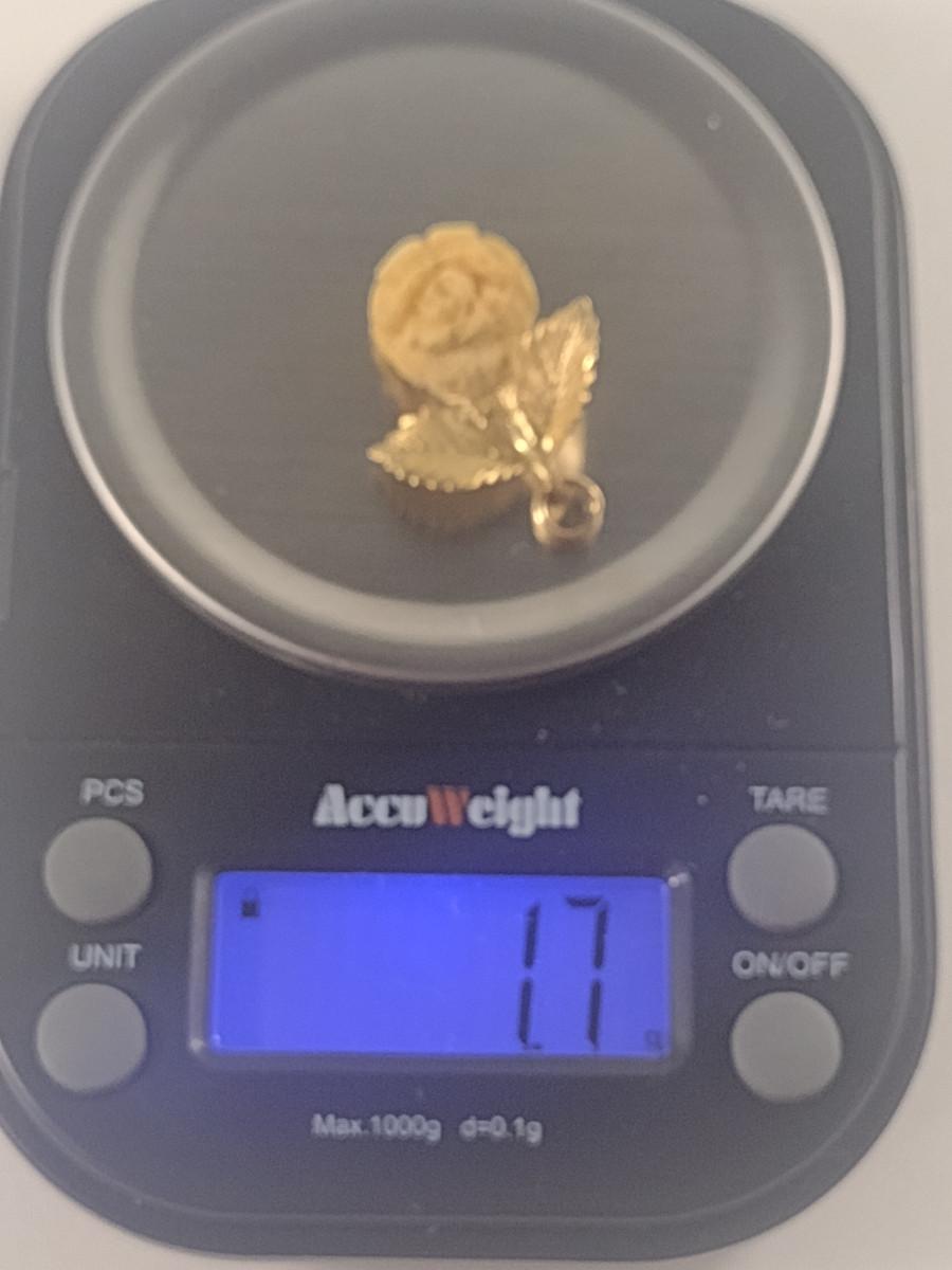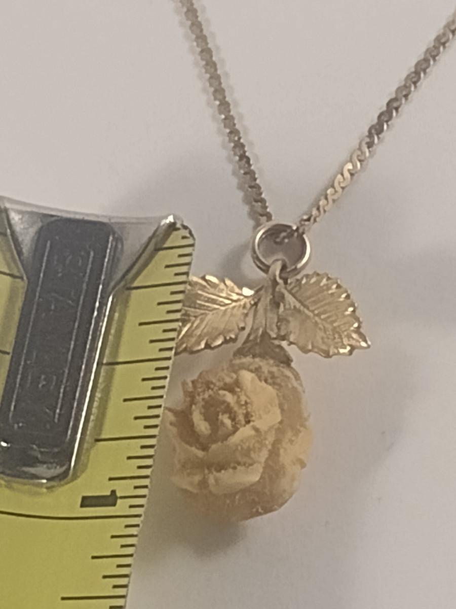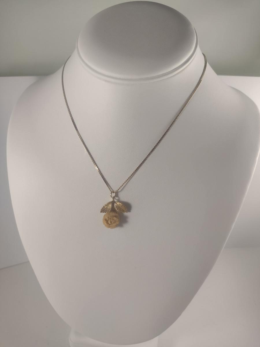 14Kt Yellow Gold Necklace with Rose Pendant- Approx Weight 2.1 Grams (#11). Pendant is marked 14K, but only the leaf portion of the pendant is gold. The weight of the entire pendant is 1.7 Grams. The chain has an approximate weight of 2.1 Grams.