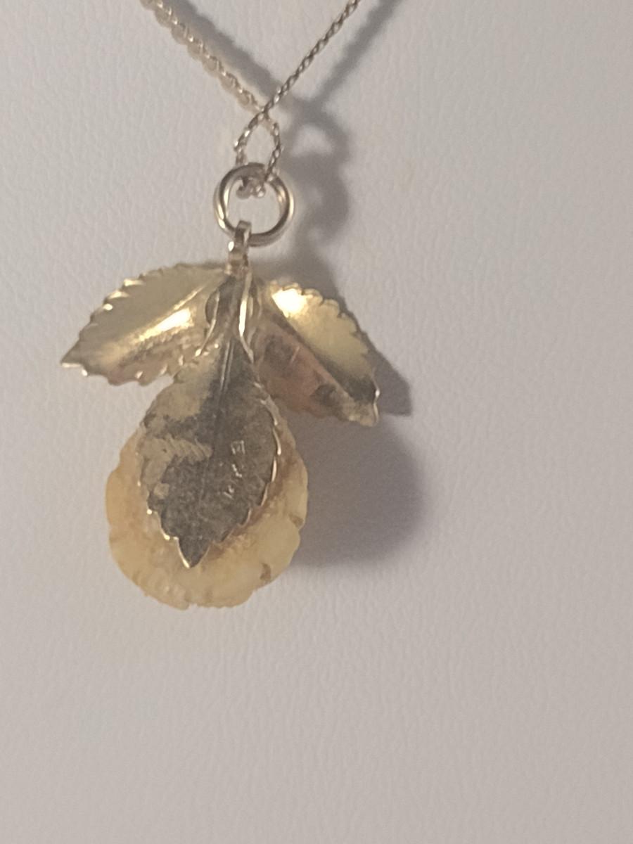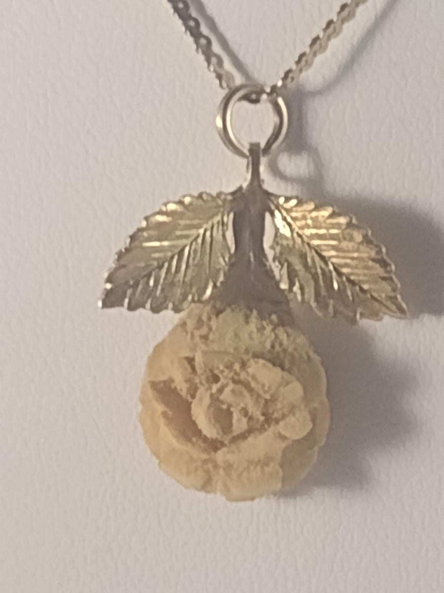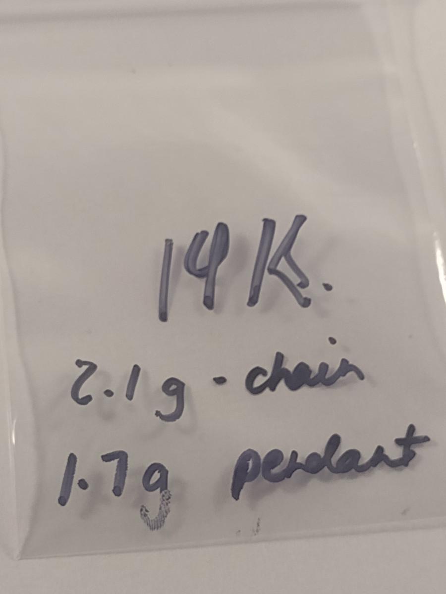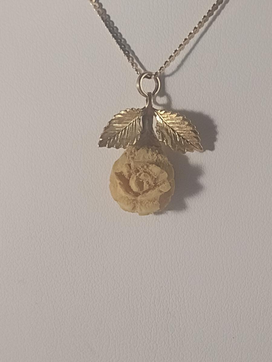 14Kt Yellow Gold Necklace with Rose Pendant- Approx Weight 2.1 Grams (#11). Pendant is marked 14K, but only the leaf portion of the pendant is gold. The weight of the entire pendant is 1.7 Grams. The chain has an approximate weight of 2.1 Grams.
