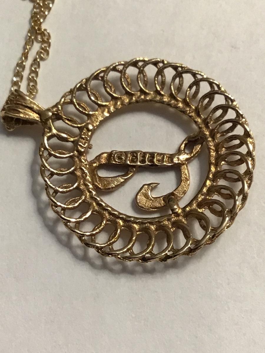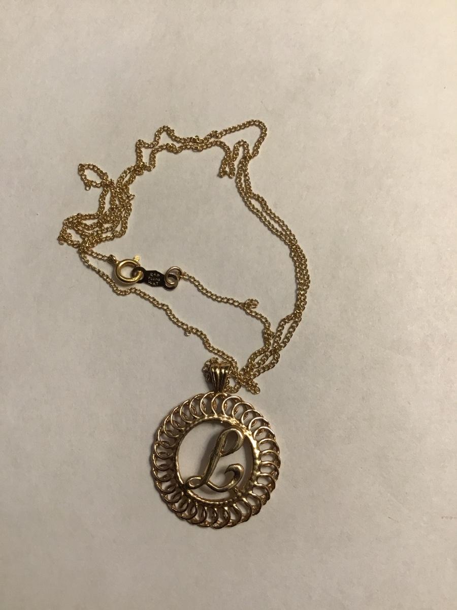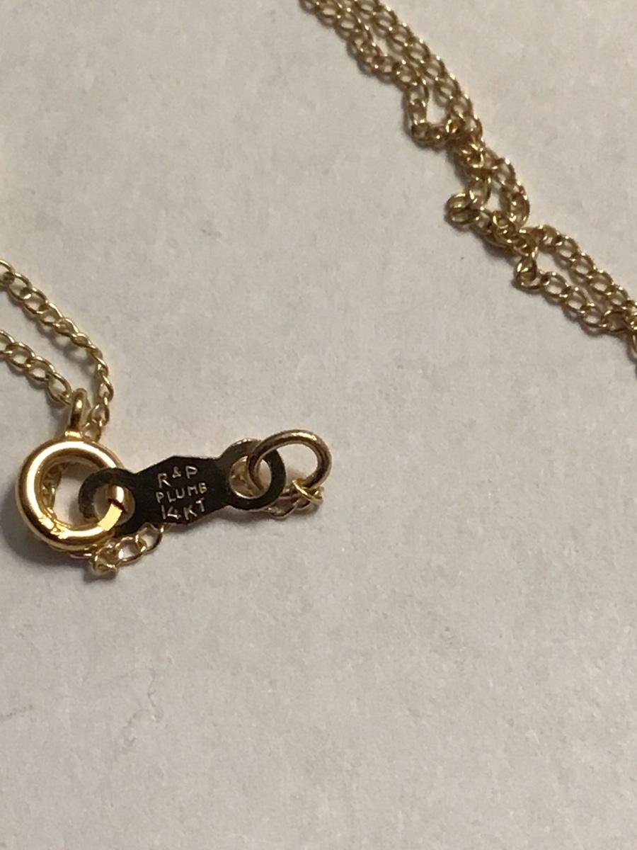 Marked 14Kt on chain weighs 2.3 grams, necklace hangs down 8-1/2”