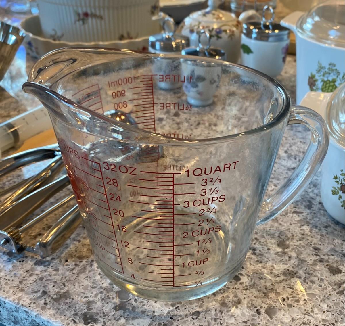 1.5 and 3 Qt Harvest Vegetable Corning Ware Casserole with Lids.   4 cup pyrex measuring cup.
