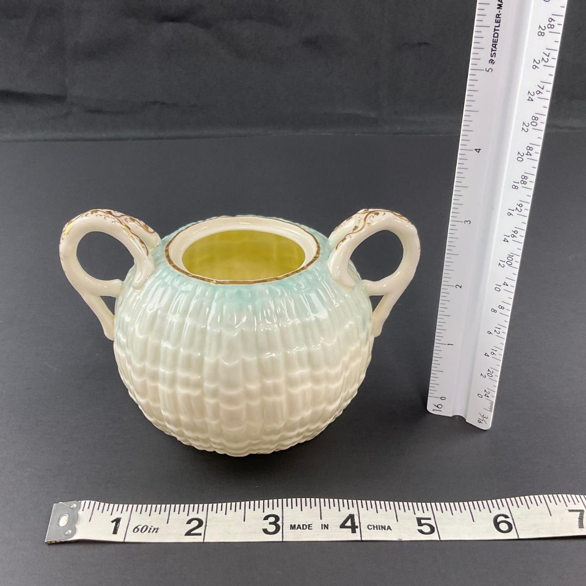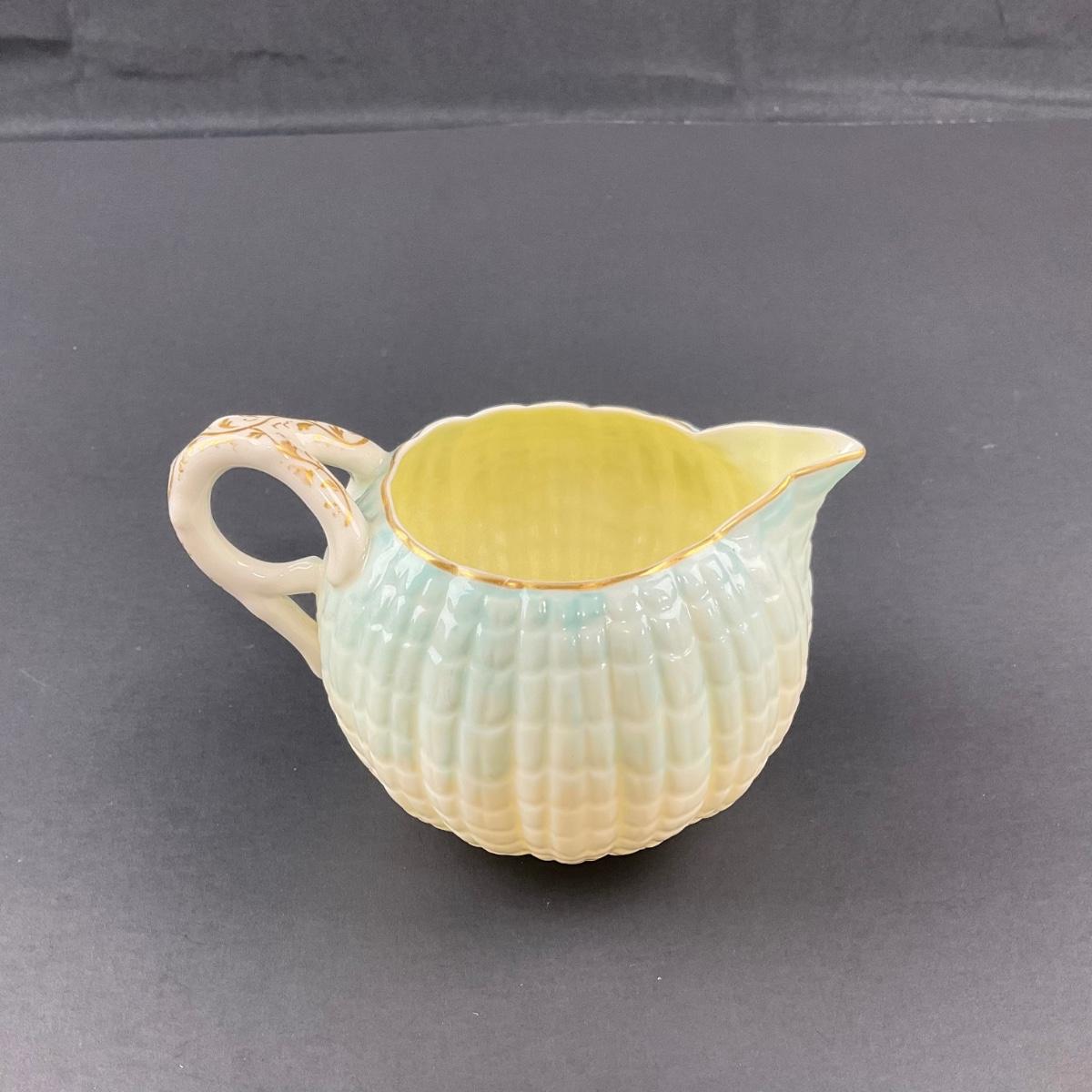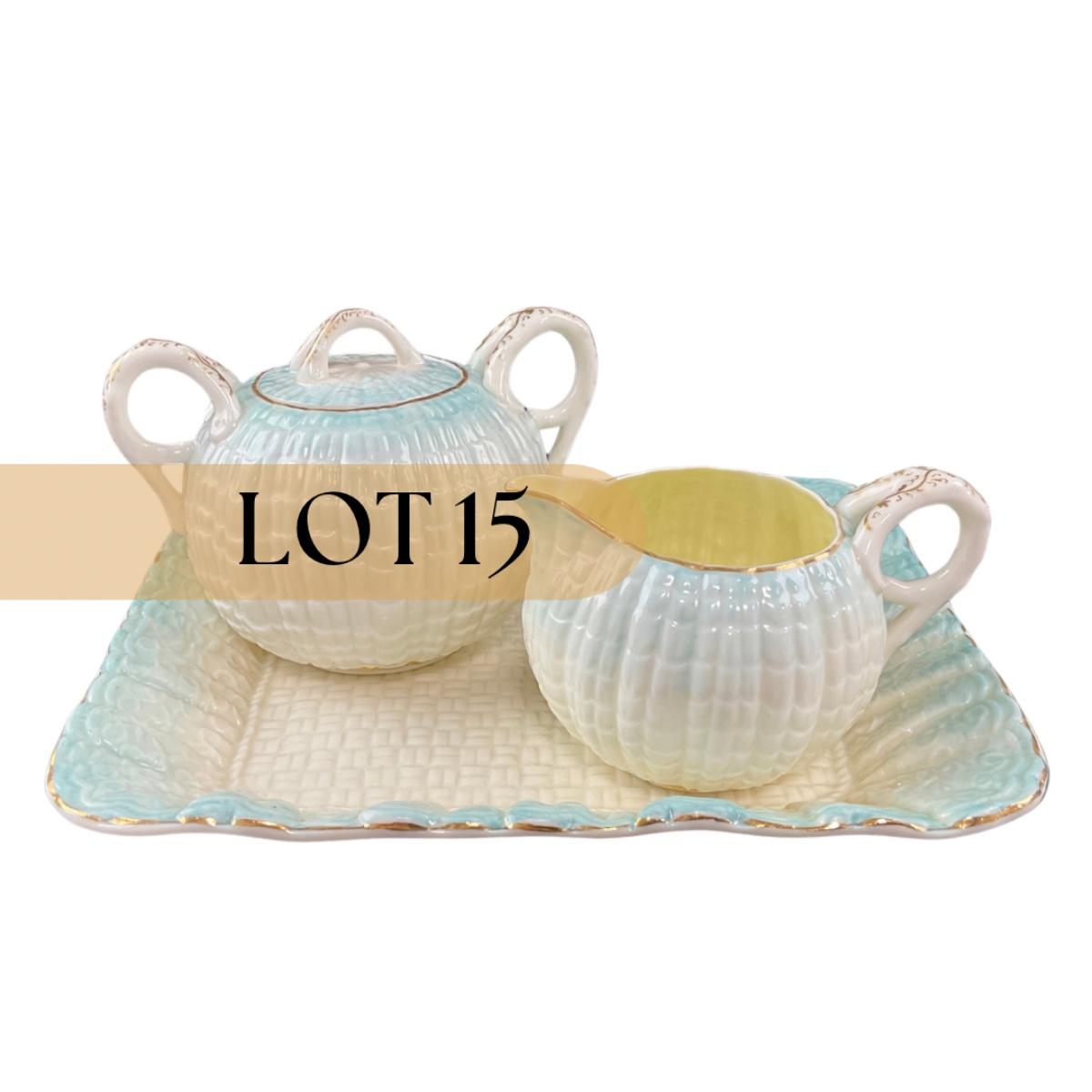 Four pieces total of what is believed to be Blue Neptune Belleek. The covered sugar and creamer have older 1890’s makers marks and the tray has a newer Belleek 6th mark. All pieces have no damage, and appear to be in great shape with no visable chips, cracks, or broken pieces. Please see photos for details and condition. Any condition statement is given as a courtesy to a client, is an opinion, and should not be treated as a statement of fact. Reference to condition written, oral or within a condition report shall not be regarded as a full account of condition and may not include all defects, alterations, or restorations. Absence of a condition report does not imply a lot is flawless or lacking imperfections or damage. Katherine’s Auction & Appraisal Service shall have no responsibility for any error or omission. Returns shall not be accepted on the basis of condition. ::: Shipping is available on this lot. If you require shipping you must let us know at the close of the auction. We will coordinate with you after the item has been won. Shipping fees will include insurance up to or exceeding the value of all items being mailed. If you have any questions regarding this lot please contact the auctioneer either via this website, by direct email or by phone. PICK UP TIMES and other important information can be found in the TERMS and DESCRIPTION of the auction. Please take a look for pertinent information. Thanks!