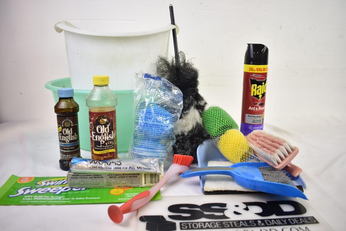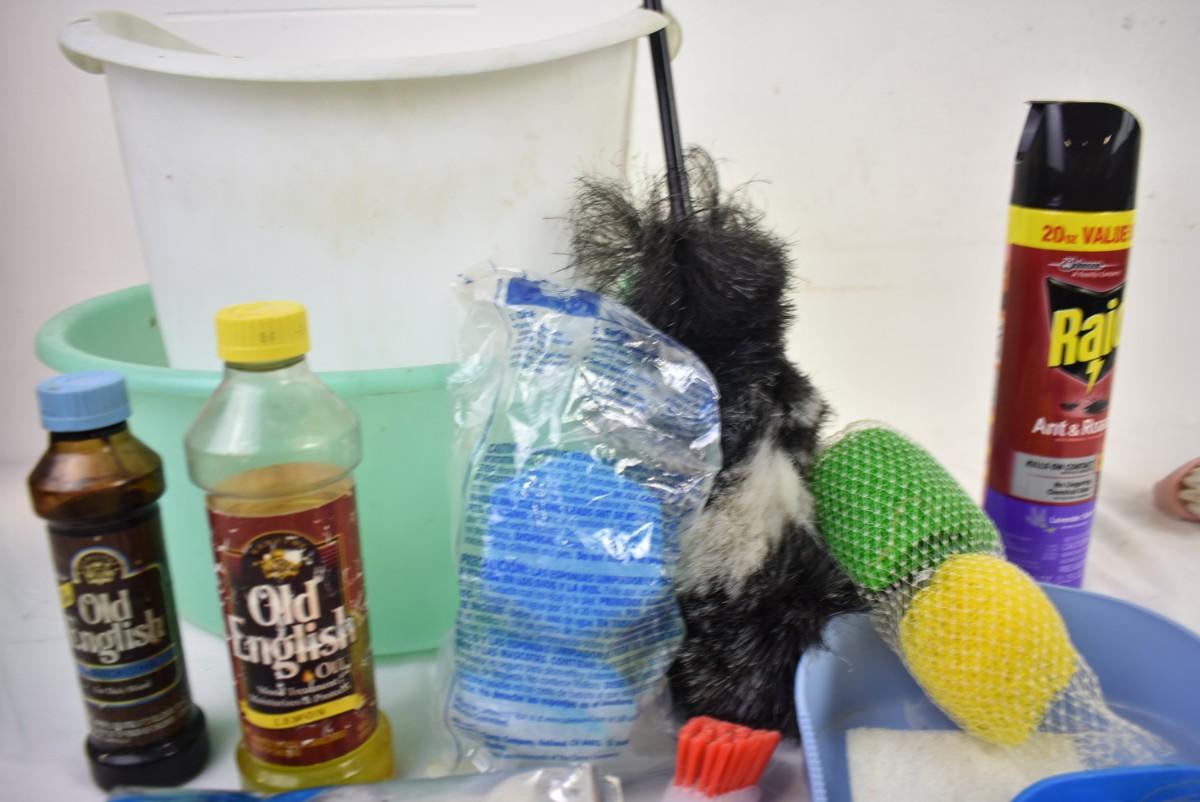 15 pc Cleaning Supplies and Plastic Buckets: Old English Wood Cleaner, Raid, Dustpan, etc