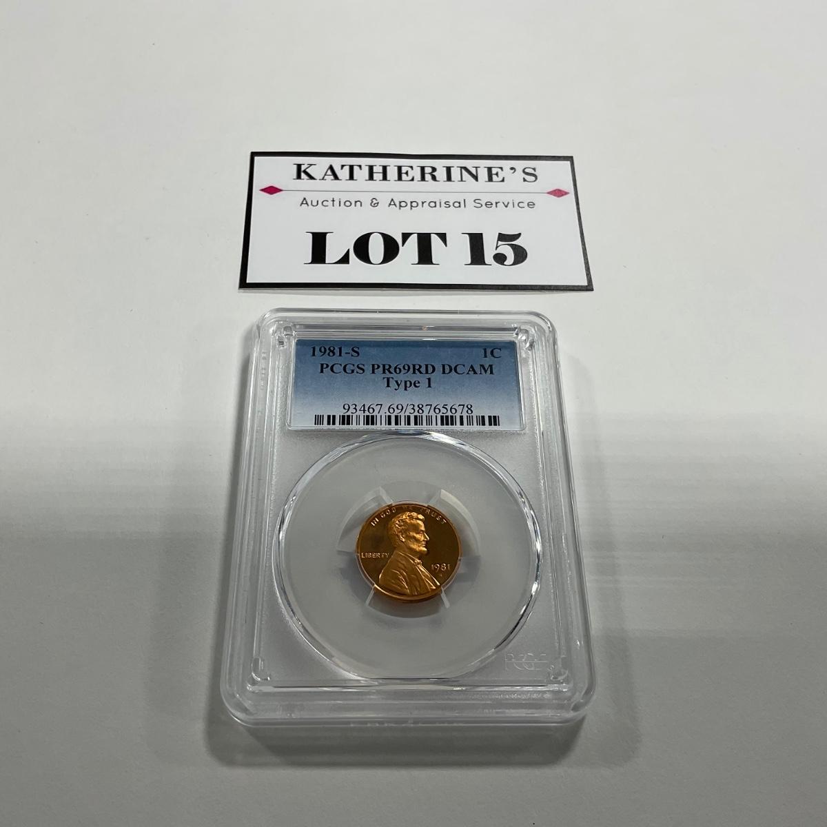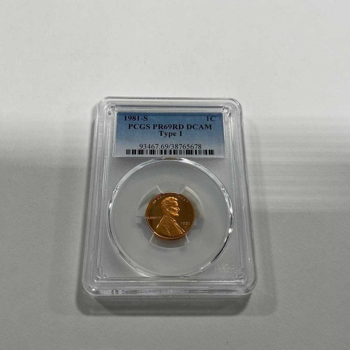 One 1981-S Lincoln cent PCGS PR69RD DCAM type 1 coin graded. Please see photos for details and condition. ::: Shipping is available on this lot. If you require shipping you must let us know at the close of the auction. We will coordinate with you after the item has been won. Shipping fees will include insurance up to or exceeding the value of all items being mailed. If you have any questions regarding this lot please contact the auctioneer either via this website, by direct email or by phone. PICK UP TIMES and other important information can be found in the TERMS and DESCRIPTION of the auction. Please take a look for pertinent information. Thanks!
