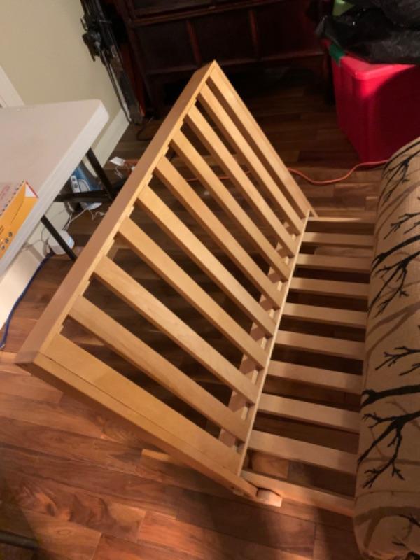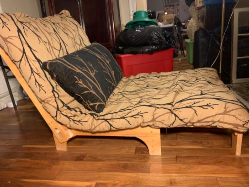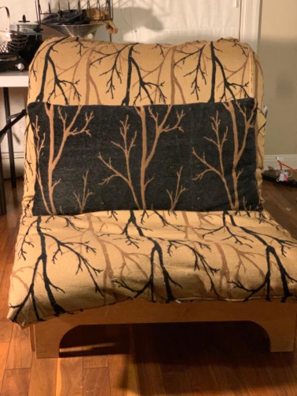 Twin Futon Frame With Futon and Cushion. 37” x 78” laid out. Cover is removable. Bottom half slides under to turn into chair.