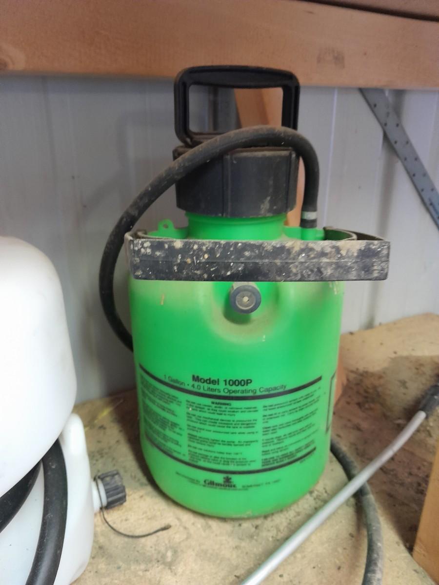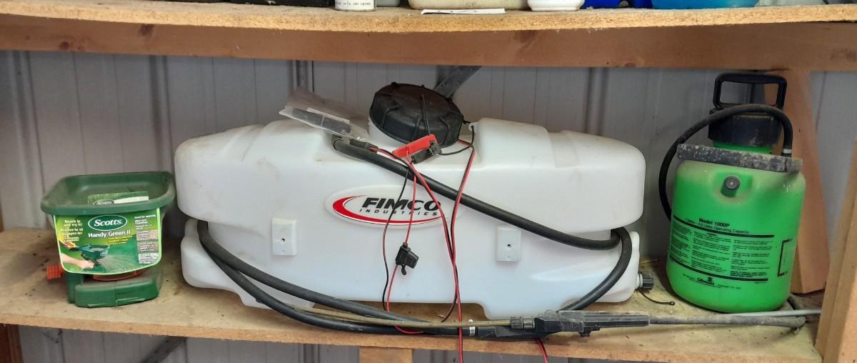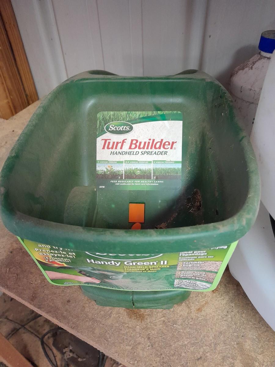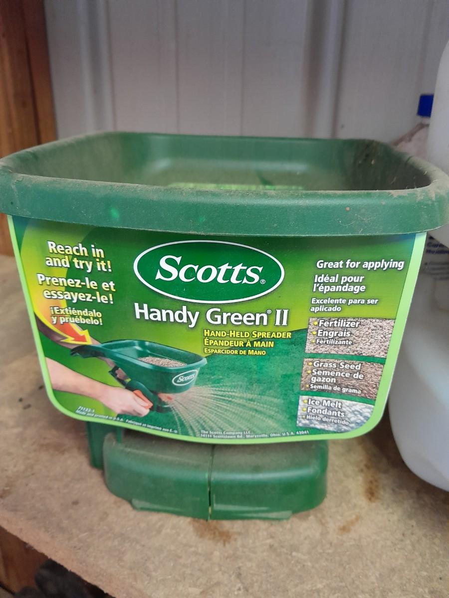 SCOTTS HANDY GREEN 2 HAND-HELP SPREADER, 15 GALLON FIMCO SPRAYER TANK, AND HAND-HELP 1 GALLON MODEL 1000P SPRAYER