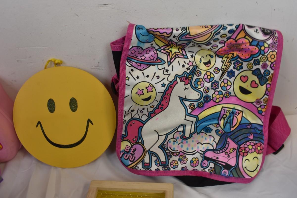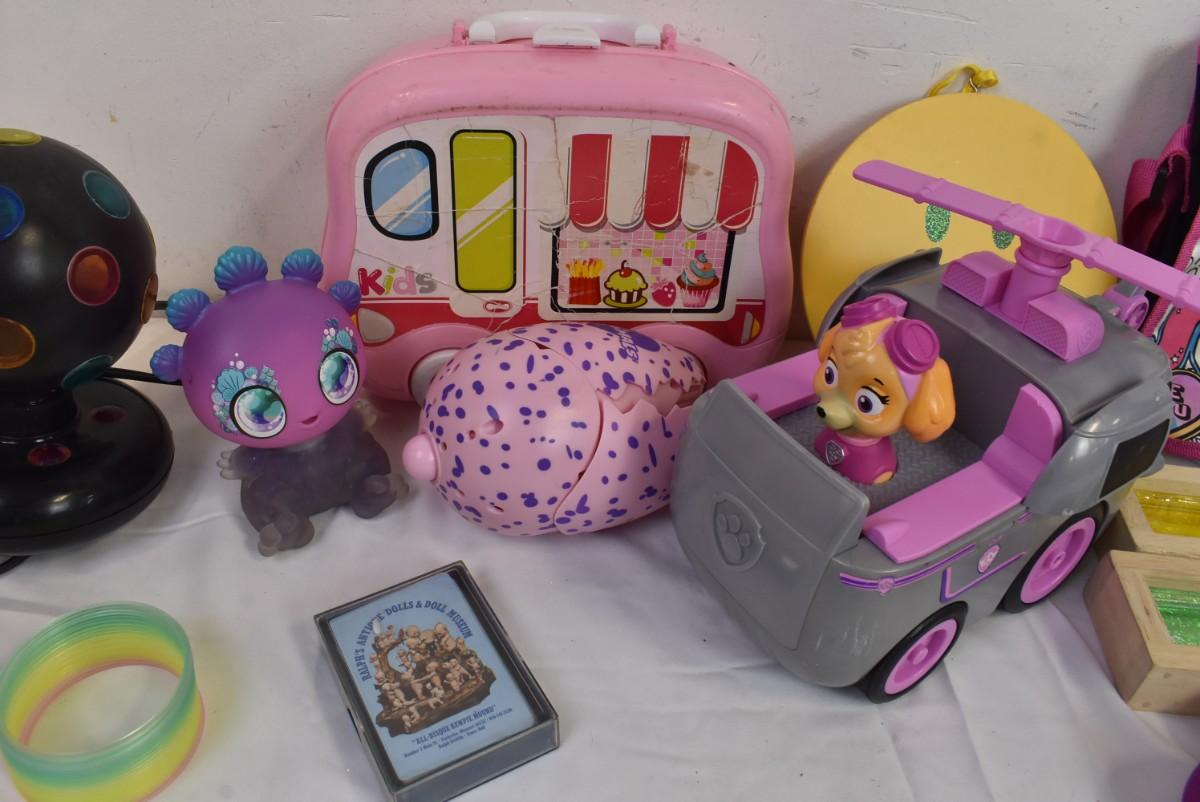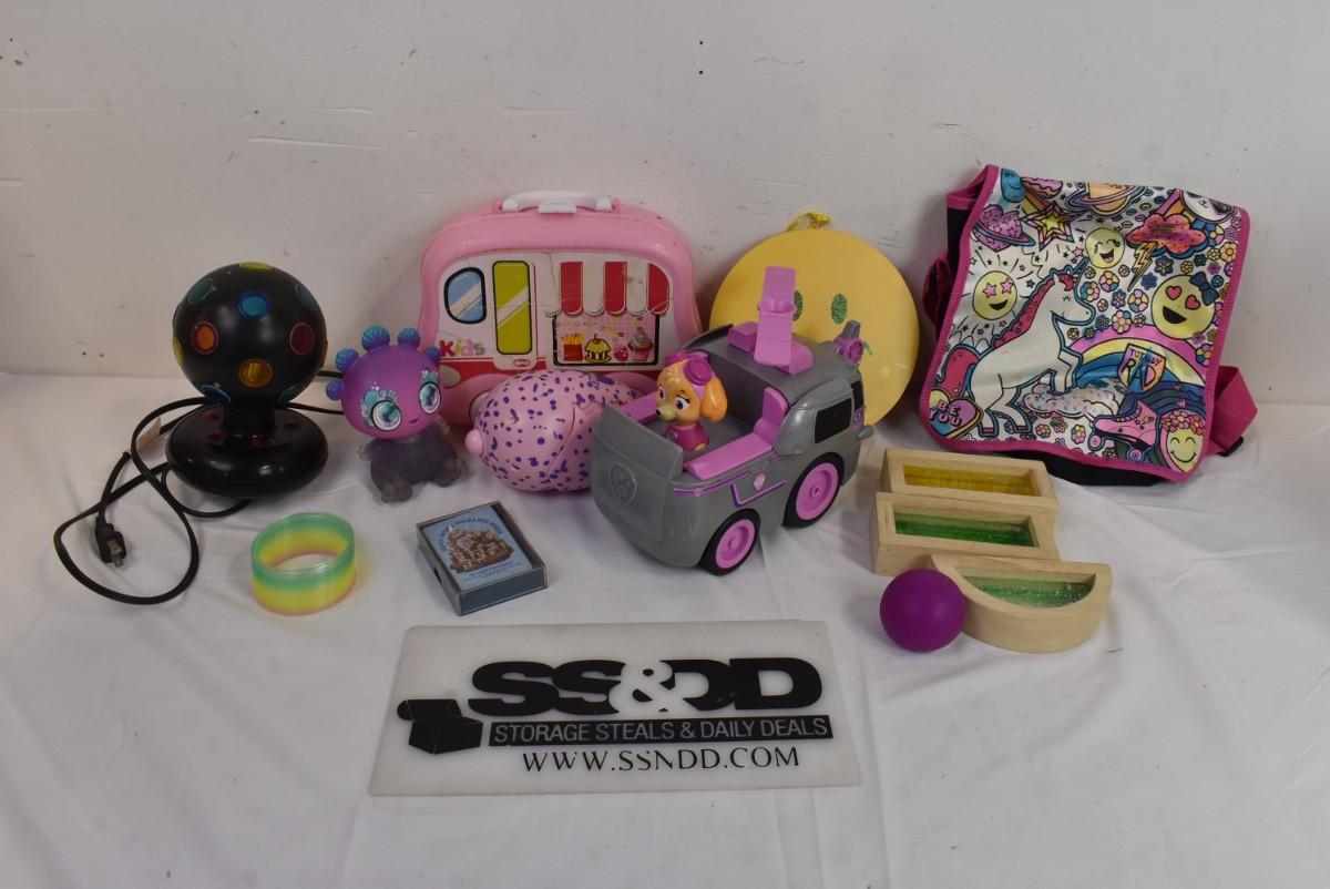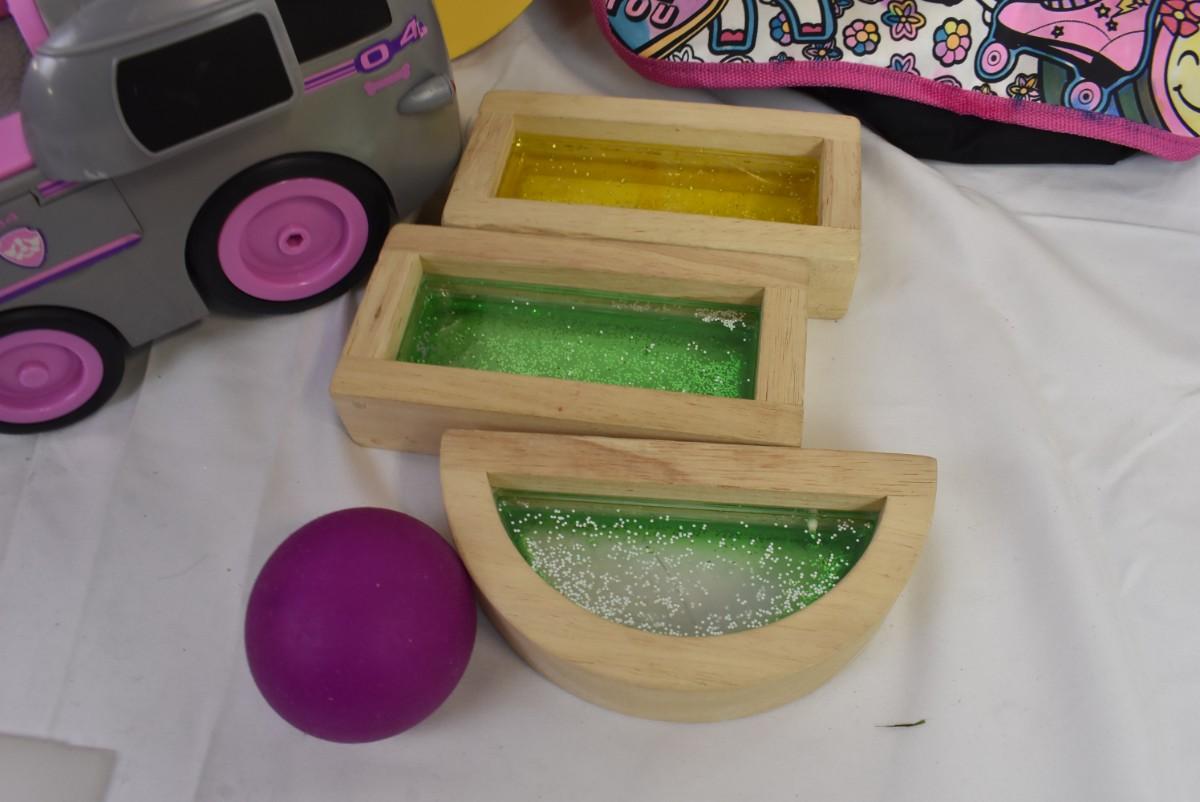 15 Item Kid Toy Lot: Disco Ball, Slinky, Wood Blocks, Squish Ball, Purse