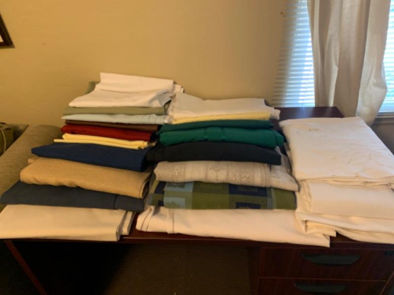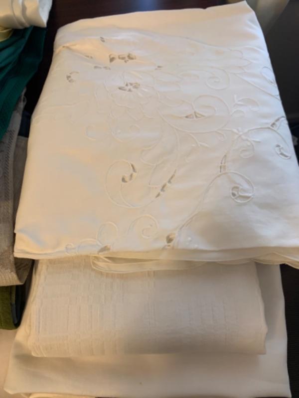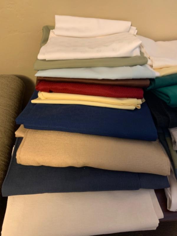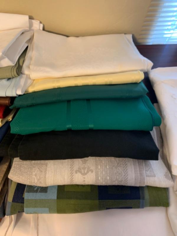 15. Large collection (18 pieces) of table linens (up to 108” in length) in assorted colors and fabrics