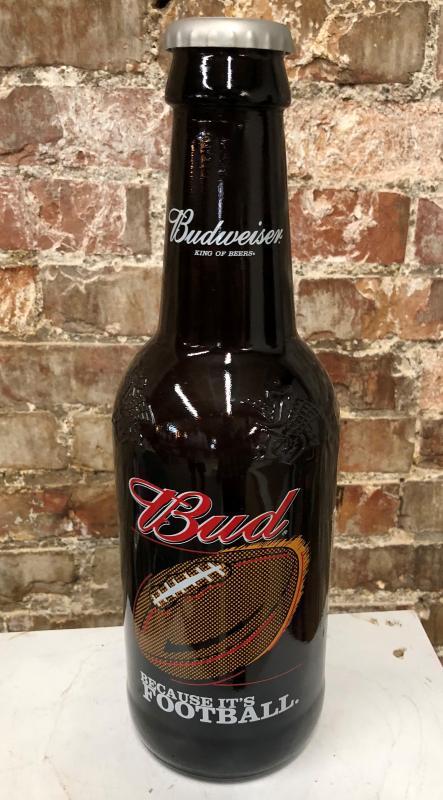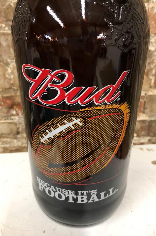 Excellent condition on this football promotional piece..This novelty glass bottle for Bud beer stands 15" tall...Removable plastic cap...