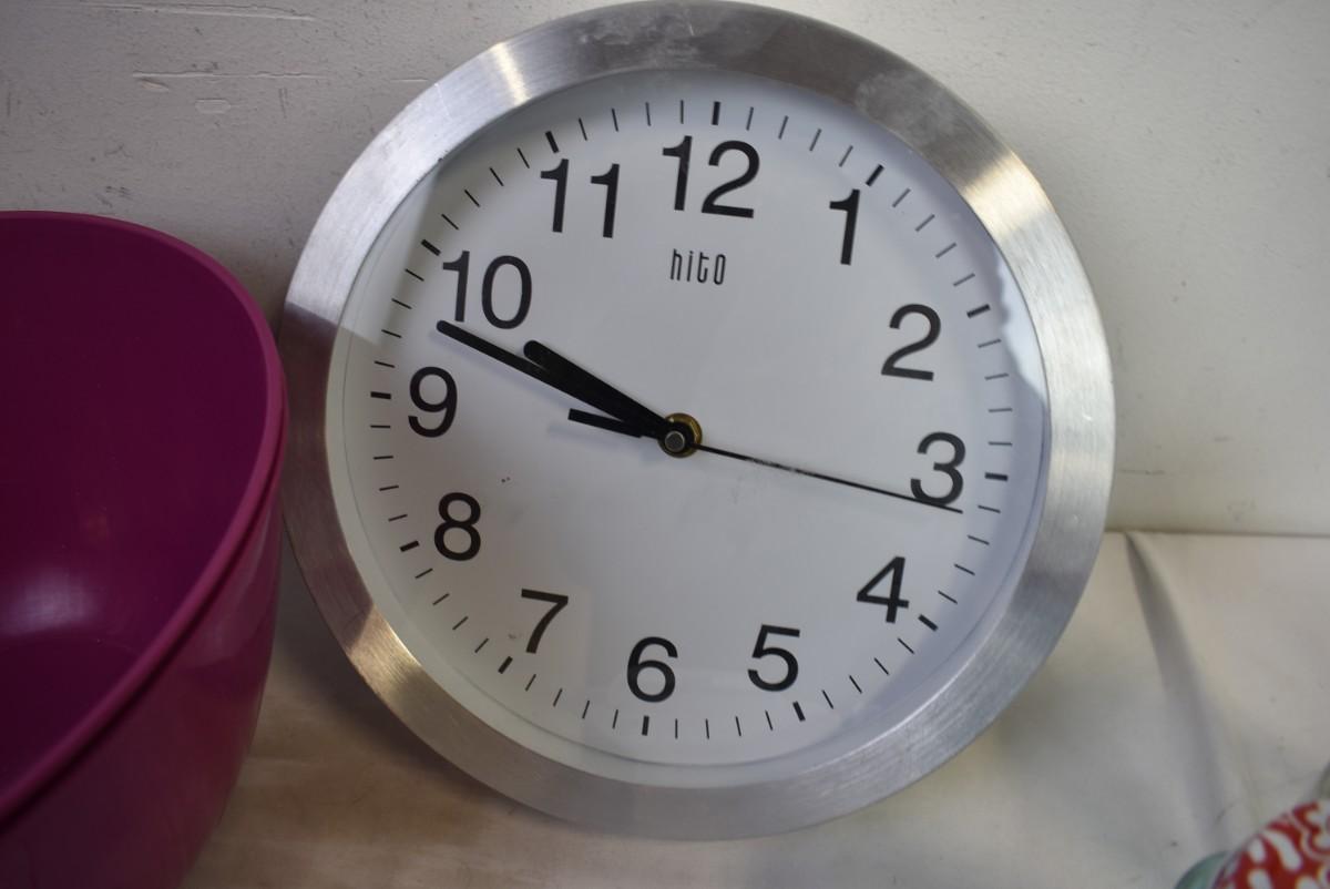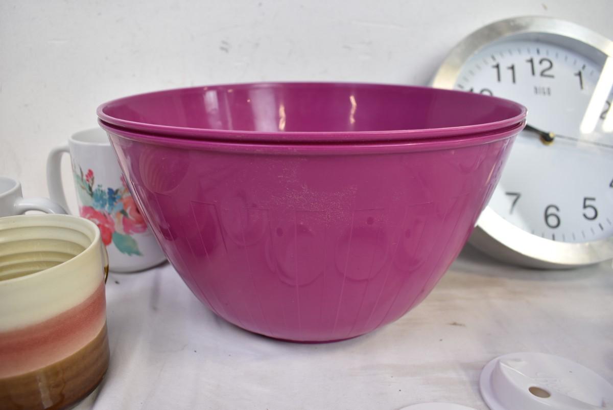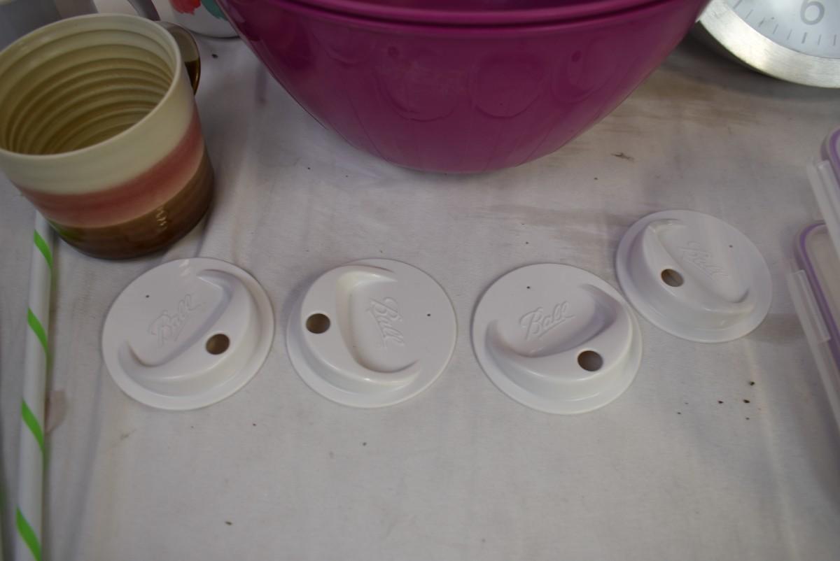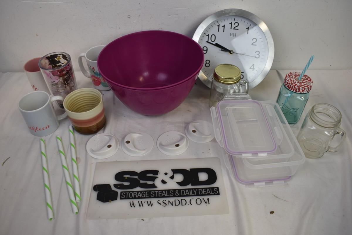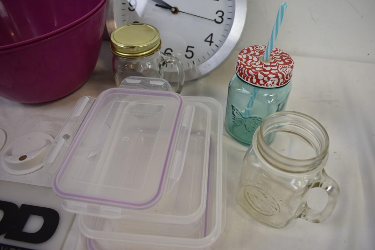 15 pc Kitchen: Mugs, Bowls, Clock, Canning Jars,