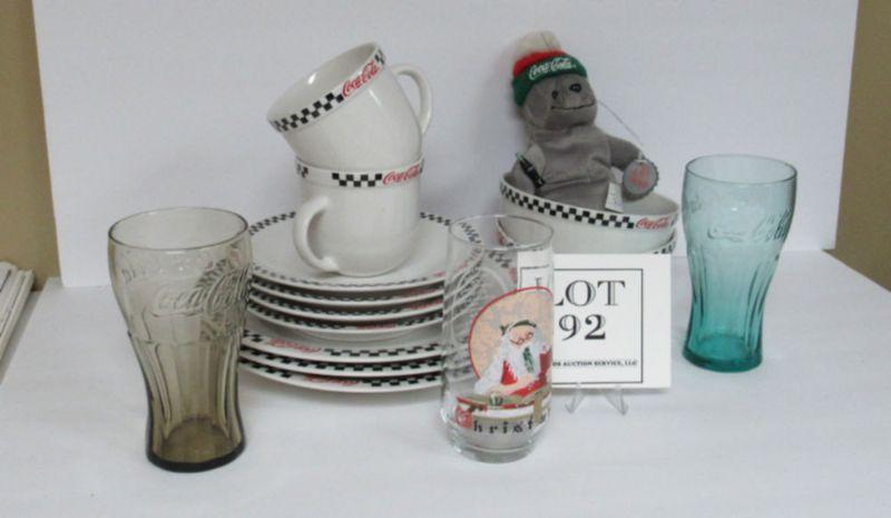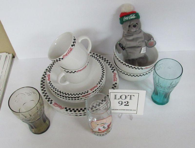 15 Pc Lot of Misc Coca Cola Stuff, Plates, Bowls, Cups, Tumblers, Stuffed Guy
