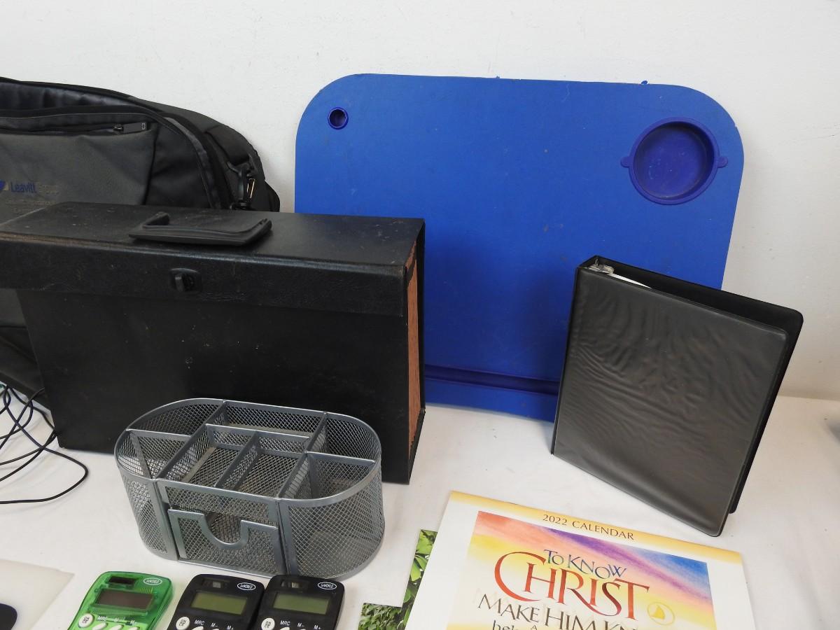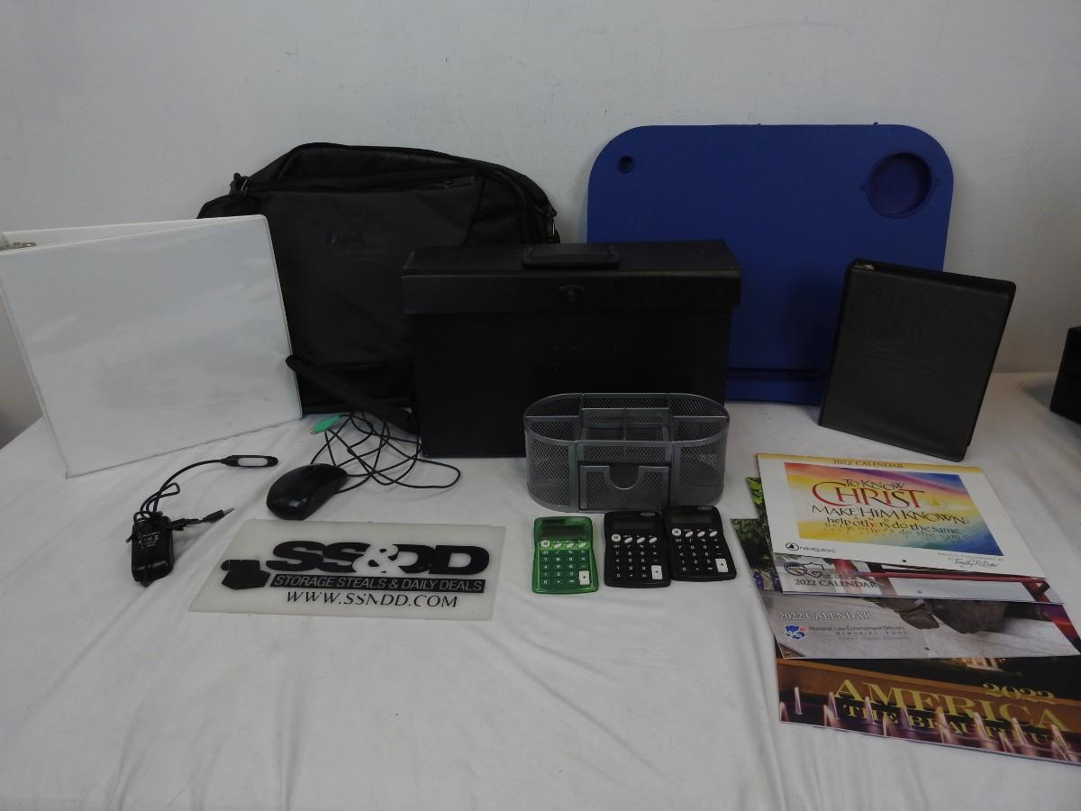15 pc School/OfficeLot: Lap Desk, Laptop Bag, Binders, Calculators, Mouse, Clip Light, Calendars