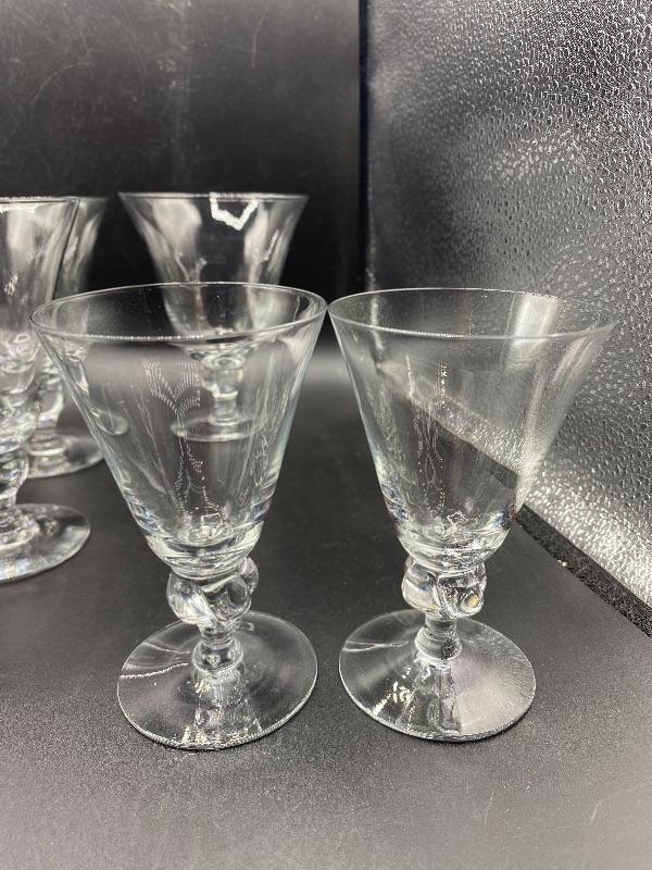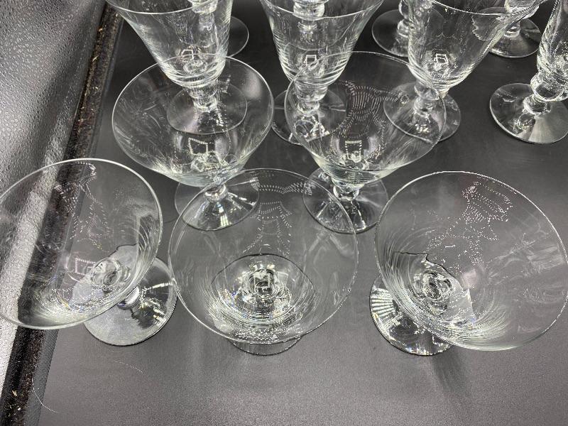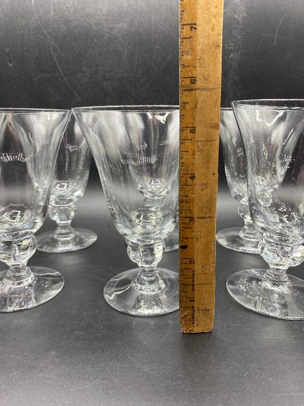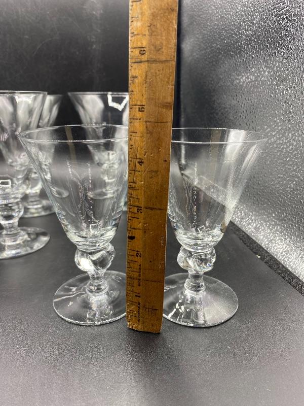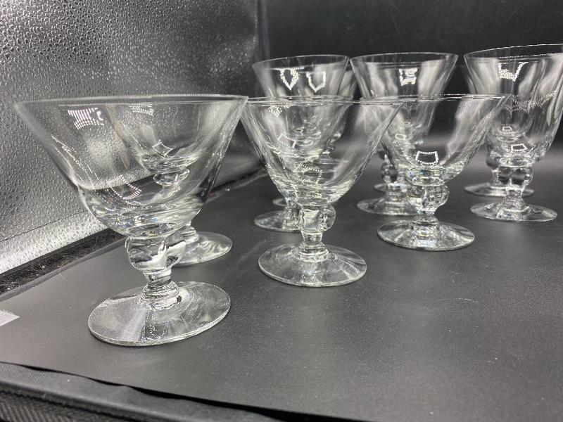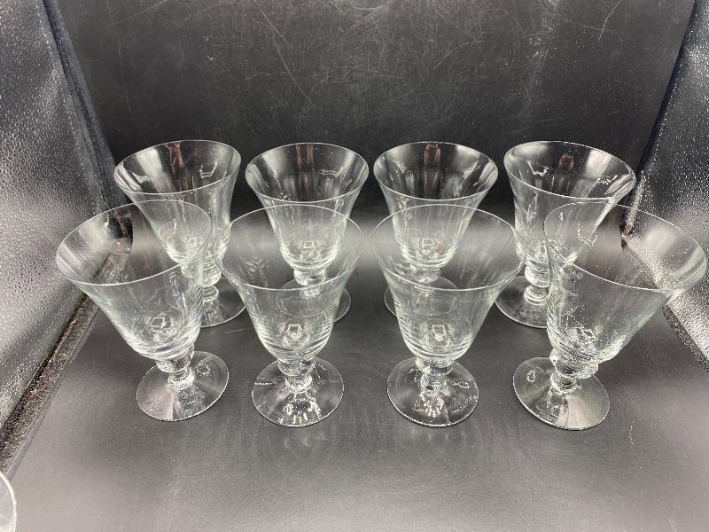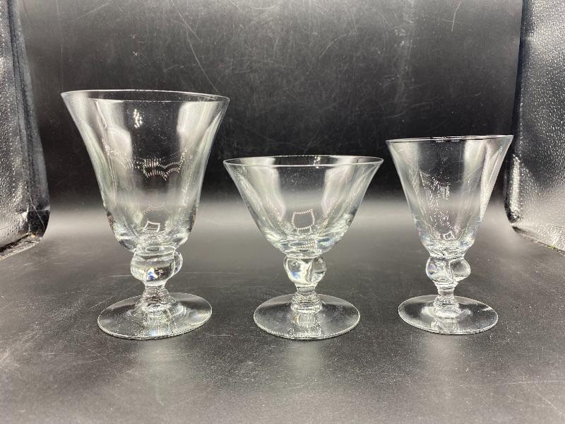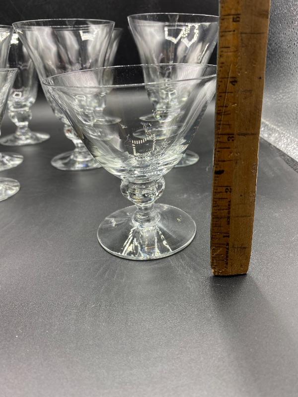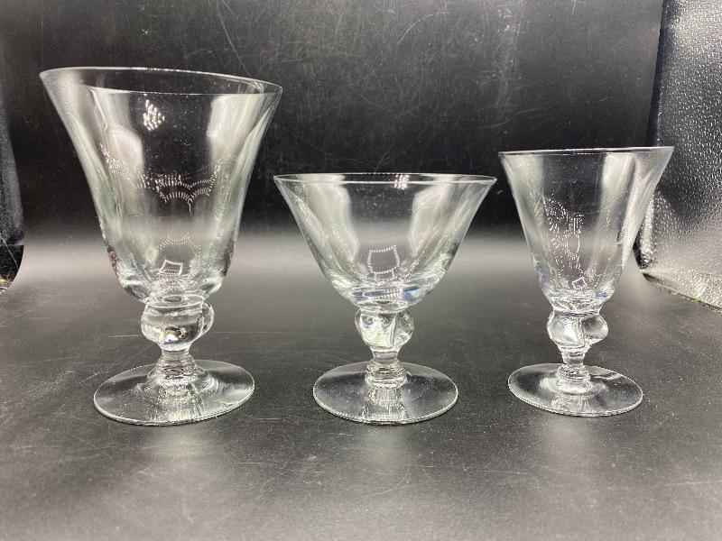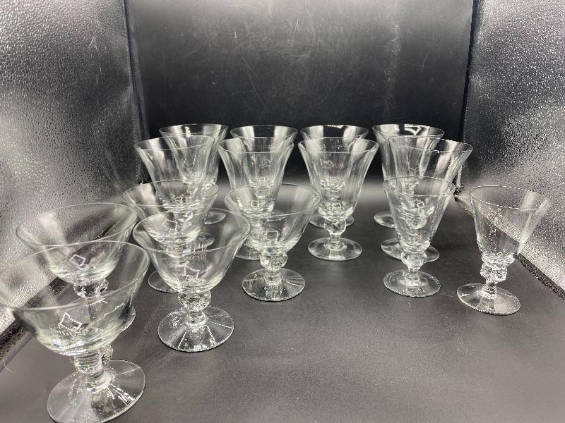 15 piece goblet style drink glasses. Three different sizes. 8 -- 5.5" water glasses, 5 -- 4" sherbet glasses, and 2 -- 4.5" cordial/juice glasses. Thin glass. Great for any occasion.